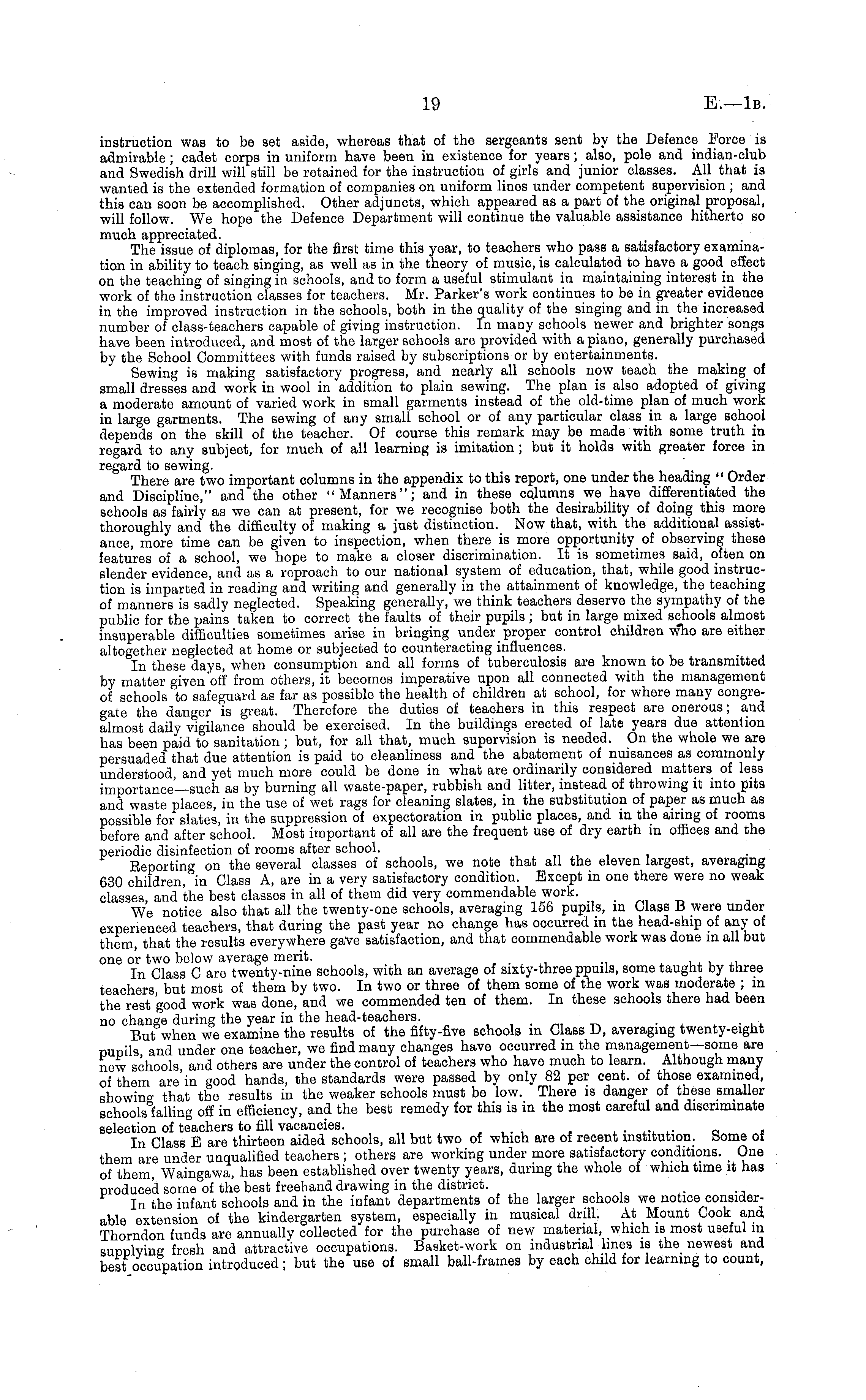 instruction was to be set aside, whereas that of the sergeants sent by the Defence Force is admirable; cadet corps in uniform have been in existence for years; also, pole and indian-club and Swedish drill will still be retained for the instruction of girls and junior classes. All that is wanted is the extended formation of companies on uniform lines under competent supervision ; and this can soon be accomplished. Other adjuncts, which appeared as a part of the original proposal, will follow. We hope the Defence Department will continue the valuable assistance hitherto so much appreciated. The issue of diplomas, for the first time this year, to teachers who pass a satisfactory examination in ability to teach singing, as well as in the theory of music, is calculated to have a good effect on the teaching of singing in schools, and to form a useful stimulant in maintaining interest in the work of the instruction classes for teachers. Mr. Parker's work continues to be in greater evidence in the improved instruction in the schools, both in the quality of the singing and in the increased number of class-teachers capable of giving instruction. In many schools newer and brighter songs have been introduced, and most of the larger schools are provided with a piano, generally purchased by the School Committees with funds raised by subscriptions or by entertainments. Sewing is making satisfactory progress, and nearly all schools now teach the making of small dresses and work in wool in addition to plain sewing. The plan is also adopted of giving a moderate amount of varied work in small garments instead of the old-time plan of much work in large garments. The sewing of any small school or of any particular class in a large school depends on the skill of the teacher. Of course this remark may be made with some truth in regard to any subject, for much of all learning is imitation ; but it holds with greater force in regard to sewing. There are two important columns in the appendix to this report, one under the heading " Order and Discipline," and the other "Manners"; and in these columns we have differentiated the schools as fairly as we can at present, for we recognise both the desirability of doing this more thoroughly and the difficulty of making a just distinction. Now that, with the additional assistance, more time can be given to inspection, when there is more opportunity of observing these features of a school, we hope to make a closer discrimination. It is sometimes said, often on slender evidence, and as a reproach to our national system of education, that, while good instruction is imparted in reading and writing and generally in the attainment of knowledge, the teaching of manners is sadly neglected. Speaking generally, we think teachers deserve the sympathy of the public for the pains taken to correct the faults of their pupils ; but in large mixed schools almost insuperable difficulties sometimes arise in bringing under proper control children w*ho are either altogether neglected at home or subjected to counteracting influences. In these days, when consumption and all forms of tuberculosis are known to be transmitted by matter given off from others, it becomes imperative upon all connected with the management of schools to safeguard as far as possible the health of children at school, for where many congregate the danger is great. Therefore the duties of teachers in this respect are onerous; and almost daily vigilance should be exercised. In the buildings erected of late years due attention has been paid to sanitation ; but, for all that, much supervision is needed. On the whole we are persuaded that due attention is paid to cleanliness and the abatement of nuisances as commonly understood, and yet much more could be done in what are ordinarily considered matters of less importance—such as by burning all waste-paper, rubbish and litter, instead of throwing it into pits and waste places, in the use of wet rags for cleaning slates, in the substitution of paper as much as possible for slates, in the suppression of expectoration in public places, and in the airing of rooms before and after school. Most important of all are the frequent use of dry earth in offices and the periodic disinfection of rooms after school. Reporting on the several classes of schools, we note that all the eleven largest, averaging 630 children, in Class A, are in a very satisfactory condition. Except in one there were no weak classes, and the best classes in all of them did very commendable work. We notice also that all the twenty-one schools, averaging 156 pupils, in Class B were under experienced teachers, that during the past year no change has occurred in the head-ship of any-of them, that the results everywhere gave satisfaction, and that commendable work was done in all but one or two below average merit. ..,,-. •, ~.,., In Class C are twenty-nine schools, with an average of sixty-three ppuils, some taught by three teachers but most of them by two. In two or three of them some of the work was moderate ; in the rest good work was done, and we commended ten of them. In these schools there had been no change during the year in the head-teachers. ~.«,'« • , , , But when we examine the results of the fifty-five schools in Class D, averaging twenty-eight pupils and under one teacher, we find many changes have occurred in the management—some are new schools and others are under the control of teachers who have much to learn. Although many of them are'in good hands, the standards were passed by only 82 per cent, of those examined, showing that the results in the weaker schools must be low. There is danger of these smaller schools falling off in efficiency, and the best remedy for this is in the most careful and discriminate selection of teachers to fill vacancies. , • In Class E are thirteen aided schools, all but two of which are of recent institution, borne of them are under unqualified teachers ; others ar