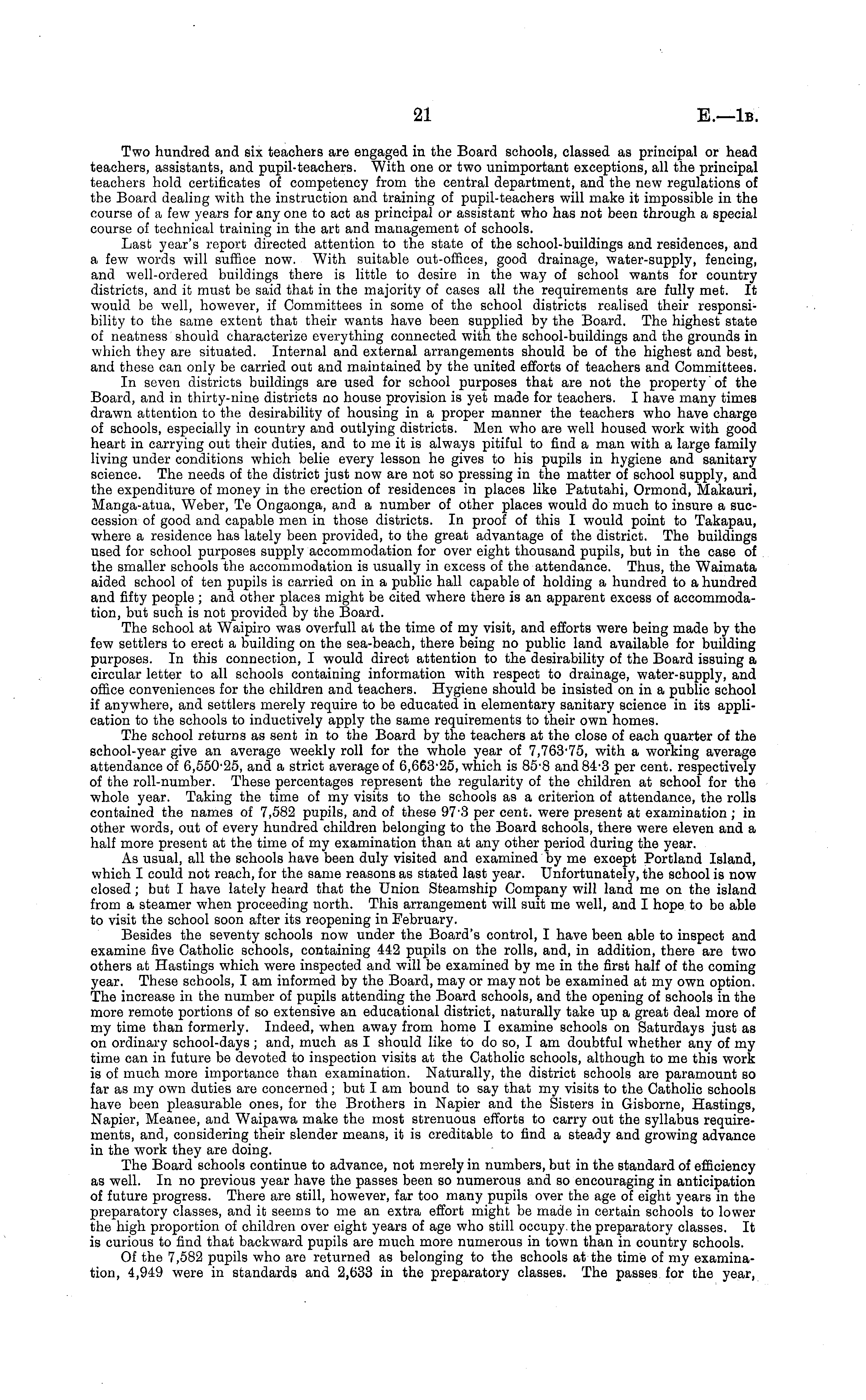Two hundred and six teachers are engaged in the Board schools, classed as principal or head teachers, assistants, and pupil-teachers. With one or two unimportant exceptions, all the principal teachers hold certificates of competency from the central department, and the new regulations of the Board dealing with the instruction and training of pupil-teachers will make it impossible in the course of a few years for any one to act as principal or assistant who has not been through a special course of technical training in the art and management of schools. Last year's report directed attention to the state of the school-buildings and residences, and a few words will suffice now. With suitable out-offices, good drainage, water-supply, fencing, and well-ordered buildings there is little to desire in the way of school wants for country districts, and it must be said that in the majority of cases all the requirements are fully met. It would be well, however, if Committees in some of the school districts realised their responsibility to the same extent that their wants have been supplied by the Board. The highest state of neatness" should characterize everything connected with the school-buildings and the grounds in which they are situated. Internal and external arrangements should be of the highest and best, and these can only be carried out and maintained by the united efforts of teachers and Committees. In seven districts buildings are used for school purposes that are not the property of the Board, and in thirty-nine districts no house provision is yet made for teachers. I have many times drawn attention to the desirability of housing in a proper manner the teachers who have charge of schools, especially in country and outlying districts. Men who are well housed work with good heart in carrying out their duties, and to me it is always pitiful to find a man with a large family living under conditions which belie every lesson he gives to his pupils in hygiene and sanitary science. The needs of the district just now are not so pressing in the matter of school supply, and the expenditure of money in the erection of residences in places like Patutahi, Ormond, Makauri, Manga-atua, Weber, Te Ongaonga, and a number of other places would do much to insure a succession of good and capable men in those districts. In proof of this I would point to Takapau, where a residence has lately been provided, to the great advantage of the district. The buildings used for school purposes supply accommodation for over eight thousand pupils, but in the case of the smaller schools the accommodation is usually in excess of the attendance. Thus, the Waimata aided school of ten pupils is carried on in a public hall capable of holding a hundred to a hundred and fifty people ; and other places might be cited where there is an apparent excess of accommodation, but such is not provided, by the Board. The school at Waipiro was overfull at the time of my visit, and efforts were being made by the few settlers to erect a building on the sea-beach, there being no public land available for building purposes. In this connection, I would direct attention to the desirability of the Board issuing a circular letter to all schools containing information with respect to drainage, water-supply, and office conveniences for the children and teachers. Hygiene should be insisted on in a public school if anywhere, and settlers merely require to be educated in elementary sanitary science in its application to the schools to inductively apply the same requirements to their own homes. The school returns as sent in to the Board by the teachers at the close of each quarter of the school-year give an average weekly roll for the whole year of 7,76375, with a working average attendance of 6,550-25, and a strict average of 6,663 - 25, which is 85-8 and 84-3 per cent, respectively of the roll-number. These percentages represent the regularity of the children at school for the whole year. Taking the time of my visits to the schools as a criterion of attendance, the rolls contained the names of 7,582 pupils, and of these 97 - 3 per cent, were present at examination ; in other words, out of every hundred children belonging to the Board schools, there were eleven and a half more present at the time of my examination than at any other period during the year. As usual, all the schools have been duly visited and examined by me except Portland Island, which I could not reach, for the same reasons as stated last year. Unfortunately, the school is now closed; but I have lately heard that the Union Steamship Company will land me on the island from a steamer when proceeding north. This arrangement will suit me well, and I hope to be able to visit the school soon after its reopening in February. Besides the seventy schools now under the Board's control, I have been able to inspect and examine five Catholic schools, containing 442 pupils on the rolls, and, in addition, there are two others at Hastings which were inspected and will be examined by me in the first half of the coming year. These schools, lam informed by the Board, may or may not be examined at my own option. The increase in the number of pupils attending the Board schools, and the opening of schools in the more remote portions of so extensive an educational district, naturally take up a great deal more of my time than formerly. Indeed, when away from home I examine schools on Saturdays just as on ordinary school-days ; and, much as I should like to do so, I am doubtful whether any of my time can in future be devoted to inspection visits at the Catholic schools, although to me this work is of much more importance than examination. Naturally, the district schools are paramount so far as my own duties are concerned; but lam bound to say that my visits to the Catholic schools have been pleasurable ones, for the Brothers in Napier and the Sisters in Gisborne, Hastings, Napier, Meanee, and Waipawa make the mos