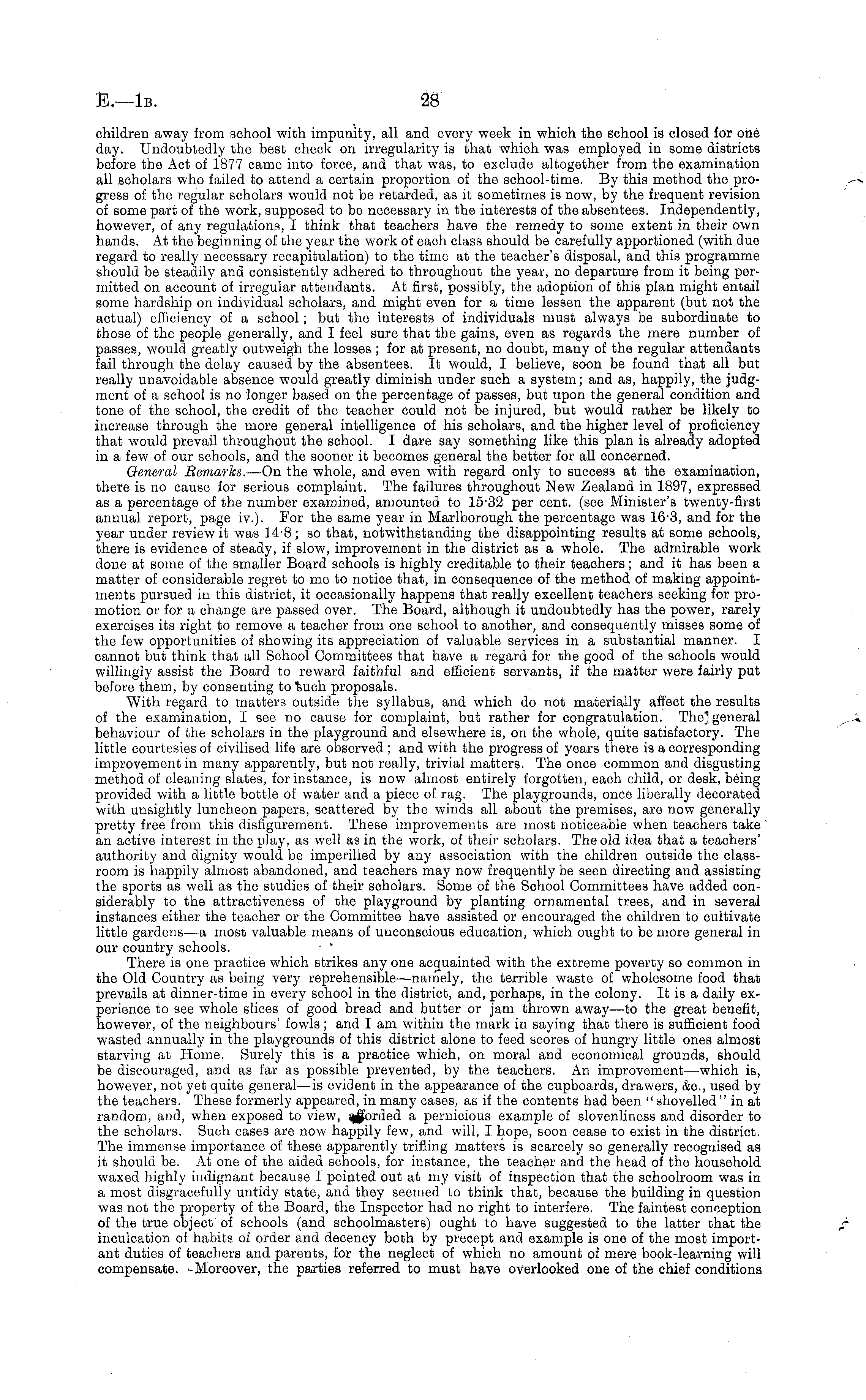 children away from school with impunity, all and every week in which the school is closed for one day. Undoubtedly the best check on irregularity is that which was employed in some districts before the Act of 1877 came into force, and that was, to exclude altogether from the examination all scholars who failed to attend a certain proportion of the school-time. By this method the progress of the regular scholars would not be retarded, as it sometimes is now, by the frequent revision of some part of the work, supposed to be necessary in the interests of the absentees. Independently, however, of any regulations, I think that teachers have the remedy to some extent in their own hands. At the beginning of the year the work of each class should be carefully apportioned (with due regard to really necessary recapitulation) to the time at the teacher's disposal, and this programme should be steadily and consistently adhered to throughout the year, no departure from it being permitted on account of irregular attendants. At first, possibly, the adoption of this plan might entail some hardship on individual scholars, and might even for a time lessen the apparent (but not the actual) efficiency of a school; but the interests of individuals must always be subordinate to those of the people generally, and I feel sure that the gains, even as regards the mere number of passes, would greatly outweigh the losses ; for at present, no doubt, many of the regular attendants fail through the delay caused by the absentees. It would, I believe, soon be found that all but really unavoidable absence would greatly diminish under such a system; and as, happily, the judgment of a school is no longer based on the percentage of passes, but upon the general condition and tone of the school, the credit of the teacher could not be injured, but would rather be likely to increase through the more general intelligence of his scholars, and the higher level of proficiency that would prevail throughout the school. I dare say something like this plan is already adopted in a few of our schools, and the sooner it becomes general the better for all concerned. General Bemarks. —On the whole, and even with regard only to success at the examination, there is no cause for serious complaint. The failures throughout New Zealand in 1897, expressed as a percentage of the number examined, amounted to 1532 per cent, (see Minister's twenty-first annual report, page iv.). For the same year in Marlborough the percentage was 163, and for the year under review it was 14-8; so that, notwithstanding the disappointing results at some schools, there is evidence of steady, if slow, improvement in the district as a whole. The admirable work done at some of the smaller Board schools is highly creditable to their teachers; and it has been a matter of considerable regret to me to notice that, in consequence of the method of making appointments pursued in this district, it occasionally happens that really excellent teachers seeking for promotion or for a change are passed over. The Board, although it undoubtedly has the power, rarely exercises its right to remove a teacher from one school to another, and consequently misses some of the few opportunities of showing its appreciation of valuable services in a substantial manner. I cannot but think that all School Committees that have a regard for the good of the schools would willingly assist the Board to reward faithful and efficient servants, if the matter were fairly put before them, by consenting to "such proposals. With regard to matters outside the syllabus, and which do not materially affect the results of the examination, I see no cause for complaint, but rather for congratulation. The] general behaviour of the scholars in the playground and elsewhere is, on the whole, quite satisfactory. The little courtesies of civilised life are observed ; and with the progress of years there is a corresponding improvement in many apparently, but not really, trivial matters. The once common and disgusting method of cleaning slates, for instance, is now almost entirely forgotten, each child, or desk, being provided with a little bottle of water and a piece of rag. The playgrounds, once liberally decorated with unsightly luncheon papers, scattered by the winds all about the premises, are now generally pretty free from this disfigurement. These improvements are most noticeable when teachers take an active interest in the play, as well as in the work, of their scholars. The old idea that a teachers' authority and dignity would be imperilled by any association with the children outside the classroom is happily almost abandoned, and teachers may now frequently be seen directing and assisting the sports as well as the studies of their scholars. Some of the School Committees have added considerably to the attractiveness of the playground by planting ornamental trees, and in several instances either the teacher or the Committee have assisted or encouraged the children to cultivate little gardens—a most valuable means of unconscious education, which ought to be more general in our country schools. • " There is one practice which strikes any one acquainted with the extreme poverty so common in the Old Country as being very reprehensible—namely, the terrible waste of wholesome food that prevails at dinner-time in every school in the district, and, perhaps, in the colony. It is a daily experience to see whole slices of good bread and butter or jam thrown away—to the great benefit, however, of the neighbours' fowls; and lam within the mark in saying that there is sufficient food wasted annually in the playgrounds of this district alone to feed scores of hungry little ones almost starving at Home. Surely this is a practice which, on moral and economical grounds, should be discouraged, and as far as possible prevented, by the teachers. An improvement—which is, however, not yet quite general—is evident in the appearanc