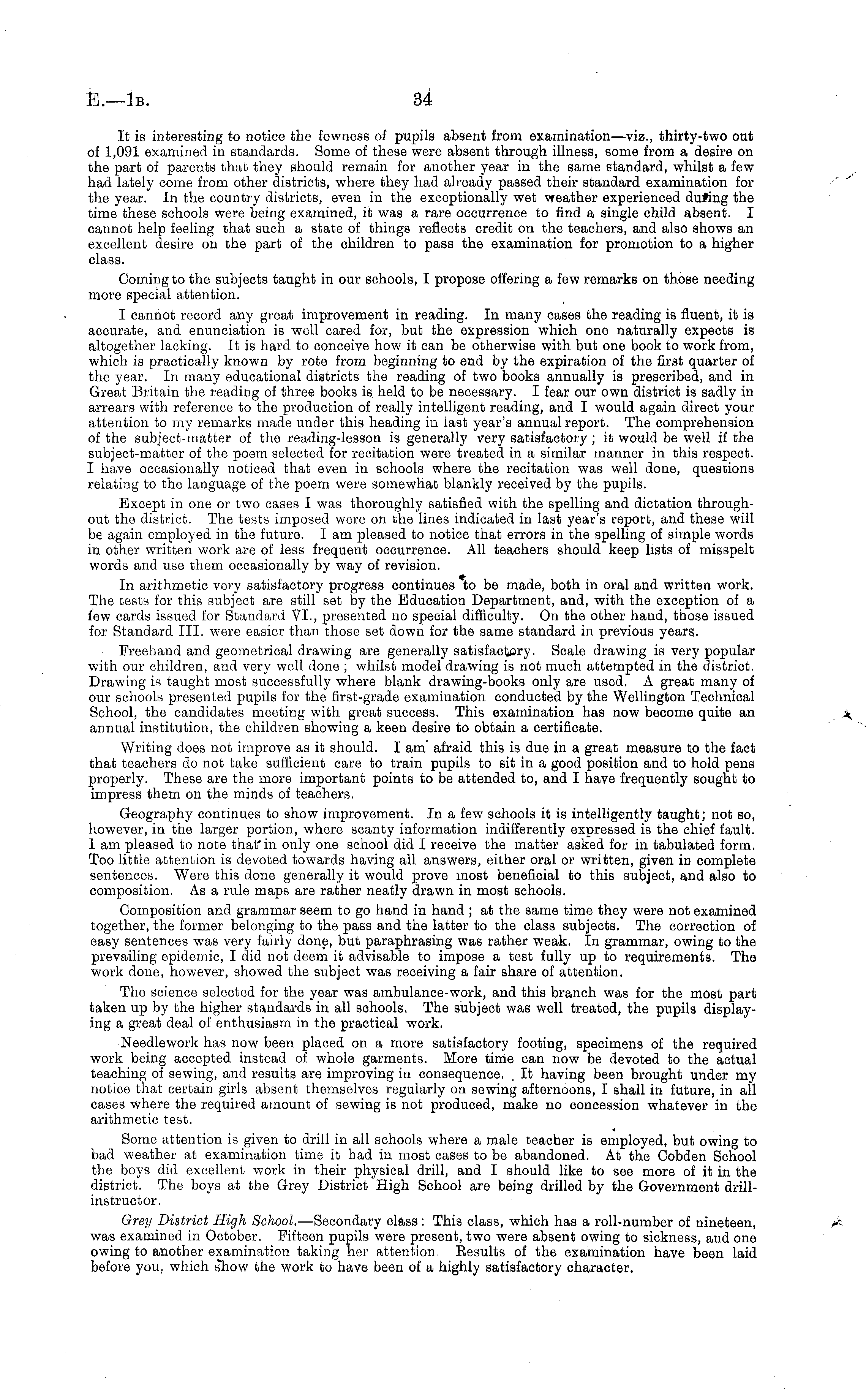 It is interesting to notice the fewness of pupils absent from examination—viz., thirty-two out of 1,091 examined in standards. Some of these were absent through illness, some from a desire on the part of parents that they should remain for another year in the same standard, whilst a few had lately come from other districts, where they had already passed their standard examination for the year. In the country districts, even in the exceptionally wet weather experienced during the time these schools were being examined, it was a rare occurrence to find a single child absent. I cannot help feeling that such a state of things reflects credit on the teachers, and also shows an excellent desire on the part of the children to pass the examination for promotion to a higher class. Coming to the subjects taught in our schools, I propose offering a few remarks on those needing more special attention. I cannot record any great improvement in reading. In many cases the reading is fluent, it is accurate, and enunciation is well cared for, but the expression which one naturally expects is altogether lacking. It is hard to conceive how it can be otherwise with but one book to work from, which is practically known by rote from beginning to end by the expiration of the first quarter of the year. In many educational districts the reading of two books annually is prescribed, and in Great Britain the reading of three books is. held to be necessary. I fear our own district is sadly in arrears with reference to the production of really intelligent reading, and I would again direct your attention to my remarks made under this heading in last year's annual report. The comprehension of the subject-matter of the reading-lesson is generally very satisfactory ; it would be well if the subject-matter of the poem selected for recitation were treated in a similar manner in this respect. I have occasionally noticed that even in schools where the recitation was well done, questions relating to the language of the poem were somewhat blankly received by the pupils. Except in one or two cases I was thoroughly satisfied with the spelling and dictation throughout the district. The tests imposed were on the lines indicated in last year's report, and these will be again employed in the future. lam pleased to notice that errors in the spelling of simple words in other written work are of less frequent occurrence. All teachers should keep lists of misspelt words and use them occasionally by way of revision. In arithmetic very satisfactory progress continues to be made, both in oral and written work. The tests for this subject are still set by the Education Department, and, with the exception of a few cards issued for Standard VI., presented no special difficulty. On the other hand, those issued for Standard 111. were easier than those set down for the same standard in previous years. Freehand and geometrical drawing are generally satisfactory. Scale drawing is very popular with our children, and very well done ; whilst model drawing is not much attempted in the district. Drawing is taught most successfully where blank drawing-books only are used. A great many of our schools presented pupils for the first-grade examination conducted by the Wellington Technical School, the candidates meeting with great success. This examination has now become quite an annual institution, the children showing a keen desire to obtain a certificate. Writing does not improve as it should. lam afraid this is due in a great measure to the fact that teachers do not take sufficient care to train pupils to sit in a good position and to hold pens properly. These are the more important points to be attended to, and I have frequently sought to impress them on the minds of teachers. Geography continues to show improvement. In a few schools it is intelligently taught; not so, however, in the larger portion, where scanty information indifferently expressed is the chief fault. 1 am pleased to note that* in only one school did I receive the matter asked for in tabulated form. Too little attention is devoted towards having all answers, either oral or written, given in complete sentences. Were this done generally it would prove most beneficial to this subject, and also to composition. As a rule maps are rather neatly drawn in most schools. Composition and grammar seem to go hand in hand ; at the same time they were not examined together, the former belonging to the pass and the latter to the class subjects. The correction of easy sentences was very fairly done, but paraphrasing was rather weak. In grammar, owing to the prevailing epidemic, I did not deem it advisable to impose a test fully up to requirements. The work done, however, showed the subject was receiving a fair share of attention. The science selected for the year was ambulance-work, and this branch was for the most part taken up by the higher standards in all schools. The subject was well treated, the pupils displaying a great deal of enthusiasm in the practical work. Needlework has now been placed on a more satisfactory footing, specimens of the required work being accepted instead of whole garments. More time can now be devoted to the actual teaching of sewing, and results are improving in consequence. , It having been brought under my notice that certain girls absent themselves regularly on sewing afternoons, I shall in future, in all cases where the required amount of sewing is not produced, make no concession whatever in the arithmetic test. Some attention is given to drill in all schools where a male teacher is employed, but owing to bad weather at examination time it had in most cases to be abandoned. At the Cobden School the boys did excellent work in their physical drill, and I should like to see more of it in the district. The boys at the Grey District High School are being drilled by the Government drillinstructor. Grey District High School. —Secondary class: This class, which has a roll-nu