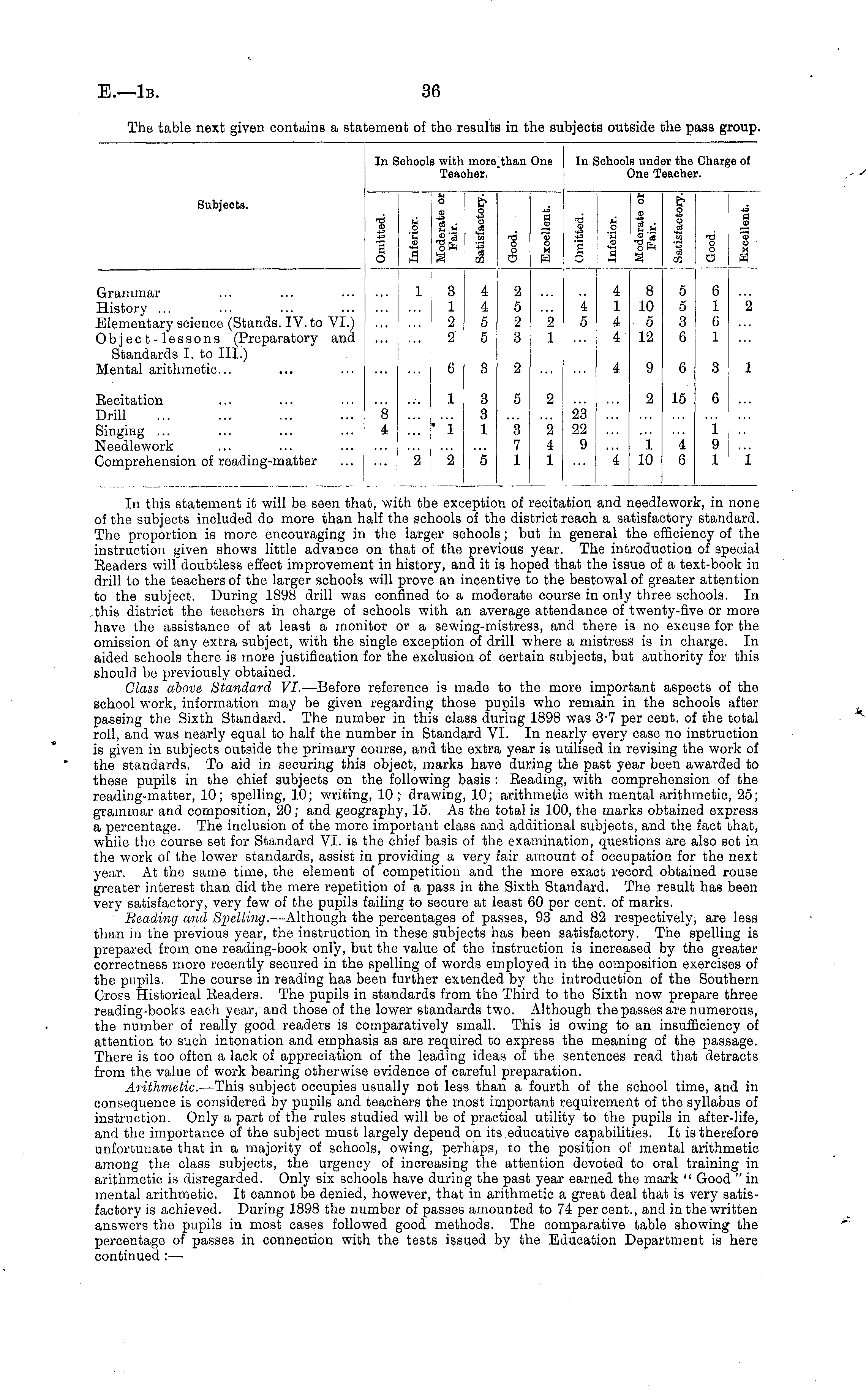 In this statement it will be seen that, with the exception of recitation and needlework, in none of the subjects included do more than half the schools of the district reach a satisfactory standard. The proportion is more encouraging in the larger schools; but in general the efficiency of the instruction given shows little advance on that of the previous year. The introduction of special Readers will doubtless effect improvement in history, and it is hoped that the issue of a text-book in drill to the teachers of the larger schools will prove an incentive to the bestowal of greater attention to the subject. During 1898 drill was confined to a moderate course in only three schools. In this district the teachers in charge of schools with an average attendance of twenty-five or more have the assistance of at least a monitor or a sewing-mistress, and there is no excuse for the omission of any extra subject, with the single exception of drill where a mistress is in charge. In aided schools there is more justification for the exclusion of certain subjects, but authority for this should be previously obtained. Class above Standard Vl. —Before reference is made to the more important aspects of the school w r ork, information may be given regarding those pupils who remain in the schools after passing the Sixth Standard. The number in this class during 1898 was 3-7 per cent, of the total roll, and was nearly equal to half the number in Standard VI. In nearly every case no instruction is given in subjects outside the primary course, and the extra year is utilised in revising the work of the standards. To aid in securing this object, marks have during the past year been awarded to these pupils in the chief subjects on the following basis : Beading, with comprehension of the reading-matter, 10; spelling, 10; writing, 10; drawing, 10; arithmetic with mental arithmetic, 25; grammar and composition, 20; and geography, 15. As the total is 100, the marks obtained express a percentage. The inclusion of the more important class and additional subjects, and the fact that, while the course set for Standard VI. is the chief basis of the examination, questions are also set in the work of the lower standards, assist in providing a very fair amount of occupation for the next year. At the same time, the element of competition and the more exact record obtained rouse greater interest than did the mere repetition of a pass in the Sixth Standard. The result has been very satisfactory, very few of the pupils failing to secure at least 60 per cent, of marks. Beading and Spelling. —Although the percentages of passes, 93 and 82 respectively, are less than in the previous year, the instruction in these subjects has been satisfactory. The spelling is prepared from one reading-book only, but the value of the instruction is increased by the greater correctness more recently secured in the spelling of words employed in the composition exercises of the pupils. The course in reading has been further extended by the introduction of the Southern Cross Historical Beaders. The pupils in standards from the Third to the Sixth now prepare three reading-books each year, and those of the lower standards two. Although the passes are numerous, the number of really good readers is comparatively small. This is owing to an insufficiency of attention to such intonation and emphasis as are required to express the meaning of the passage. There is too often a lack of appreciation of the leading ideas of the sentences read that detracts from the value of work bearing otherwise evidence of careful preparation. Arithmetic. —This subject occupies usually not less than a fourth of the school time, and in consequence is considered by pupils and teachers the most important requirement of the syllabus of instruction. Only a part of the rules studied will be of practical utility to the pupils in after-life, and the importance of the subject must largely depend on its educative capabilities. It is therefore unfortunate that in a majority of schools, owing, perhaps, to the position of mental arithmetic among the class subjects, the urgency of increasing the attention devoted to oral training in arithmetic is disregarded. Only six schools have during the past year earned the mark " Good "in mental arithmetic. It cannot be denied, however, that in arithmetic a great deal that is very satisfactory is achieved. During 1898 the number of passes amounted to 74 percent., and in the written answers the pupils in most cases followed good methods. The comparative table showing the percentage of passes in connection with the tests issued by the Education Department is here continued ;—