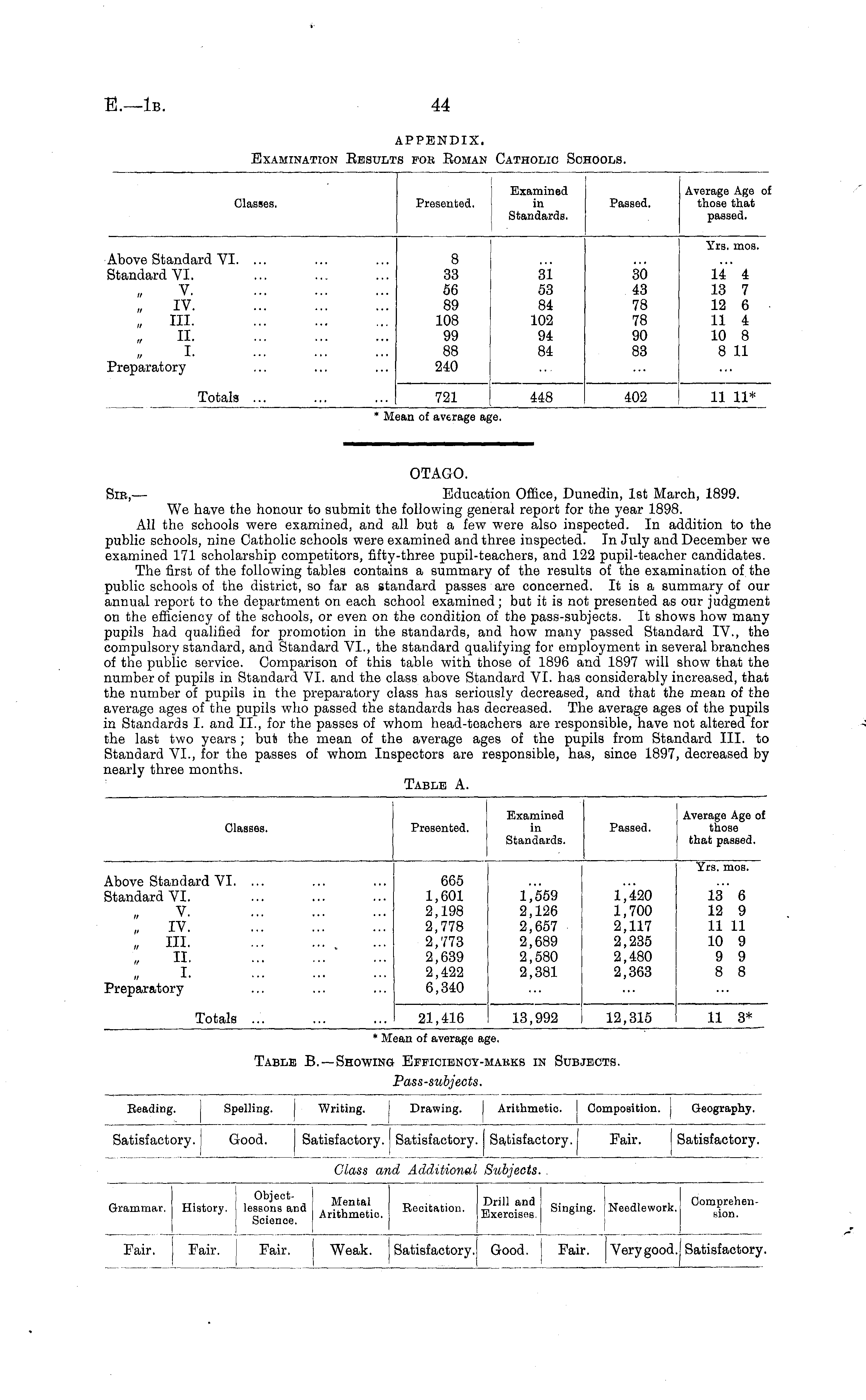 OTAGO. Sib, — Education Office, Dunedin, Ist March, 1899. We have the honour to submit the following general report for the year 1898. All the schools were examined, and all but a few were also inspected. In addition to the public schools, nine Catholic schools were examined and three inspected. In July and December we examined 171 scholarship competitors, fifty-three pupil-teachers, and 122 pupil-teacher candidates. The first of the following tables contains a summary of the results of the examination of the public schools of the district, so far as standard passes are concerned. It is a summary of our annual report to the department on each school examined ; but it is not presented as our judgment on the efficiency of the schools, or even on the condition of the pass-subjects. It shows how many pupils had qualified for promotion in the standards, and how many passed Standard IV., the compulsory standard, and Standard VI., the standard qualifying for employment in several branches of the public service. Comparison of this table with those of 1896 and 1897 will show that the number of pupils in Standard VI. and the class above Standard VI. has considerably increased, that the number of pupils in the preparatory class has seriously decreased, and that the mean of the average ages of the pupils who passed the standards has decreased. The average ages of the pupils in Standards I. and 11., for the passes of whom head-toachers are responsible, have not altered for the last two years ; but the mean of the average ages of the pupils from Standard 111. to Standard VI., for the passes of whom Inspectors are responsible, has, since 1897, decreased by nearly three months.