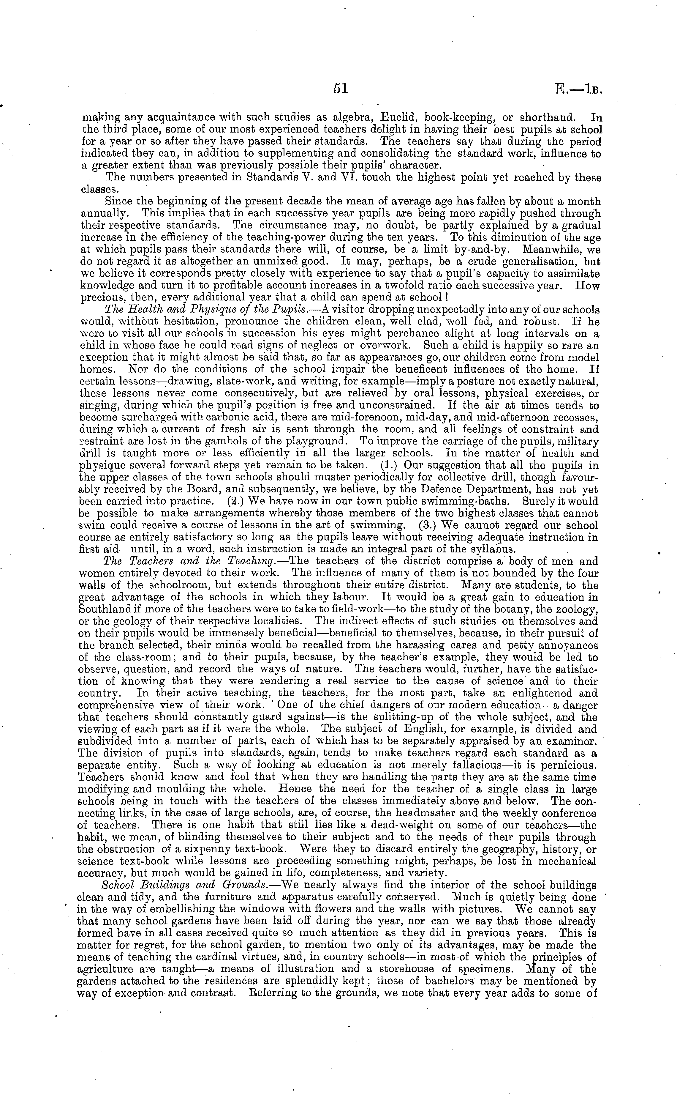 making any acquaintance with such studies as algebra, Euclid, book-keeping, or shorthand. In the third place, some of our most experienced teachers delight in having their best pupils at school for a year or so after they have passed their standards. The teachers say that during the period indicated they can, in addition to supplementing and consolidating the standard work, influence to a greater extent than was previously possible their pupils' character. The numbers presented in Standards V. and VI. touch the highest point yet reached by these classes. Since the beginning of the present decade the mean of average age has fallen by about a month annually. This implies that in each successive year pupils are being more rapidly pushed through their respective standards. The circumstance may, no doubt, be partly explained by a gradual increase in the efficiency of the teaching-power during the ten years. To this diminution of the age at which pupils pass their standards there will, of course, be a limit by-and-by. Meanwhile, we do not regard it as altogether an unmixed good. It may, perhaps, be a crude generalisation, but we believe it corresponds pretty closely with experience to say that a pupil's capacity to assimilate knowledge and turn it to profitable account increases in a twofold ratio each successive year. How precious, then, every additional year that a child can spend at school ! The Health and Physique of the Pupils. —A visitor dropping unexpectedly into any of our schools would, without hesitation, pronounce the children clean, well clad, well fed, and robust. If he were to visit all our schools in succession his eyes might perchance alight at long intervals on a child in whose face he could read signs of neglect or overwork. Such a child is happily so rare an exception that it might almost be said that, so far as appearances go, our children come from model homes. Nor do the conditions of the school impair the beneficent influences of the home. If certain lessons—drawing, slate-work, and writing, for example—imply a posture not exactly natural, these lessons never come consecutively, but are relieved by oral lessons, physical exercises, or singing, during which the pupil's position is free and unconstrained. If the air at times tends to become surcharged with carbonic acid, there are mid-forenoon, mid-day, and mid-afternoon recesses, during which a current of fresh air is sent through the room, and all feelings of constraint and restraint are lost in the gambols of the playground. To improve the carriage of the pupils, military drill is taught more or less efficiently in all the larger schools. In the matter of health and physique several forward steps yet remain to be taken. (1.) Our suggestion that all the pupils in the upper classes of the town schools should muster periodically for collective drill, though favourably received by the Board, and subsequently, we believe, by the Defence Department, has not yet been carried into practice. (2.) We have now in our town public swimming-baths. Surely it would be possible to make arrangements whereby those members of the two highest classes that cannot swim could receive a course of lessons in the art of swimming. (3.) We cannot regard our school course as entirely satisfactory so long as the pupils leave without receiving adequate instruction in first aid —until, in a word, such instruction is made an integral part of the syllabus. The Teachers and the Teaching. —The teachers of the district comprise a body of men and women entirely devoted to their work. The influence of many of them is not bounded by the four walls of the schoolroom, but extends throughout their entire district. Many are students, to the great advantage of the schools in which they labour. It would be a great gain to education in Southland if more of the teachers were to take to field-work—to the study of the botany, the zoology, or the geology of their respective localities. The indirect effects of such studies on themselves and on their pupils would be immensely beneficial—beneficial to themselves, because, in their pursuit of the branch selected, their minds would be recalled from the harassing cares and petty annoyances of the class-room; and to their pupils, because, by the teacher's example, they would be led to observe, question, and record the ways of nature. The teachers would, further, have the satisfaction of knowing that they were rendering a real service to the cause of science and to their country. In their active teaching, the teachers, for the most part, take an enlightened and comprehensive view of their work. ' One of the chief dangers of our modern education—a danger that teachers should constantly guard against—is the splitting-up of the whole subject, and the viewing of each part as if it were the whole. The subject of English, for example, is divided and subdivided into a number of parts, each of which has to be separately appraised by an examiner. The division of pupils into standards, again, tends to make teachers regard each standard as a separate entity. Such a way of looking at education is not merely fallacious—it is pernicious. Teachers should know and feel that when they are handling the parts they are at the same time modifying and moulding the whole. Hence the need for the teacher of a single class in large schools being in touch with the teachers of the classes immediately above and below. The connecting links, in the case of large schools, are, of course, the headmaster and the weekly conference of teachers. There is one habit that still lies like a dead-weight on some of our teachers—the habit, we mean, of blinding themselves to their subject and to the needs of their pupils through the obstruction of a sixpenny text-book. Were they to discard entirely the geography, history, or science text-book while lessons are proceeding something might, perhaps, be lost in mechanical accuracy, but much would be gaine