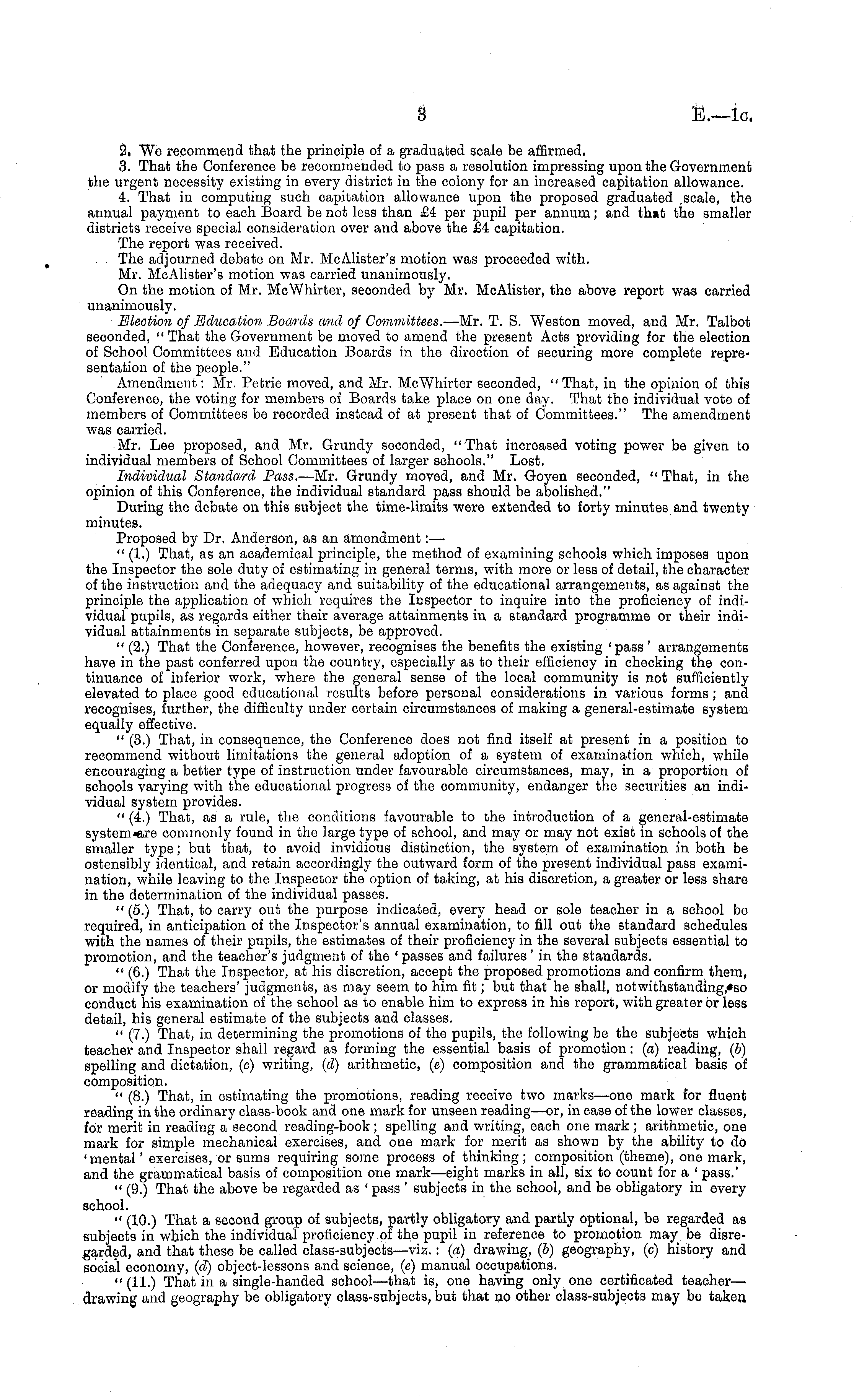 2. Wβ recommend that the principle of a graduated scale be affirmed. 3. That the Conference be recommended to pass a resolution impressing upon the Government the urgent necessity existing in every district in the colony for an increased capitation allowance. 4. That in computing such capitation allowance upon the proposed graduated .scale, the annual payment to each Board be not less than £4 per pupil per annum; and that the smaller districts receive special consideration over and above the £4 capitation. The report was received. The adjourned debate on Mr. McAlister's motion was proceeded with. Mr. McAlister's motion was carried unanimously. On the motion of Mr. McWhirter, seconded by Mr. McAlister, the above report was carried unanimously. Election of Education Boards and of Committees. —Mr. T. S. Weston moved, and Mr. Talbot seconded, " That the Government be moved to amend the present Acts providing for the election of School Committees and Education Boards in the direction of securing more complete representation of the people." Amendment: Mr. Petrie moved, and Mr. McWhirter seconded, " That, in the opinion of this Conference, the voting for members of Boards take place on one day. That the individual vote of members of Committees be recorded instead of at present that of Committees." The amendment was carried. Mr. Lee proposed, and Mr. Grundy seconded, "That increased voting power be given to individual members of School Committees of larger schools." Lost. Individual Standard Pass. —Mr. Grundy moved, and Mr. Goyen seconded, " That, in the opinion of this Conference, the individual standard pass should be abolished." During the debate on this subject the time-limits were extended to forty minutes and twenty minutes. Proposed by Dr. Anderson, as an amendment: — " (1.) That, as an academical principle, the method of examining schools which imposes upon the Inspector the sole duty of estimating in general terms, with more or less of detail, the character of the instruction and the adequacy and suitability of the educational arrangements, as against the principle the application of which requires the Inspector to inquire into the proficiency of individual pupils, as regards either their average attainments in a standard programme or their individual attainments in separate subjects, be approved. " (2.) That the Conference, however, recognises the benefits the existing 'pass' arrangements have in the past conferred upon the country, especially as to their efficiency in checking the continuance of inferior work, where the general sense of the local community is not sufficiently elevated to place good educational results before personal considerations in various forms; and recognises, further, the difficulty under certain circumstances of making a general-estimate system equally effective. " (3.) That, in consequence, the Conference does not find itself at present in a position to recommend without limitations the general adoption of a system of examination which, while encouraging a better type of instruction under favourable circumstances, may, in a proportion of schools varying with the educational progress of the community, endanger the securities an individual system provides. " (4.) That, as a rule, the conditions favourable to the introduction of a general-estimate system«are commonly found in the large type of school, and may or may not exist in schools of the smaller type; but that, to avoid invidious distinction, the system of examination in both be ostensibly identical, and retain accordingly the outward form of the present individual pass examination, while leaving to the Inspector the option of taking, at his discretion, a greater or less share in the determination of the individual passes. "(5.) That, to carry out the purpose indicated, every head or sole teacher in a school be required, in anticipation of the Inspector's annual examination, to fill out the standard schedules with the names of their pupils, the estimates of their proficiency in the several subjects essential to promotion, and the teacher's judgment of the ' passes and failures' in the standards. " (6.) That the Inspector, at his discretion, accept the proposed promotions and confirm them, or modify the teachers' judgments, as may seem to him fit; but that he shall, notwithstanding,«so conduct his examination of the school as to enable him to express in his report, with greater or less detail, his general estimate of the subjects and classes. " (7.) That, in determining the promotions of the pupils, the following be the subjects which teacher and Inspector shall regard as forming the essential basis of promotion: (a) reading, (6) spelling and dictation, (c) writing, (d) arithmetic, (c) composition and the grammatical basis of composition. " (8.) That, in estimating the promotions, reading receive two marks—one mark for fluent reading in the ordinary class-book and one mark for unseen reading—or, in case of the lower classes, for merit in reading a"second reading-book; spelling and writing, each one mark ; arithmetic, one mark for simple mechanical exercises, and one mark for merit as shown by the ability to do 'mental' exercises, or sums requiring some process of thinking; composition (theme), one mark, and the grammatical basis of composition one mark—eight marks in all, six to count for a ' pass.' " (9.) That the above be regarded as ' pass ' subjects in the school, and be obligatory in every school. " (10.) That a second group of subjects, partly obligatory and partly optional, be regarded as subjects in which the individual proficiency of the pupil in reference to promotion may be disregarded, and that these be called class-subjects—viz.: (a) drawing, (b) geography, (c) history and social economy, (d) object-lessons and science, (c) manual occupations. " (11.) That in a single-handed school—that is. one having only one certificated teacher— drawing and geography be obligatory class