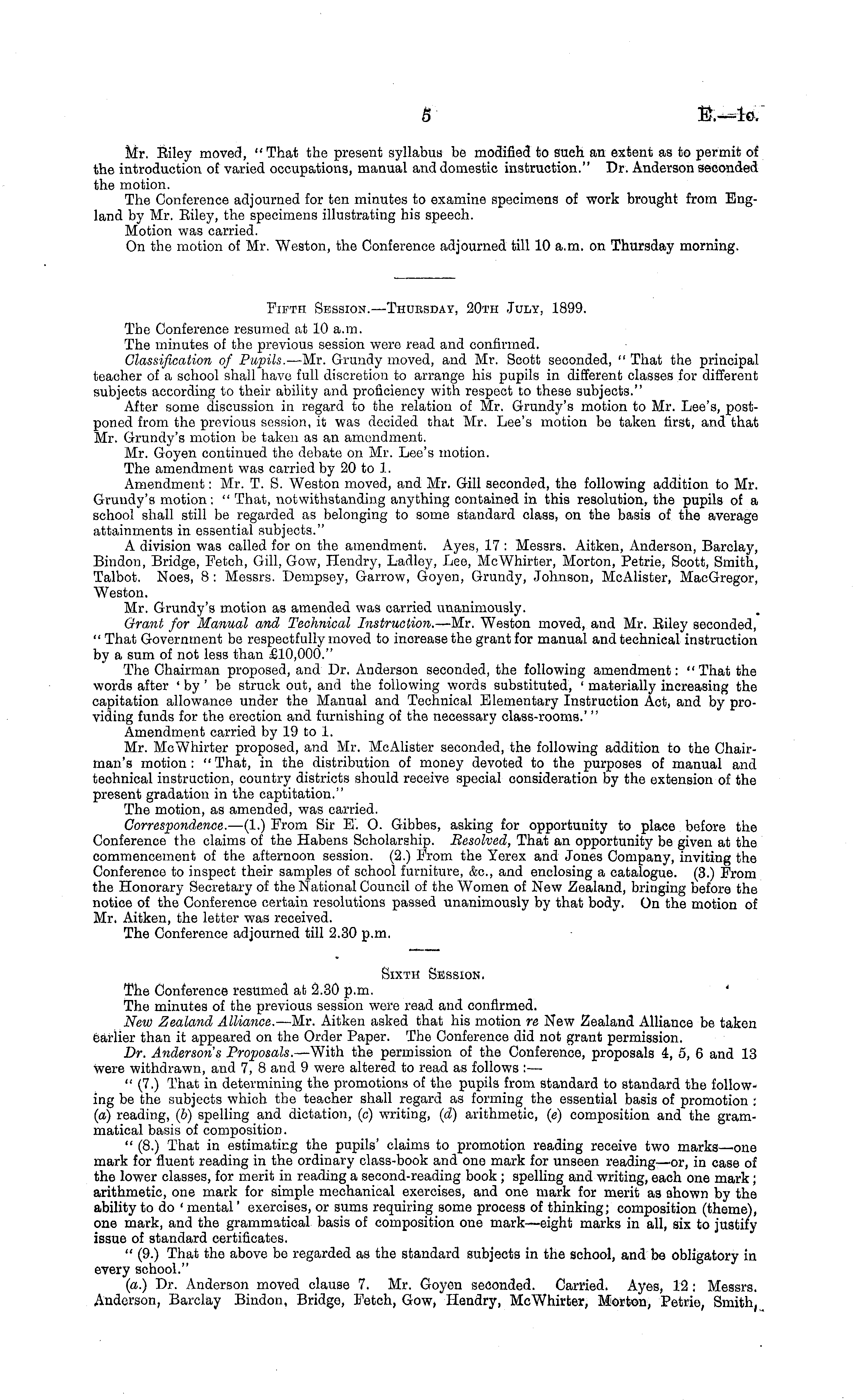 Fifth Session. —Thuusday, 20th July, 1899. The Conference resumed at 10 a.m. The minutes of the previous session were read and confirmed. Classification of Pupils. —Mr. Grundy moved, and Mr. Scott seconded, " That the principal teacher of a school shall have full discretion to arrange his pupils in different classes for different subjects according to their ability and proficiency with respect to these subjects." After some discussion in regard to the relation of Mr. Grundy's motion to Mr. Lee's, postponed from the previous session, it was decided that Mr. Lee's motion be taken first, and that Mr. Grundy's motion be taken as an amendment. Mr. Goyen continued the debate on Mr. Lee's motion. The amendment was carried by 20 to 1. Amendment: Mr. T. S. Weston moved, and Mr. Gill seconded, the following addition to Mr. Grundy's motion: " That, notwithstanding anything contained in this resolution, the pupils of a school shall still be regarded as belonging to some standard class, on the basis of the average attainments in essential subjects." A division was called for on the amendment. Ayes, 17 : Messrs. Aitken, Anderson, Barclay, Bindon, Bridge, Fetch, Gill, Gow, Hendry, Ladley, Lee, McWhirter, Morton, Petrie, Scott, Smith, Talbot. Noes, 8: Messrs. Dempsey, Garrow, Goyen, Grundy, Johnson, McAlister, MacGregor, Weston, Mr. Grundy's motion as amended was carried unanimously. Grant for Manual and Technical Instruction. —Mr. Weston moved, and Mr. Eiley seconded, " That Government be respectfully moved to increase the grant for manual and technical instruction by a sum of not less than £10,000." The Chairman proposed, and Dr. Anderson seconded, the following amendment: "That the words after ' by ' be struck out, and the following words substituted, ' materially increasing the capitation allowance under the Manual and Technical Elementary Instruction Act, and by providing funds for the erection and furnishing of the necessary class-rooms.' " Amendment carried by 19 to 1. Mr. McWhirter proposed, and Mr. McAlister seconded, the following addition to the Chairman's motion : " That, in the distribution of money devoted to the purposes of manual and technical instruction, country districts should receive special consideration by the extension of the present gradation in the captitation." The motion, as amended, was carried. Correspondence. —(1.) From Sir E~. O. Gibbes, asking for opportunity to place before the Conference the claims of the Habens Scholarship. Resolved, That an opportunity be given at the commencement of the afternoon session. (2.) From the Yerex and Jones Company, inviting the Conference to inspect their samples of school furniture, &c, and enclosing a catalogue. (3.) From the Honorary Secretary of the National Council of the Women of New Zealand, bringing before the notice of the Conference certain resolutions passed unanimously by that body. On the motion of Mr. Aitken, the letter was received. The Conference adjourned till 2.30 p.m.