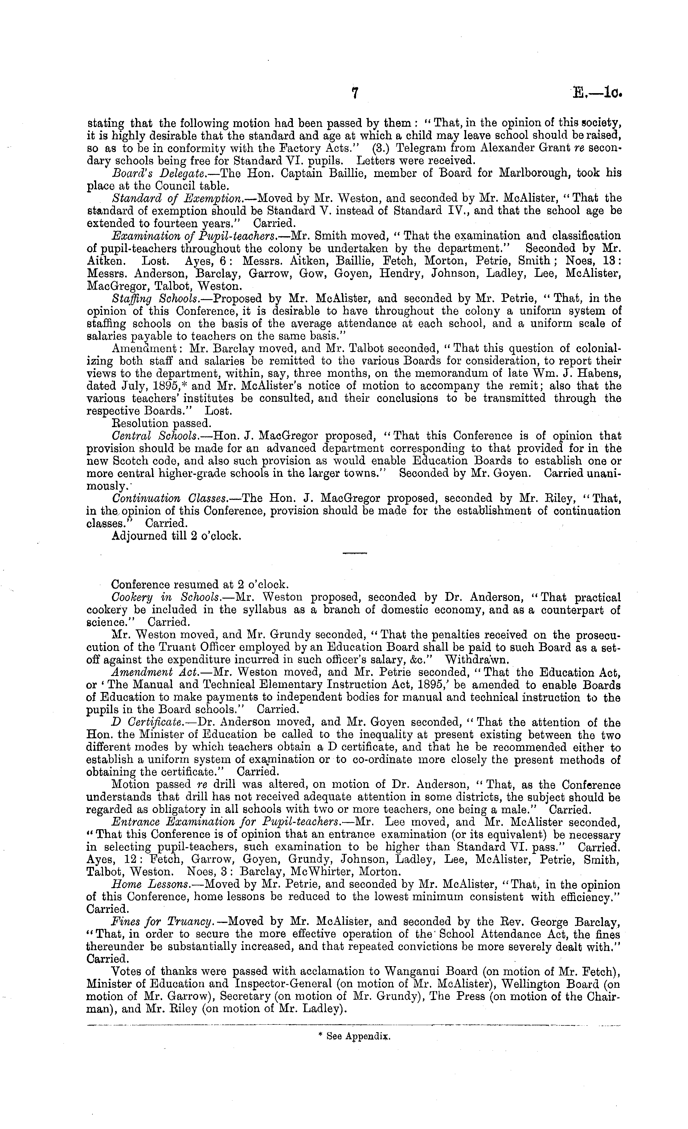 stating that the following motion had been passed by them : " That, in the opinion of this society, it is highly desirable that the standard and age at which a child may leave school should be raised, so as to be in conformity with the Factory Acts." (3.) Telegram from Alexander Grant re secondary schools being free for Standard VI. pupils. Letters were received. Board's Delegate. —The Hon. Captain Baillie, member of Board for Marlborough, took his place at the Council table. Standard of Exemption. —Moved by Mr. Weston, and seconded by Mr. McAlister, " That the standard of exemption should be Standard V. instead of Standard IV., and that the school age be extended to fourteen years." Carried. Examination of Pupil-teachers. —Mr. Smith moved, " That the examination and classification of pupil-teachers throughout the colony be undertaken by the department." Seconded by Mr. Aitken. Lost. Ayes, 6 : Messrs. Aitken, Baillie, Fetch, Morton, Petrie, Smith; Noes, 13: Messrs. Anderson, Barclay, Garrow, Gow, Goyen, Hendry, Johnson, Ladley, Lee, McAlister, MacGregor, Talbot, Weston. Staffing Schools. —Proposed by Mr. McAlister, and seconded by Mr. Petrie, " That, in the opinion of this Conference, it is desirable to have throughout the colony a uniform system of staffing schools on the basis of the average attendance at each school, and a uniform scale of salaries payable to teachers on the same basis." Amendment: Mr. Barclay moved, and Mr. Talbot seconded, " That this question of colonializing both staff and salaries be remitted to the various Boards for consideration, to report their views to the department, within, say, three months, on the memorandum of late Wm. J. Habens, dated July, 1895,* and Mr. McAlister's notice of motion to accompany the remit; also that the various teachers' institutes be consulted, and their conclusions to be transmitted through the respective Boards." Lost. Eesolution passed. Central Schools. —Hon. J. MacGregor proposed, " That this Conference is of opinion that provision should be made for an advanced department corresponding to that provided for in the new Scotch code, and also such provision as would enable Education Boards to establish one or more central higher-grade schools in the larger towns." Seconded by Mr. Goyen. Carried unanimously.' Continuation Classes. —The Hon. J. MacGregor proposed, seconded by Mr. Eiley, "That, in the opinion of this Conference, provision should be made for the establishment of continuation classes." Carried. Adjourned till 2 o'clock.