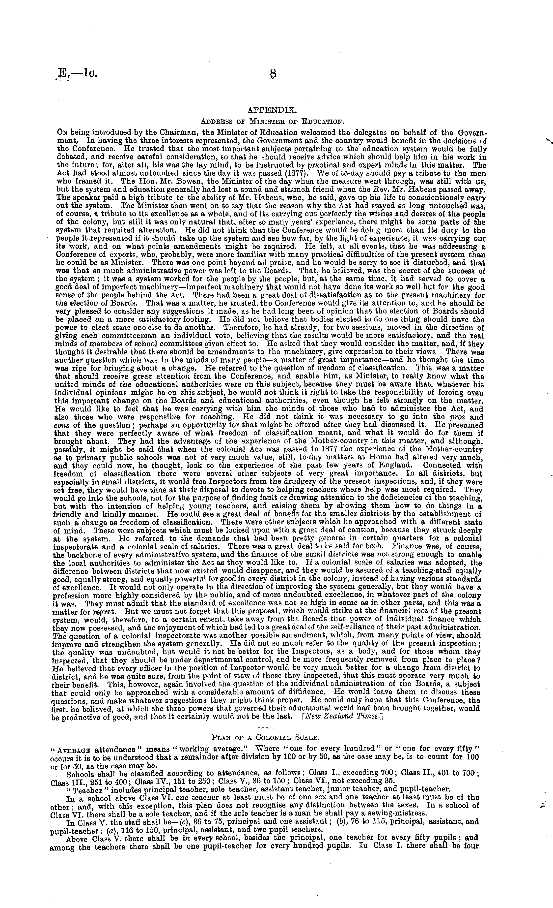 APPENDIX. Addbbss of Minister op Education. On being introduced by the Chairman, the Minister of Eduoation welcomed the delegates on behalf of the Government, In having the three interests represented, the Government and tho country would benefit in the decisions of the Conference. He trusted that the most important subjoots pertaining to the education system would be fully debated, and receive careful consideration, so that he should receive advice which should help him in his work in the future ; for, alter all, his was the lay mind, to be instructed by practical and expert minds in this matter. The Act had stood almost untouched since the day it was passed (1877). We of to-day should pay a tribute to the men who framed it. The Hon. Mr. Bowen, tbe Minister of the day when tha measure went through, was still with Uβ, but the system and eduoation generally had lost a sound and staunch friend when the Rev. Mr. Habens passed away. The speaker paid a high tribute to the ability of Mr. Habens, who, he said, gave up his lifo to conscientiously carry out the system. The Minister then went on to say that the reason why the Act had stayed so long untouched was, of oourse, a tribute to its excellence as a whole, and of its carrying out perfeotly the wishes and desires of the people of the colony, but still it was only natural that, after so many years' experience, there might bo some parts of the system that required alteration. He did not think that the Conference would be doing more than its duty to the people it represented if it should take up the system and see how far, by the light of experience, it was carrying out its work, and on what points amendments might bo required. He felt, at all events, that he was addressing a Conference of experts, who, probably, were more familiar with many practical difficulties of the present system than he could be as Minister. There was one point beyond all praise, and he would be sorry to see it disturbed, and that was that so much administrative power was loft to the Boards. That, he believed, was the secret of the success of the system; it was a system worked for the people by the people, but, at the same time, it had served to cover a good deal of imperfect machinery—imperfect machinery that would not have done its work so well but for the good sense of the people behind the Act. There had been a great deal of dissatisfaction as to the present machinery for the election of Boards. That was a matter, he trusted, the Conference would give its attention to, and he should be very pleased to consider any suggestions it made, as he had long been of opinion that tho election of Boards should be placed on a more satisfactory footing. He did not believe that bodies elected to do one thing should have the power to elect some one else to do another. Therefore, he had already, for two sessions, moved in the direction of giving each committeeman an individual vote, believing that the results would bo more satisfactory, and the real minds of members of school oommittees given effect to. He asked that they would consider the matter, and, if they thought it desirable that there should be amendments to the machinery, give oxpression to their views There was another question whioh was in the minds of many people— a matter of great importance—and he thought the time was ripe for bringing about a change. He referred to the question of freedom of classification. This was a matter that should receive great attention from the Conference, and enable him, as Minister, to really know what the united minds of the educational authorities were on this subject, because they must be aware that, whatever his individual opinions might be on this subjeot, he would not think it right to take the responsibility of foroing even this important change on the Boards and eduoational authorities, even though he felt strongly on the matter. He would like to feel that he was carrying with him the minds of those who had to administer the Act, and also those who were responsible for teaching. He did not think it was neoessary to go into the pros and cons of the question ; perhaps an opportunity for that might be offered after they had discussed it. He presumed that they were perfeotly aware of what freedom of classification meant, and what it would do for them if brought about. They had the advantage of the experience of the Mother-country in this matter, and although, possibly, it might be said that when the colonial Act was passed in 1877 the experience of the Mother-country as to primary public schools was not of very much value, still, today matters at Home had altered very much, and they could now, he thought, look to the experience of the past few years of England. Connected with freedom of classification there were several other subjects of very great importance. In all districts, but especially in small distriots, it would free Inspectors from the drudgery of the present inspections, and, if they were set free, they would have time at their disposal to devote to helping teachers where help was most required. They would go into the schools, not for the purpose of finding fault or drawing attention to the deficiencies of the teaching, but with the intention of helping young teaohers, and raising them by showing them how to do things in a friendly and kindly manner. He oould see a great deal of benefit for the smaller distriots by the establishment of suoh a ohange as freedom of olassifioation. There were other subjects which he approached with a different state of mind. These were subjects which must be looked upon with a great deal of caution, because they struck deeply at the system. He referred to the demands that had been pretty general in certain quarters for a colonial inspectorate and a colonial scale of salaries. There was a great deal to be said for both. Finance was, of oourse, the backbone of every administrative system, and the finance of the small districts was not strong