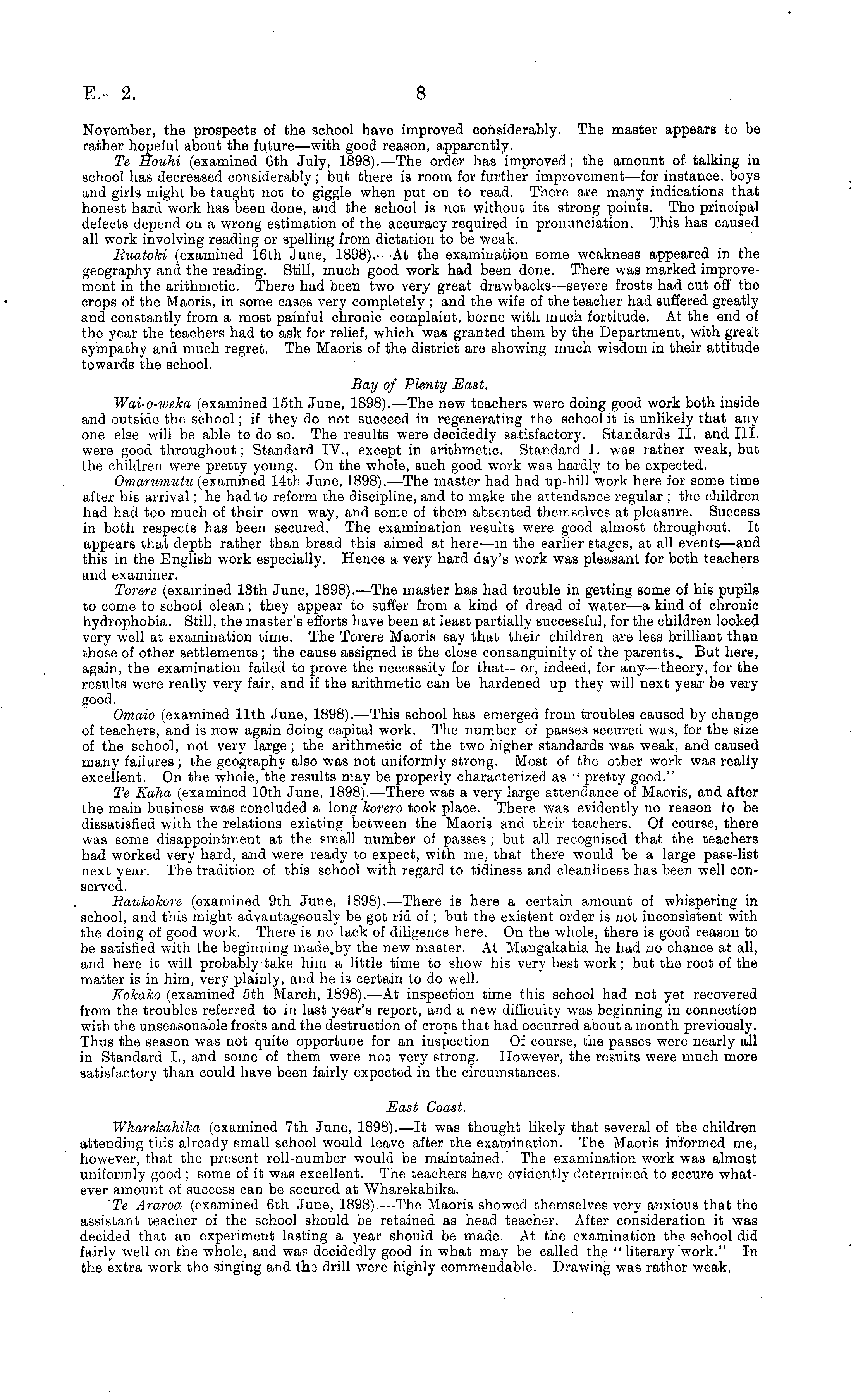 November, the prospects of the school have improved considerably. The master appears to be rather hopeful about the future —with good reason, apparently. Te Houhi (examined 6th July, 1898). —The order has improved; the amount of talking in school has decreased considerably; but there is room for further improvement —for instance, boys and girls might be taught not to giggle when put on to read. There are many indications that honest hard work has been done, and the school is not without its strong points. The principal defects depend on a wrong estimation of the accuracy required in pronunciation. This has caused all work involving reading or spelling from dictation to be weak. Buatoki (examined 16th June, 1898). —At the examination some weakness appeared in the geography and the reading. Still, much good work had been done. There was marked improvement in the arithmetic. There had been two very great drawbacks—severe frosts had cut off the crops of the Maoris, in some cases very completely ; and the wife of the teacher had suffered greatly and constantly from a most painful chronic complaint, borne with much fortitude. At the end of the year the teachers had to ask for relief, which was granted them by the Department, with great sympathy and much regret. The Maoris of the district are showing much wisdom in their attitude towards the school. Bay of Plenty East. Wai-o-weka (examined 15th June, 1898). —The new teachers were doing good work both inside and outside the school; if they do not succeed in regenerating the school it is unlikely that any one else will be able to do so. The results were decidedly satisfactory. Standards 11. and 111. were good throughout; Standard IV., except in arithmetic. Standard I. was rather weak, but the children were pretty young. On the whole, such good work was hardly to be expected. Omarumutu (examined 14th June, 1898). —The master had had up-hill work here for some time after his arrival; he had to reform the discipline, and to make the attendance regular ; the children had had too much of their own way, and some of them absented themselves at pleasure. Success in both respects has been secured. The examination results were good almost throughout. It appears that depth rather than bread this aimed at here—in the earlier stages, at all events —and this in the English work especially. Hence a very hard day's work was pleasant for both teachers and examiner. Torere (examined 13th June, 1898). —The master has had trouble in getting some of his pupils to come to school clean; they appear to suffer from a kind of dread of water —a kind of chronic hydrophobia. Still, the master's efforts have been at least partially successful, for the children looked very well at examination time. The Torere Maoris say that their children are less brilliant than those of other settlements ; the cause assigned is the close consanguinity of the parents.. But here, again, the examination failed to prove the necesssity for that—or, indeed, for any—theory, for the results were really very fair, and if the arithmetic can be hardened up they will next year be very good. Omaio (examined 11th June, 1898). —This school has emerged from troubles caused by change of teachers, and is now again doing capital work. The number of passes secured was, for the size of the school, not very large; the arithmetic of the two higher standards was weak, and caused many failures; the geography also was not uniformly strong. Most of the other work was really excellent. On the whole, the results may be properly characterized as " pretty good." Te Kaha (examined 10th June, 1898). —There was a very large attendance of Maoris, and after the main business was concluded a long korero took place. There was evidently no reason to be dissatisfied with the relations existing between the Maoris and their teachers. Of course, there was some disappointment at the small number of passes ; but all recognised that the teachers had worked very hard, and were ready to expect, with me, that there would be a large pass-list next year. The tradition of this school with regard to tidiness and cleanliness has been well conserved. Baukokorc (examined 9th June, 1898). —There is here a certain amount of whispering in school, and this might advantageously be got rid of; but the existent order is not inconsistent with the doing of good work. There is no lack of diligence here. On the whole, there is good reason to be satisfied with the beginning made,by the new master. At Mangakahia he had no chance at all, and here it will probably take him a little time to show his very best work; but the root of the matter is in him, very plainly, and he is certain to do well. Kokako (examined sth March, 1898). —At inspection time this school had not yet recovered from the troubles referred to in last year's report, and a new difficulty was beginning in connection with the unseasonable frosts and the destruction of crops that had occurred about a month previously. Thus the season was not quite opportune for an inspection Of course, the passes were nearly all in Standard 1., and some of them were not very strong. However, the results were much more satisfactory than could have been fairly expected in the circumstances. East Coast. Wharekahika (examined 7th June, 1898). —It was thought likely that several of the children attending this already small school would leave after the examination. The Maoris informed me, however, that the present roll-number would be maintained. The examination work was almost uniformly good; some of it was excellent. The teachers have evidently determined to secure whatever amount of success can be secured at Wharekahika. Te Araroa (examined 6th June, 1898). —The Maoris showed themselves very anxious that the assistant teacher of the school should be retained as head teacher. After consideration it was decided that an experiment lasting a year should be made. At the examination th