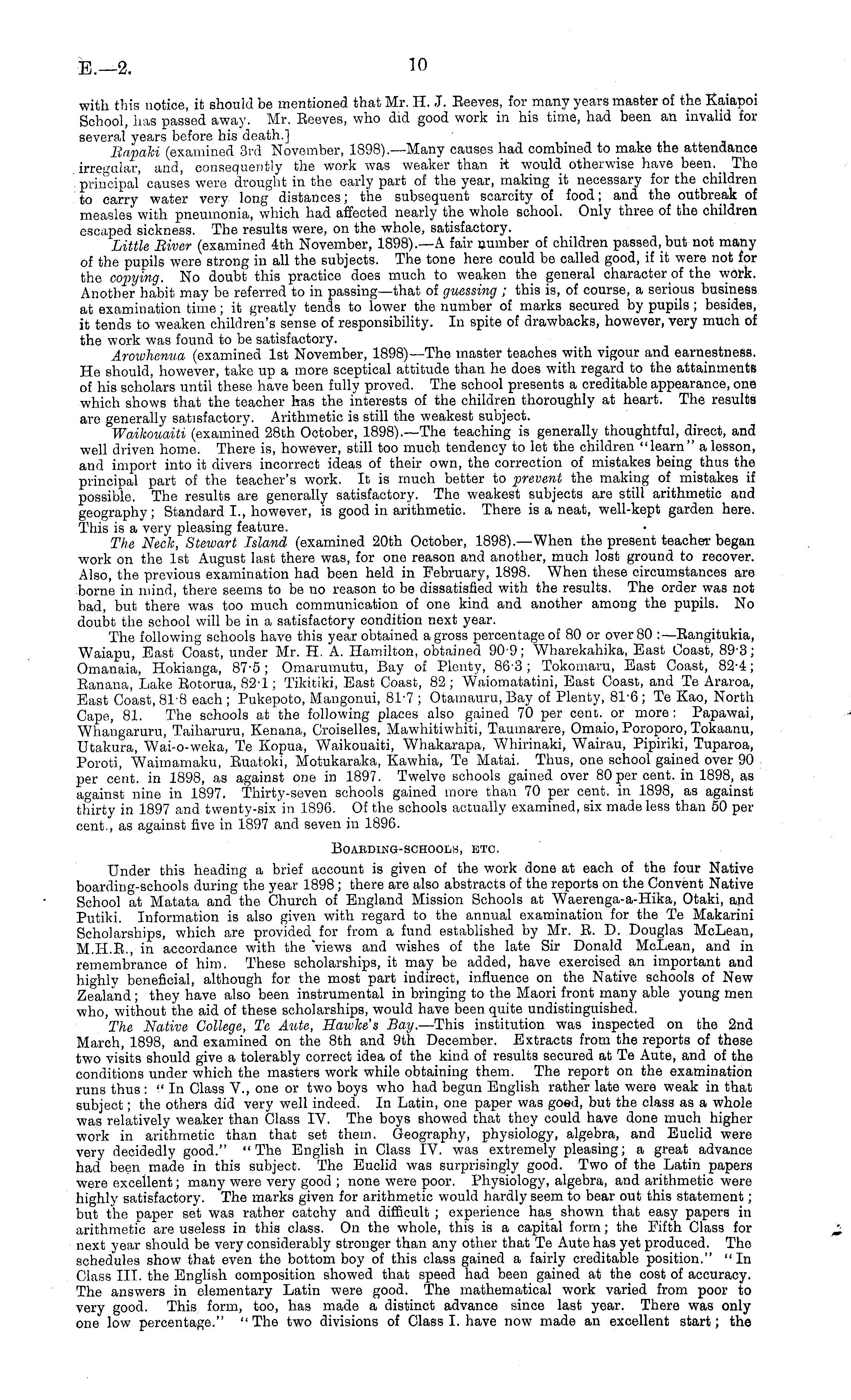 with this notice, it should be mentioned that Mr. H. J. Beeves, for many years master of the Kaiapoi School, has passed away. Mr. Beeves, who did good work in his time, had been an invalid for several years before his death.] Bapaki (examined 3rd November, 1898).—Many causes had combined to make the attendance irregular, and, consequently the work was weaker than it would otherwise have been._ The '. principal' causes were drought in the early part of the year, making it necessary for the children to carry water very long distances; the subsequent scarcity of food; and the outbreak of measles with pneumonia, which had affected nearly the whole school. Only three of the children escaped sickness. The results were, on the whole, satisfactory. Little Biver (examined 4th November, 1898).—A fair number of children passed, but not many of the pupils were strong in all the subjects. The tone here could be called good, if it were not for the copying. No doubt this practice does much to weaken the general character of the work. Another habit may be referred to in passing—that of guessing ; this is, of course, a serious business at examination time; it greatly tends to lower the number of marks secured by pupils; besides, it tends to weaken children's sense of responsibility. In spite of drawbacks, however, very much of the work was found to be satisfactory. Arowhenua (examined Ist November, 1898)— The master teaches with vigour and earnestness. He should, however, take up a more sceptical attitude than he does with regard to the attainments of his scholars until these have been fully proved. The school presents a creditable appearance, one which shows that the teacher has the interests of the children thoroughly at heart. The results are generally satisfactory. Arithmetic is still the weakest subject. Waikouaiti (examined 28th October, 1898).—The teaching is generally thoughtful, direct, and well driven home. There is, however, still too much tendency to let the children "learn" a lesson, and import into it divers incorrect ideas of their own, the correction of mistakes being thus the principal part of the teacher's work. It is much better to prevent the making of mistakes if possible. The results are generally satisfactory. The weakest subjects are still arithmetic and geography; Standard 1., however, is good in arithmetic. There is a neat, well-kept garden here. This is a very pleasing feature. The Neck, Stewart Island (examined 20th October, 1898).—When the present teacher began work on the Ist August last there was, for one reason and another, much lost ground to recover. Also, the previous examination had been held in February, 1898. When these circumstances are borne in mind, there seems to be no reason to be dissatisfied with the results. The order was not bad, but there was too much communication of one kind and another among the pupils. No doubt the school will be in a satisfactory condition next year. The following schools have this year obtained a gross percentage of 80 or over 80 : —Bangitukia, Waiapu, East Coast, under Mr. H. A. Hamilton, obtained 909; Wharekahika, East Coast, 89-3; Omanaia, Hokianga, 87-5; Omarumutu, Bay of Plenty, 86-3; Tokomaru, East Coast, 82-4; Banana, Lake Botorua, 82-1; Tikitiki, East Coast, 82 ; Waiomatatini, East Coast, and Te Araroa, East Coast, 81-8 each; Pukepoto, Mangonui, 81-7 ; Otamauru,Bay of Plenty, 81-6; Te Kao, North Cape, 81. The schools at the following places also gained 70 per cent, or more : Papawai, Whangaruru, Taiharuru, Kenana, Croiselles, Mawhitiwhiti, Taumarere, Omaio, Poroporo, Tokaanu, Utakura, Wai-o-weka, Te Kopua, Waikouaiti, Whakarapa, Whirinaki, Wairau, Pipiriki, Tuparoa, Poroti, Waimamaku, Buatoki, Motukaraka, Kawhia, Te Matai. Thus, one school gained over 90 per cent, in 1898, as against one in 1897. Twelve schools gained over 80 per cent, in 1898, as against nine in 1897. Thirty-seven schools gained more than 70 per cent, in 1898, as against thirty in 1897 and twenty-six'in 1896. Of the schools actually examined, six made less than 50 per cent., as against five in 1897 and seven in 1896. Boarding-schools, etc. Under this heading a brief account is given of the work done at each of the four Native boarding-schools during the year 1898; there are also abstracts of the reports on the Convent Native School at Matata and the Church of England Mission Schools at Waerenga-a-Hika, Otaki, and Putiki. Information is also given with regard to the annual examination for the Te Makarini Scholarships, which are provided for from a fund established by Mr. B. D. Douglas McLean, M.H.8., in accordance with the "views and wishes of the late Sir Donald McLean, and in remembrance of him. These scholarships, it may be added, have exercised an important and highly beneficial, although for the most part indirect, influence on the Native schools of New Zealand; they have also been instrumental in bringing to the Maori front many able young men who, without the aid of these scholarships, would have been quite undistinguished. The Native College, Te Aute, Hawke's Bay. —This institution was inspected on the 2nd March, 1898, and examined on the Bth and 9th December. Extracts from the reports of these two visits should give a tolerably correct idea of the kind of results secured at Te Aute, and of the conditions under which the masters work while obtaining them. The report on the examination runs thus : " In Class V., one or two boys who had begun English rather late were weak in that subject; the others did very well indeed. In Latin, one paper was goed, but the class as a whole was relatively weaker than Class IV. The boys showed that they could have done much higher work in arithmetic than that set them. Geography, physiology, algebra, and Euclid were very decidedly good." "The English in Class IV. was extremely pleasing; a great advance had been made in this subject. The Euclid was surprisingly good. Two of the Latin papers were excellent;