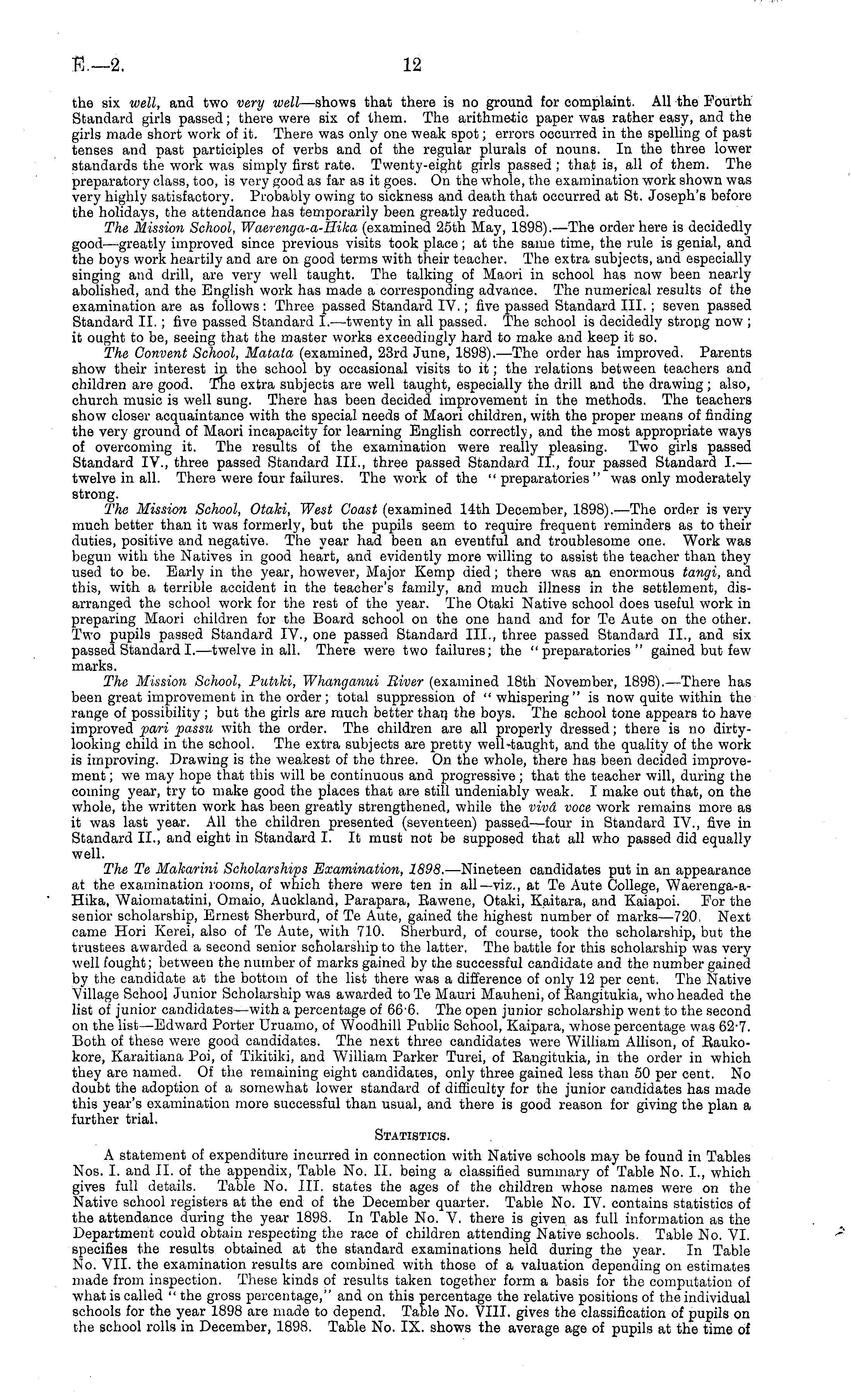 the six well, and two very well —shows that there is no ground for complaint. All the Fourth Standard girls passed; there were six of them. The arithmetic paper was rather easy, and the girls made short work of it. There was only one weak spot; errors occurred in the spelling of past tenses and past participles of verbs and of the regular plurals of nouns. In the three lower standards the work was simply first rate. Twenty-eight girls passed ; that is, all of them. The preparatory class, too, is very good as far as it goes. On the whole, the examination work shown was very highly satisfactory. Probably owing to sickness and death that occurred at St. Joseph's before the holidays, the attendance has temporarily been greatly reduced. The Mission School, Waerenga-a-Hika (examined 25th May, 1898). —The order here is decidedly good—greatly improved since previous visits took place; at the same time, the rule is genial, and the boys work heartily and are on good terms with their teacher. The extra subjects, and especially singing and drill, are very well taught. The talking of Maori in school has now been nearly abolished, and the English work has made a corresponding advance. The numerical results of the examination are as follows: Three passed Standard IV.; five passed Standard 111. ; seven passed Standard II.; five passed Standard I.—twenty in all passed. The school is decidedly strong now ; it ought to be, seeing that the master works exceedingly hard to make and keep it so. The Convent School, Mataia (examined, 23rd June, 1898). —The order has improved. Parents show their interest in the school by occasional visits to it; the relations between teachers and children are good. The extra subjects are well taught, especially the drill and the drawing; also, church music is well sung. There has been decided improvement in the methods. The teachers show closer acquaintance with the special needs of Maori children, with the proper means of finding the very ground of Maori incapacity for learning English correctly, and the most appropriate ways of overcoming it. The results of the examination were really pleasing. Two girls passed Standard IV., three passed Standard 111., three passed Standard 11., four passed Standard I.— twelve in all. There were four failures. The work of the "preparatories" was only moderately strong. The Mission School, Otaki, West Coast (examined 14th December, 1898). —The order is very much better than it was formerly, but the pupils seem to require frequent reminders as to their duties, positive and negative. The year had been an eventful and troublesome one. Work was begun with the Natives in good heart, and evidently more willing to assist the teacher than they used to be. Early in the year, however, Major Kemp died; there was an enormous tangi, and this, with a terrible accident in the teacher's family, and much illness in the settlement, disarranged the school work for the rest of the year. The Otaki Native school does useful work in preparing Maori children for the Board school on the one hand and for Te Aute on the other. Two pupils passed Standard IV., one passed Standard 111., three passed Standard 11., and six passed Standard I.—twelve in all. There were two failures; the "preparatories" gained but few marks. The Mission School, Putiki, Whanganui Biver (examined 18th November, 1898). —There has been great improvement in the order; total suppression of " whispering" is now quite within the range of possibility ; but the girls are much better than the boys. The school tone appears to have improved pari passu with the order. The children are all properly dressed; there is no dirtylooking child in the school. The extra subjects are pretty well-taught, and the quality of the work is improving. Drawing is the weakest of the three. On the whole, there has been decided improvement ; we may hope that this will be continuous and progressive ; that the teacher will, during the coming year, try to make good the places that are still undeniably weak. I make out that, on the whole, the written work has been greatly strengthened, while the vivd voce work remains more as it was last year. All the children presented (seventeen) passed—four in Standard IV., five in Standard 11., and eight in Standard I. It must not be supposed that all who passed did equally well. The Te Makarini Scholarships Examination, 1898. —Nineteen candidates put in an appearance at the examination rooms, of which there were ten in all—viz., at Te Aute College, Waerenga-a-Hika, Waiomatatini, Omaio, Auckland, Parapara, Bawene, Otaki, Kaitara, and Kaiapoi. For the senior scholarship, Ernest Sherburd, of Te Aute, gained the highest number of marks—72o, Next came Hori Kerei, also of Te Aute, with 710. Sherburd, of course, took the scholarship, but the trustees awarded a second senior scholarship to the latter. The battle for this scholarship was very well fought; between the number of marks gained by the successful candidate and the number gained by the candidate at the bottom of the list there was a difference of only 12 per cent. The Native Village School Junior Scholarship was awarded to Te Mauri Mauheni, of Bangitukia, who headed the list of junior candidates—with a percentage of 66-6. The open junior scholarship went to the second on the list—Edward Porter Uruamo, of Woodhill Public School, Kaipara, whose percentage was 62-7. Both of these were good candidates. The next three candidates were William Allison, of Baukokore, Karaitiana Poi, of Tikitiki, and William Parker Turei, of Bangitukia, in the order in which they are named. Of the remaining eight candidates, only three gained less than 50 per cent. No doubt the adoption of a somewhat lower standard of difficulty for the junior candidates has made this year's examination more successful than usual, and there is good reason for giving the plan a further trial. Statistics. A statement of expenditure incurred in connection with