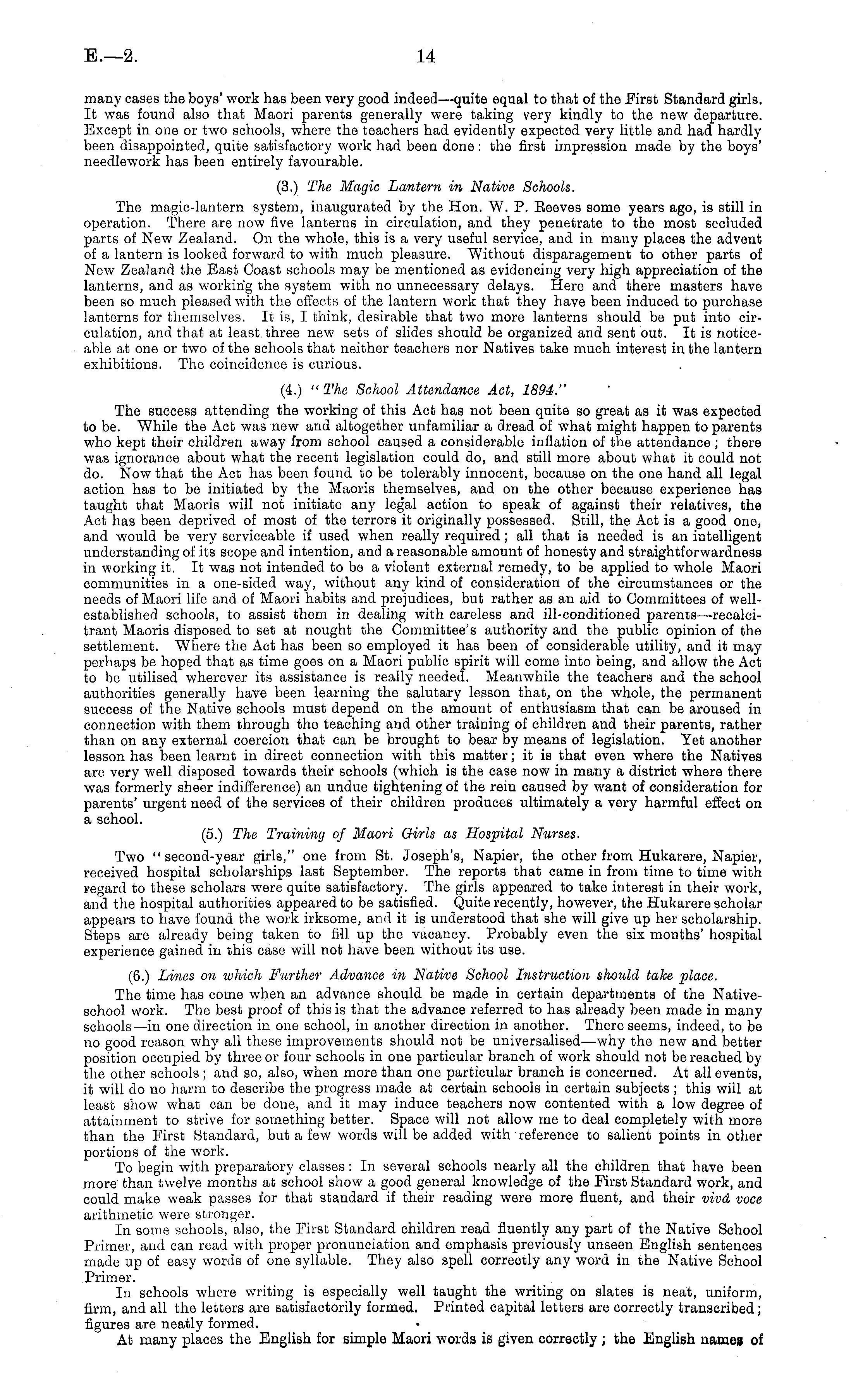 many cases the boys' work has been very good indeed—quite equal to that of the First Standard girls. It was found also that Maori parents generally were taking very kindly to the new departure. Except in one or two schools, where the teachers had evidently expected very little and had hardly been disappointed, quite satisfactory work had been done: the first impression made by the boys' needlework has been entirely favourable. (3.) The Magic Lantern in Native Schools. The magic-lantern system, inaugurated by the Hon. W. P. Beeves some years ago, is still in operation. There are now five lanterns in circulation, and they penetrate to the most secluded parts of New Zealand. On the whole, this is a very useful service, and in many places the advent of a lantern is looked forward to with much pleasure. Without disparagement to other parts of New Zealand the East Coast schools may be mentioned as evidencing very high appreciation of the lanterns, and as working the system with no unnecessary delays. Here and there masters have been so much pleased with the effects of the lantern work that they have been induced to purchase lanterns for themselves. It is, I think, desirable that two more lanterns should be put into circulation, and that at least, three new sets of slides should be organized and sent out. It is noticeable at one or two of the schools that neither teachers nor Natives take much interest in the lantern exhibitions. The coincidence is curious. (4.) " The School Attendance Act, 1894." The success attending the working of this Act has not been quite so great as it was expected to be. While the Act was new and altogether unfamiliar a dread of what might happen to parents who kept their children away from school caused a considerable inflation of the attendance ; there was ignorance about what the recent legislation could do, and still more about what it could not do. Now that the Act has been found to be tolerably innocent, because on the one hand all legal action has to be initiated by the Maoris themselves, and on the other because experience has taught that Maoris will not initiate any legal action to speak of against their relatives, the Act has been deprived of most of the terrors it originally possessed. Still, the Act is a good one, and would be very serviceable if used when really required; all that is needed is an intelligent understanding of its scope and intention, and a reasonable amount of honesty and straightforwardness in working it. It was not intended to be a violent external remedy, to be applied to whole Maori communities in a one-sided way, without any kind of consideration of the circumstances or the needs of Maori life and of Maori habits and prejudices, but rather as an aid to Committees of wellestablished schools, to assist them in dealing with careless and ill-conditioned parents —recalcitrant Maoris disposed to set at nought the Committee's authority and the public opinion of the settlement. Where the Act has been so employed it has been of considerable utility, and it may perhaps be hoped that as time goes on a Maori public spirit will come into being, and allow the Act to be utilised wherever its assistance is really needed. Meanwhile the teachers and the school authorities generally have been learning the salutary lesson that, on the whole, the permanent success of the Native schools must depend on the amount of enthusiasm that can be aroused in connection with them through the teaching and other training of children and their parents, rather than on any external coercion that can be brought to bear by means of legislation. Yet another lesson has been learnt in direct connection with this matter; it is that even where the Natives are very well disposed towards their schools (which is the case now in many a district where there was formerly sheer indifference) an undue tightening of the rein caused by want of consideration for parents' urgent need of the services of their children produces ultimately a very harmful effect on a school. (5.) The Training of Maori Girls as Hospital Nurses. Two "second-year girls," one from St. Joseph's, Napier, the other from Hukarere, Napier, received hospital scholarships last September. The reports that came in from time to time with regard to these scholars were quite satisfactory. The girls appeared to take interest in their work, and the hospital authorities appeared to be satisfied. Quite recently, however, the Hukarere scholar appears to have found the work irksome, and it is understood that she will give up her scholarship. Steps are already being taken to fill up the vacancy. Probably even the six months' hospital experience gained in this case will not have been without its use. (6.) Lines on which Further Advance in Native School Instruction should take place. The time has come when an advance should be made in certain departments of the Nativeschool work. The best proof of this is that the advance referred to has already been made in many schools —in one direction in one school, in another direction in another. There seems, indeed, to be no good reason why all these improvements should not be universalised—why the new and better position occupied by three or four schools in one particular branch of work should not be reached by the other schools ; and so, also, when more than one particular branch is concerned. At all events, it will do no harm to describe the progress made at certain schools in certain subjects ; this will at least show what can be done, and it may induce teachers now contented with a low degree of attainment to strive for something better. Space will not allow me to deal completely with more than the First Standard, but a few words will be added with reference to salient points in other portions of the work. To begin with preparatory classes: In several schools nearly all the children that have been more than twelve months at school show a good general knowledge of the First Standard wo