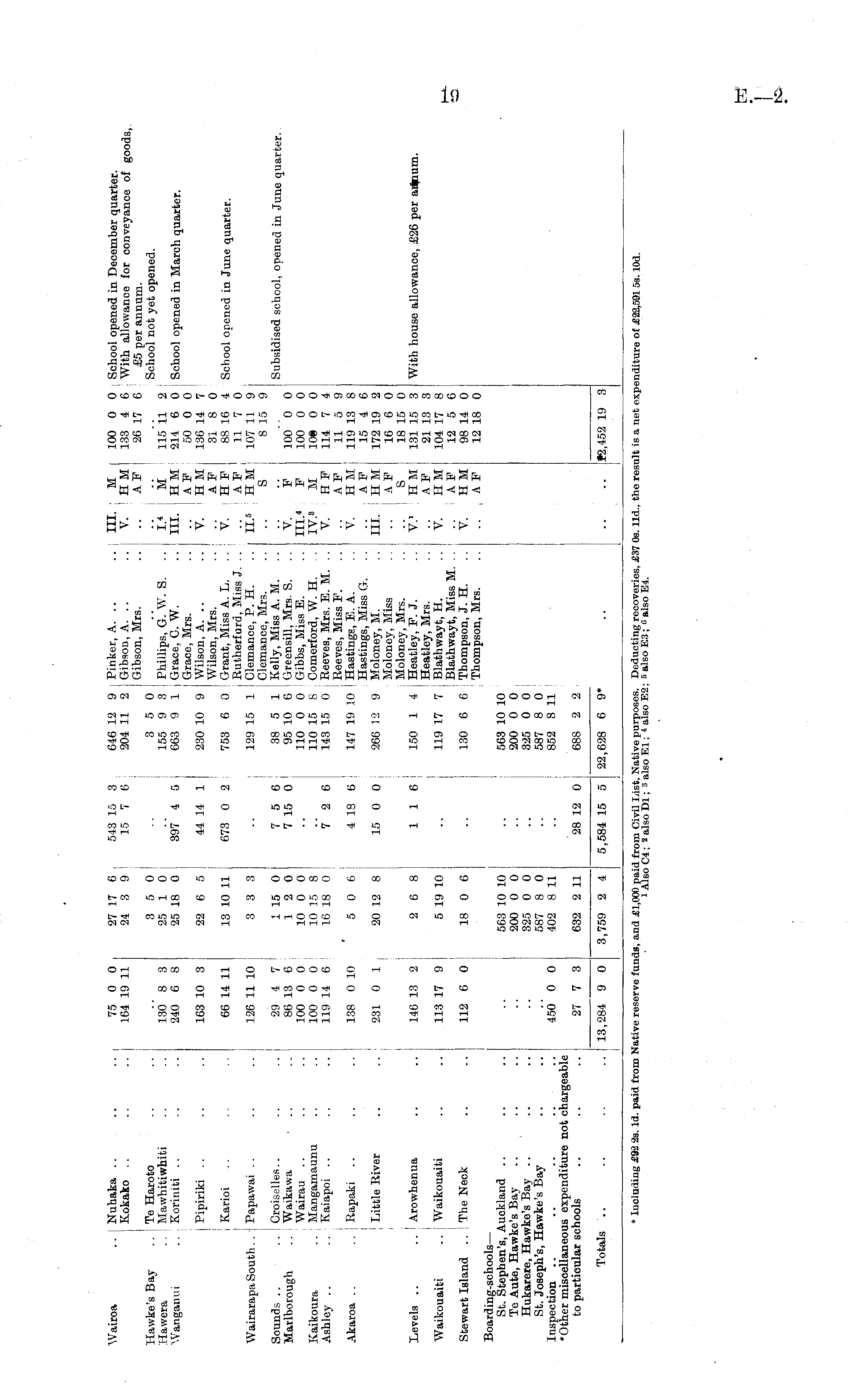 Wairoa .. Nuhaka Kokako 75 0 0 164 19 11 27 17 6 , 24 3 9 543 15 3 15 7 6 397 4 5 44 14 1 673 0 3 7 5 6 7 15 0 7 2 6 4 IS 6 15 0 0 116 646 12 9 j Pinker, A. .. .. I III. : M 204 11 2 I Gibson, A. .. .. V. ' H M Gibson, Mrs. .. .. A F 3 5 0 .. .... 155 9 3 Phillips, G. W. S. .. I. 4 I M 663 9 1 j Grace, C. W. .. III. ' H M ■ Grace, Mrs. .. .. j A P ' 230 10 9 Wilson, A. .. .. V. i H M Wilson, Mrs. .. .. A F 753 6 0 Grant, Miss A. L. .. V. HF Rutherfurd, Miss J AP 129 15 1 Clemance, P. H. .. I 11." H M Clemance, Mrs. .. I .. S 38 5 1 Kelly, Miss A. M 95 10 6 Greensill, Mrs. S. .. V. F 110 0 0 Gibbs, Miss E. .. III. 4 F 110 15 8 . Comerford, W. H. , . IV. 3 M 143 15 0 Reeves, Mrs. E. M. .. V. H F Reeves, Miss F A F 147 19 10 Hastings, E. A. .. V. H M Hastings, Miss G A F 266 12 9 Moloney, M. .. III. ! H M Moloney, Miss .. .. IB , Moloney, Mrs. .. .. S 150 1 4 Heatley, F. J. .. V.' H M Heatley, Mrs. .. .. A F 119 17 7 Blathwayt, H. .. V. H M Blathwayt, Miss M A F 130 6 6 Thompson, J. H. .. V. H M Thompson, Mrs , A F 563 10 10 200 0 0 325 0 0 587 8 0 852 8 11 100 0 0 School opened in December quarter. 133 4 6 With allowance for conveyance of goods 26 17 6 £5 per annum. School not yet opened. 115 11 2 214 6 0 ; School opened in March quarter. 50 0 0 136 14 7 31 8 0 88 16 4 School opened in June quarter. 11 7 0 107 11 9 8 15 9 Subsidised school, opened in June quarter. 100 0 0 100 0 0 lOf 0 0 114 7 4 11 5 9 119 13 8 15 4 6 172 19 2 16 6 0 18 15 0 131 15 3 With house allowance, £26 per arifrmm. 21 13 3 104 17 8 12 5 6 98 14 0 12 18 0 Hawke's Bay .. Te Haroto Hawera .. Mawhitiwhiti "Wanganui .. Koriniti 130 8 3 240 6 8 3 5 0 25 1 0 25 18 0 j Pipiriki 163 10 3 22 6 5 I Karioi 66 14 11 13 10 11 I Wairarapa South.. Papawai 126 11 10 3 3 3 Sounds .. • .. Croiselles.. Marlborough .. Waikawa ■ Wairau Kaikoura .. Mangamaunu Ashley .. .. Kaiapoi 29 4 7 86 13 6 100 0 0 100 0 0 119 14 6 1 15 0 12 0 10 0 0 10 15 8 16 18 0 Akaroa .. .. j Rapaki J Little River 138 0 10 5 0 6 231 0 1 20 12 8 Levels .. .. I Arowhenua 146 13 2 2 6 8 "Waikouaiti .. Waikouaiti 113 17 9 5 19 10 Stewart Island .. i The Neck 112 6 0 18 0 6 ! Boarding-schools — St. Stephen's, Auckland Te Aute, Hawke's Bay Hukarere, Hawke's Bay St. Joseph's, Hawke's Bay Inspection .. .. .. * Other miscellaneous expenditure not chargeable to particular schools 450 0 0 563 10 10 ! 200 0 0 325 0 0 587 8 0 402 8 11 27 7 3 632 2 11 ! 28 12 0 688 2 2 Totals 13,284 9 0 3,759 2 4 584 15 5 25 !2,628 6 9* .. .. .. * 12,452 19 3 !2,452 19 3 5,584 15 5 22,628 6 9* * Including £92 2s. Id. paid from Native reserve funds, ana £1,000 paid from Civil List, Native purposes. Deducting recoveries, £37 0s. lid., the result is a net expenditure of £22,591 5s. 10d 1 Also C4 ; 2 also Dl; 2 also El; * also E2; 5 also E3 ; 6 also E4.