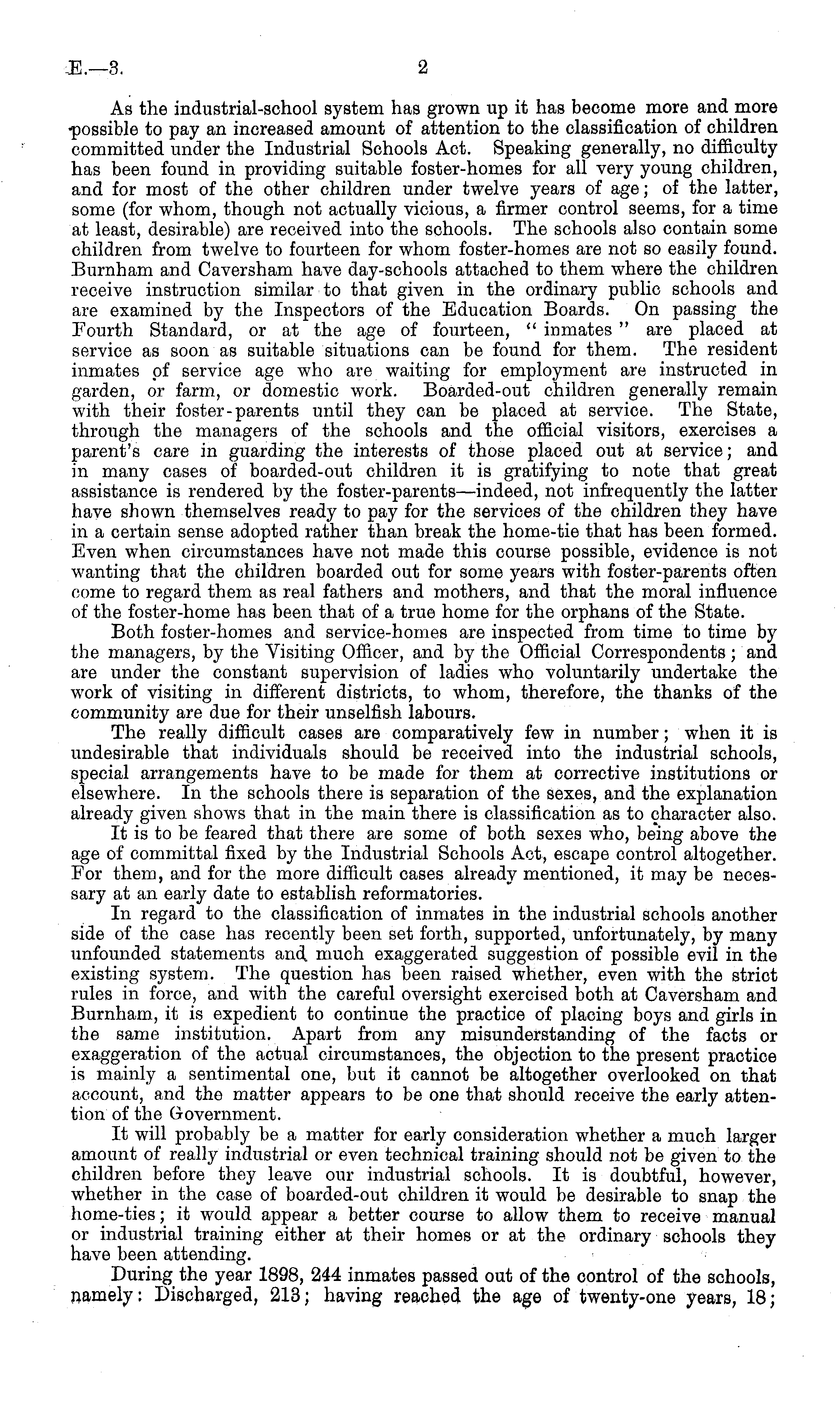 As the industrial-school system has grown up it has become more and more 'possible to pay an increased amount of attention to the classification of children committed under the Industrial Schools Act. Speaking generally, no difficulty has been found in providing suitable foster-homes for all very young children, and for most of the other children under twelve years of age; of the latter, some (for whom, though not actually vicious, a firmer control seems, for a time at least, desirable) are received into the schools. The schools also contain some children from twelve to fourteen for whom foster-homes are not so easily found. Burnham and Caversham have day-schools attached to them where the children receive instruction similar to that given in the ordinary public schools and are examined by the Inspectors of the Education Boards. On passing the Fourth Standard, or at the age of fourteen, " inmates " are placed at service as soon as suitable situations can be found for them. The resident inmates of service age who are waiting for employment are instructed in garden, or farm, or domestic work. Boarded-out children generally remain with their foster-parents until they can be placed at service. The State, through the managers of the schools and the official visitors, exercises a parent's care in guarding the interests of those placed out at service; and in many cases of boarded-out children it is gratifying to note that great assistance is rendered by the foster-parents—indeed, not infrequently the latter have shown themselves ready to pay for the services of the children they have in a certain sense adopted rather than break the home-tie that has been formed. Even when circumstances have not made this course possible, evidence is not wanting that the children boarded out for some years with foster-parents often come to regard them as real fathers and mothers, and that the moral influence of the foster-home has been that of a true home for the orphans of the State. Both foster-homes and service-homes are inspected from time to time by the managers, by the Visiting Officer, and by the Official Correspondents; and are under the constant supervision of ladies who voluntarily undertake the work of visiting in different districts, to whom, therefore, the thanks of the community are due for their unselfish labours. The really difficult cases are comparatively few in number; when it is undesirable that individuals should be received into the industrial schools, special arrangements have to be made for them at corrective institutions or elsewhere. In the schools there is separation of the sexes, and the explanation already given shows that in the main there is classification as to character also. It is to be feared that there are some of both sexes who, being above the age of committal fixed by the Industrial Schools Act, escape control altogether. For them, and for the more difficult cases already mentioned, it may be necessary at an early date to establish reformatories. In regard to the classification of inmates in the industrial schools another side of the case has recently been set forth, supported, unfortunately, by many unfounded statements and. much exaggerated suggestion of possible evil in the existing system. The question has been raised whether, even with the strict rules in force, and with the careful oversight exercised both at Caversham and Burnham, it is expedient to continue the practice of placing boys and girls in the same institution. Apart from any misunderstanding of the facts or exaggeration of the actual circumstances, the objection to the present practice is mainly a sentimental one, but it cannot be altogether overlooked on that account, and the matter appears to be one that should receive the early attention of the Government. It will probably be a matter for early consideration whether a much larger amount of really industrial or even technical training should not be given to the children before they leave our industrial schools. It is doubtful, however, whether in the case of boarded-out children it would be desirable to snap the home-ties; it would appear a better course to allow them to receive manual or industrial training either at their homes or at the ordinary schools they have been attending. During the year 1898, 244 inmates passed out of the control of the schools, namely: Discharged, 213; having reached the age of twenty-one years, 18;