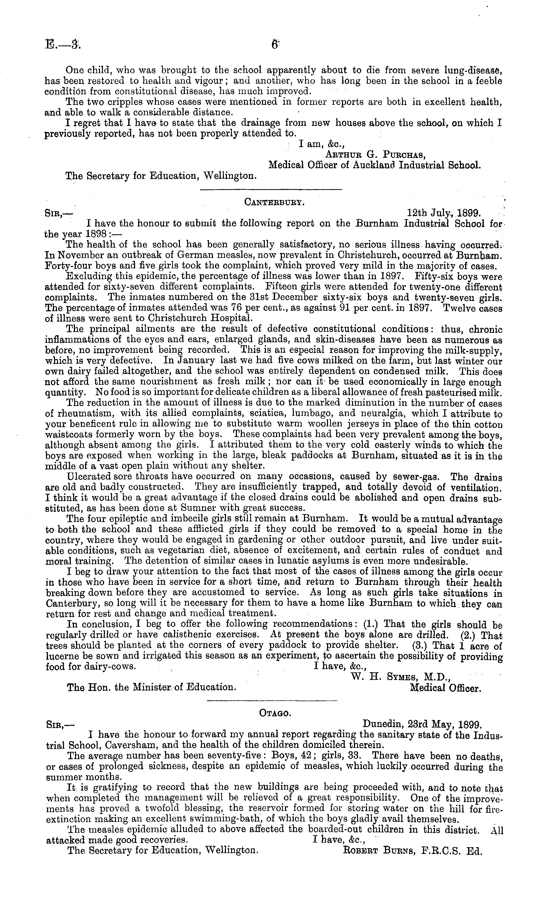 Canteebuey. Sir,— 12th July, 1899. I have the honour to submit the following report on the Burnham Industrial School for the year 1898 :— The health of the school has been generally satisfactory, no serious illness having occurred. In November an outbreak of German measles, now prevalent in Christchurch, occurred at Burnham. Forty-four boys and five girls took the complaint, which proved very mild in the majority of cases. Excluding this epidemic, the percentage of illness was lower than in 1897. Fifty-six boys were attended for sixty-seven different complaints. Fifteen girls were attended for twenty-one different complaints. The inmates numbered on the 31st December sixty-six boys and twenty-seven girls. The percentage of inmates attended was 76 per cent., as against 91 per cent, in 1897. Twelve cases of illness were sent to Christchurch Hospital. The principal ailments are the result of defective constitutional conditions: thus, chronic inflammations of the eyes and ears, enlarged glands, and skin-diseases have been as numerous as before, no improvement being recorded. This is an especial reason for improving the milk-supply, which is very defective. In January last we had five cows milked on the farm, but last winter our own dairy failed altogether, and the school was entirely dependent on condensed milk. This does not afford the same nourishment as fresh milk; nor can it be used economically in large enough quantity. No food is so important for delicate children as a liberal allowance of fresh pasteurised milk. The reduction in the amount of illness is due to the marked diminution in the number of cases of rheumatism, with its allied complaints, sciatica, lumbago, and neuralgia, which I attribute to your beneficent rule in allowing me to substitute warm woollen jerseys in place of the thin cotton waistcoats formerly worn by the boys. These complaints had been very prevalent among the boys, although absent among the girls. I attributed them to the very cold easterly winds to which the boys are exposed when working in the large, bleak paddocks at Burnham, situated as it is in the middle of a vast open plain without any shelter. Ulcerated sore throats have occurred on many occasions, caused by sewer-gas. The drains are old and badly constructed. They are insufficiently trapped, and totally devoid of ventilation. I think it would be a great advantage if the closed drains could be abolished and open drains substituted, as has been done at Sumner with great success. The four epileptic and imbecile girls still remain at Burnham. It would be a mutual advantage to both the school and these afflicted girls if they could be removed to a special home in the country, where they would be engaged in gardening or other outdoor pursuit, and live under suitable conditions, such as vegetarian diet, absence of excitement, and certain rules of conduct and moral training. The detention of similar cases in lunatic asylums is even more undesirable. I beg to draw your attention to the fact that most of the cases of illness among the girls occur in those who have been in service for a short time, and return to Burnham through their health breaking down before they are accustomed to service. As long as such girls take situations in Canterbury, so long will it be necessary for them to have a home like Burnham to which they can return for rest and change and medical treatment. In conclusion, I beg to offer the following recommendations: (1.) That the girls should be regularly drilled or have calisthenic exercises. At present the boys alone are drilled. (2.) That trees should be planted at the corners of every paddock to provide shelter. (3.) That 1 acre of lucerne be sown and irrigated this season as an experiment, to ascertain the possibility of providing food for dairy-cows. I have, &c, W. H. Symes, M.D., The Hon. the Minister of Education. Medical Officer.