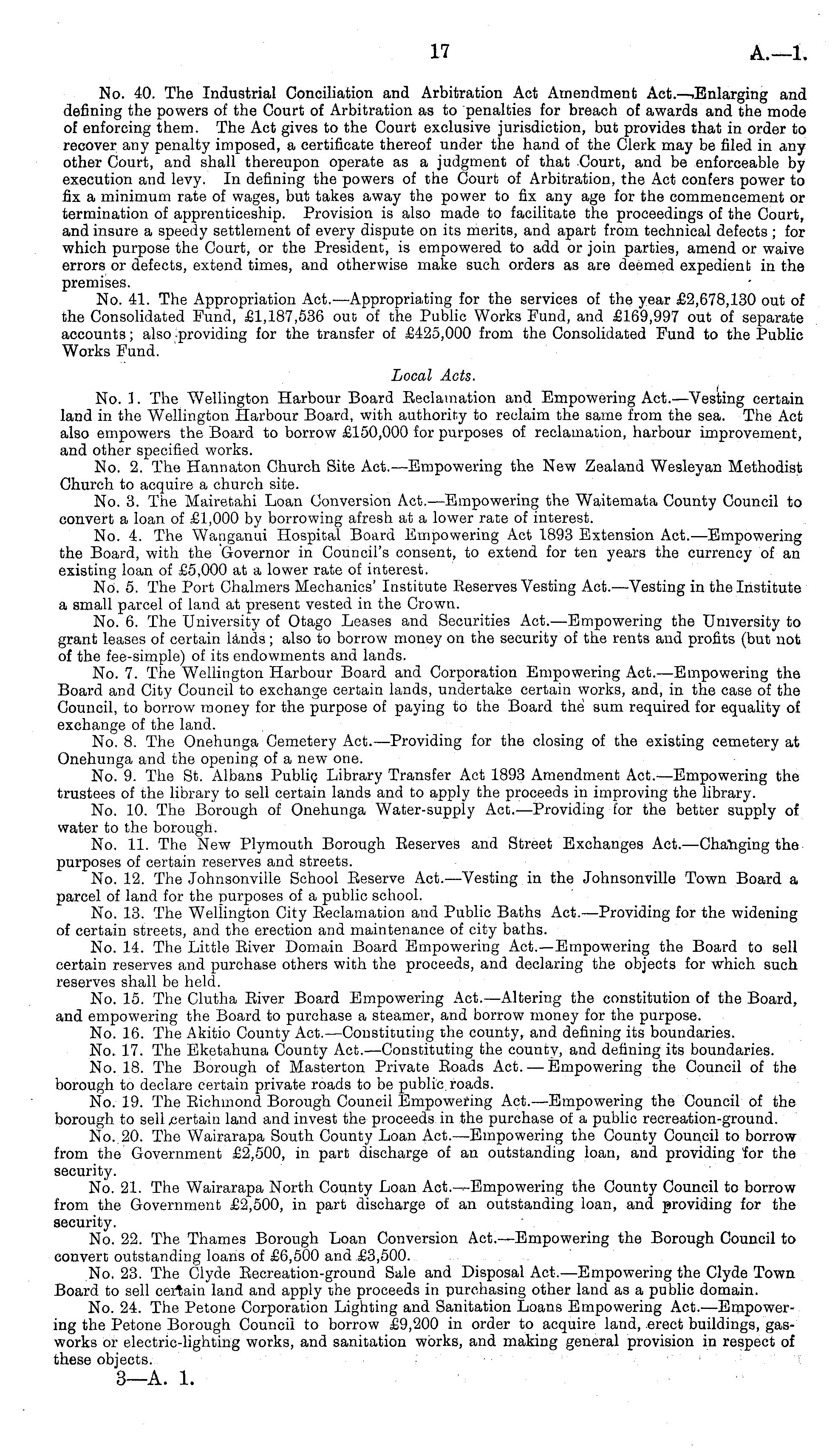 No. 40. The Industrial Conciliation and Arbitration Act Amendment Act.—ißnlarging and defining the powers of the Court of Arbitration as to penalties for breach of awards and the mode of enforcing them. The Act gives to the Court exclusive jurisdiction, but provides that in order to recover any penalty imposed, a certificate thereof under the hand of the Clerk may be filed in any other Court, and shall thereupon operate as a judgment of that Court, and be enforceable by execution and levy. In defining the powers of the Court of Arbitration, the Act confers power to fix a minimum rate of wages, but takes away the power to fix any age for the commencement or termination of apprenticeship. Provision is also made to facilitate the proceedings of the Court, and insure a speedy settlement of every dispute on its merits, and apart from technical defects ; for which purpose the Court, or the President, is empowered to add or join parties, amend or waive errors or defects, extend times, and otherwise make such orders as are deemed expedient in the premises. No. 41. The Appropriation Act. —Appropriating for the services of the year £2,678,130 out of the Consolidated Fund, £1,187,536 out of the Public Works Fund, and £169,997 out of separate accounts; also providing for the transfer of £425,000 from the Consolidated Fund to the Public Works Fund. Local Acts. No. 1. The Wellington Harbour Board Reclamation and Empowering Act.—Vesting certain land in the Wellington Harbour Board, with authority to reclaim the same from the sea. The Act also empowers the Board to borrow £150,000 for purposes of reclamation, harbour improvement, and other specified works. No. 2. The Hannaton Church Site Act.—Empowering the New Zealand Wesleyan Methodist Church to acquire a church site. No. 3. The Mairetahi Loan Conversion Act. —Empowering the Waitemata County Council to convert a loan of £1,000 by borrowing afresh at a lower rate of interest. No. 4. The Wanganui Hospital Board Empowering Act 1893 Extension Act.—Empowering the Board, with the Governor in Council's consent, to extend for ten years the currency of an existing loan of £5,000 at a lower rate of interest. No. 5. The Port Chalmers Mechanics' Institute Reserves Vesting Act. —■ Vesting in the Institute a small parcel of land at present vested in the Crown. No. 6. The University of Otago Leases and Securities Act.—Empowering the University to grant leases of certain lands; also to borrow money on the security of the rents and profits (but not of the fee-simple) of its endowments and lands. No. 7. The Wellington Harbour Board and Corporation Empowering Act.—Empowering the Board and City Council to exchange certain lands, undertake certain works, and, in the case of the Council, to borrow money for the purpose of paying to the Board the sum required for equality of exchange of the land. No. 8. The Onehunga Cemetery Act.—Providing for the closing of the existing cemetery at Onehunga and the opening of a new one. No. 9. The St. Albans Public Library Transfer Act 1893 Amendment Act.—Empowering the trustees of the library to sell certain lands and to apply the proceeds in improving the library. No. 10. The Borough of Onehunga Water-supply Act.—Providing for the better supply of water to the borough. No. 11. The New Plymouth Borough Reserves and Street Exchanges Act.—Changing the purposes of certain reserves and streets. No. 12. The Johnsonville School Reserve Act.—Vesting in the Johnsonville Town Board a parcel of land for the purposes of a public school. No. 13. The Wellington City Reclamation and Public Baths Act.—Providing for the widening of certain streets, and the erection and maintenance of city baths. No. 14. The Little River Domain Board Empowering Act. —Empowering the Board to sell certain reserves and purchase others with the proceeds, and declaring the objects for which such reserves shall be held. No. 15. The Clutha River Board Empowering Act. —Altering the constitution of the Board, and empowering the Board to purchase a steamer, and borrow money for the purpose. No. 16. The Akitio County Act. —Constituting the county, and defining its boundaries. No. 17. The Eketahuna County Act.—Constituting the county, and defining its boundaries. No. 18. The Borough of Masterton Private Roads Act. — Empowering the Council of the borough to declare certain private roads to be public, roads. No. 19. The Richmond Borough Council Empowering Act.—Empowering the Council of the borough to sell .certain land and invest the proceeds in the purchase of a public recreation-ground. No. 20. The Wairarapa South County Loan Act.—Empowering the County Council to borrow from the Government £2,500, in part discharge of an outstanding loan, and providing for the security. No. 21. The Wairarapa North County Loan the County Council to borrow from the Government £2,500, in part discharge of an outstanding loan, and providing for the security. No. 22. The Thames Borough Loan Conversion Act.—Empowering the Borough Council to convert outstanding loans of £6,500 and £3,500. No. 23. The Clyde Recreation-ground Sale and Disposal Act.—Empowering the Clyde Town Board to sell certain land and apply the proceeds in purchasing other land as a public domain. No. 24. The Petone Corporation Lighting and Sanitation Loans Empowering Act. —Empowering the Petone Borough Council to borrow £9,200 in order to acquire land, erect buildings, gasworks or electric-lighting works, and sanitation works, and making general provision in respect of these objects. 3—A. 1.