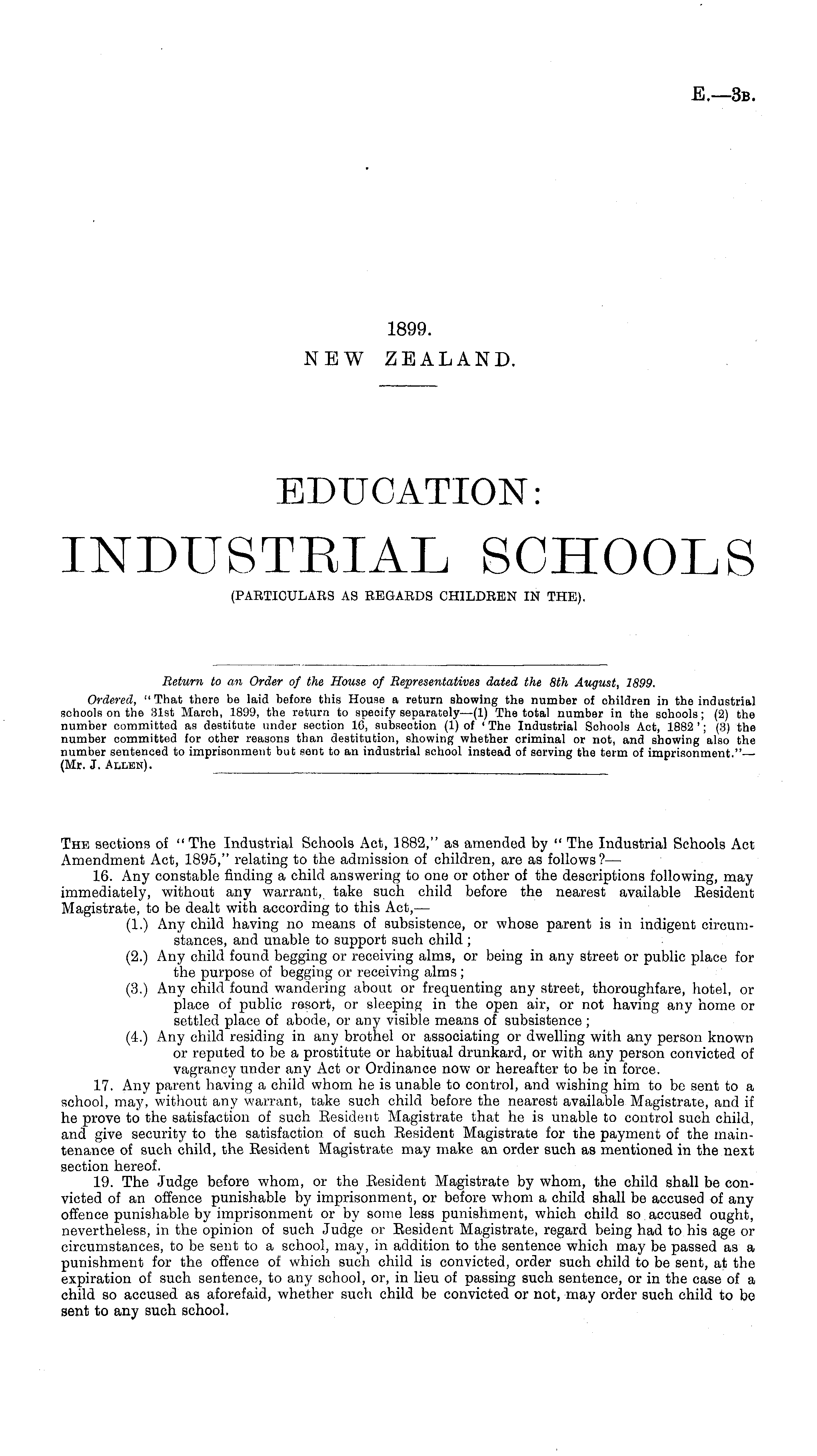 The sections of "The Industrial Schools Act, 1882," as amended by " The Industrial Schools Act Amendment Act, 1895," relating to the admission of children, are as follows ?— 16. Any constable finding a child answering to one or other of the descriptions following, may immediately, without any warrant, take such child before the nearest available Eesident Magistrate, to be dealt with according to this Act, — (1.) Any child having no means of subsistence, or whose parent is in indigent circumstances, and unable to support such child ; (2.) Any child found begging or receiving alms, or being in any street or public place for the purpose of begging or receiving alms; (3.) Any child found wandering about or frequenting any street, thoroughfare, hotel, or place of public resort, or sleeping in the open air, or not having any home or settled place of abode, or any visible means of subsistence ; {_.) Any child residing in any brothel or associating or dwelling with any person known or reputed to be a prostitute or habitual drunkard, or with any person convicted of vagrancy under any Act or Ordinance now or hereafter to be in force. 17. Any parent having a child whom he is unable to control, and wishing him to be sent to a school, may, without any warrant, take such child before the nearest available Magistrate, and if he prove to the satisfaction of such Eesident Magistrate that he is unable to control such child, and give security to the satisfaction of such Eesident Magistrate for the payment of the maintenance of such child, the Eesident Magistrate may make an order such as mentioned in the next section hereof. 19. The Judge before whom, or the Eesident Magistrate by whom, the child shall be convicted of an offence punishable by imprisonment, or before whom a child shall be accused of any offence punishable by imprisonment or by some less punishment, which child so accused ought, nevertheless, in the opinion of such Judge or Eesident Magistrate, regard being had to his age or circumstances, to be sent to a school, may, in addition to the sentence which may be passed as a punishment for the offence of which such child is convicted, order such child to be sent, at the expiration of such sentence, to any school, or, in lieu of passing such sentence, or in the case of a child so accused as aforefaid, whether such child be convicted or not, may order such child to bo sent to any such school.