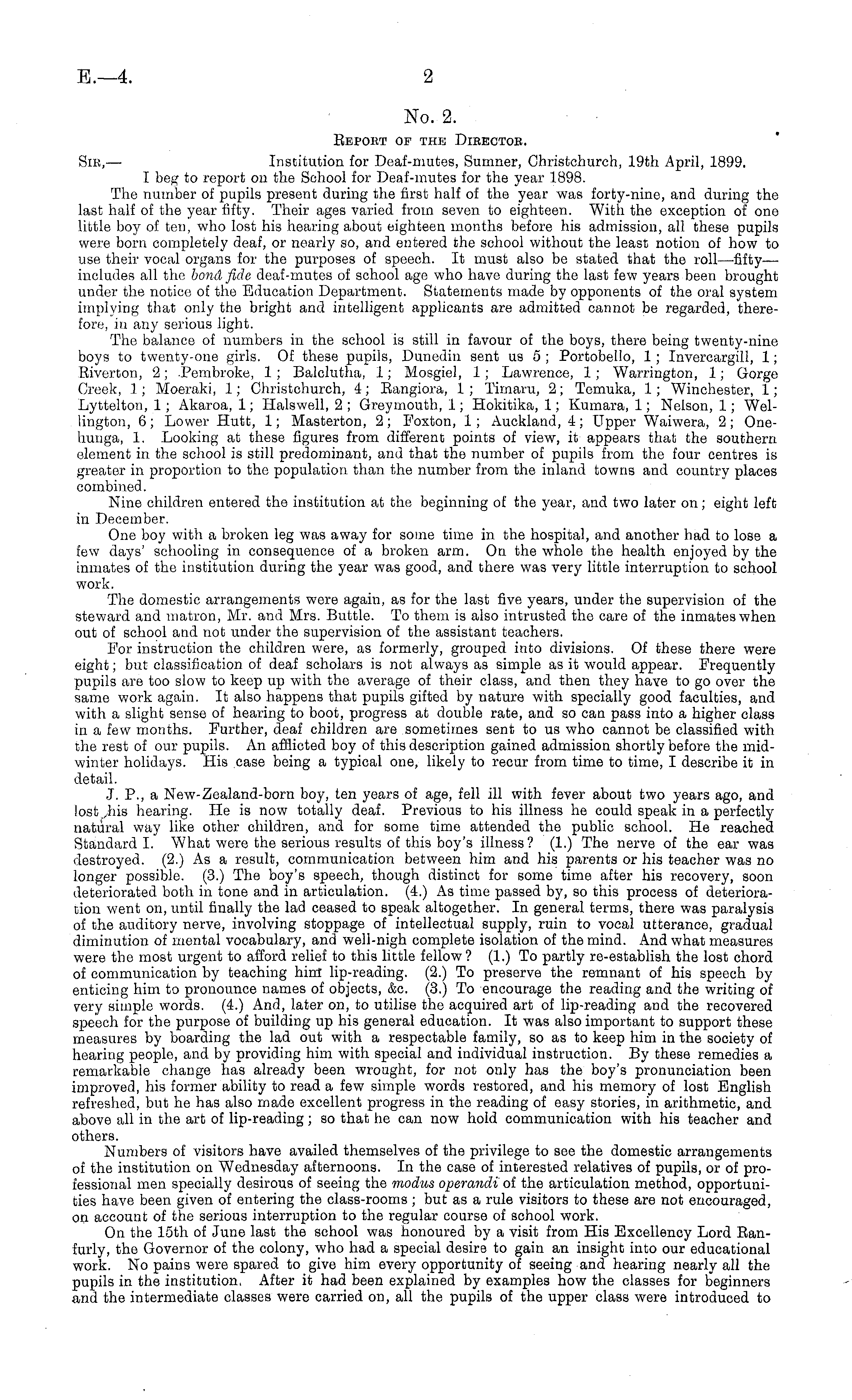 No. 2. Report of the Dieectoe. Sic, — Institution for Deaf-mutes, Sumner, Christchurch, 19th April, 1899. I beg to report on the School for Deaf-mutes for the year 1898. The number of pupils present during the first half of the year was forty-nine, and during the last half of the year fifty. Their ages varied from seven to eighteen. With the exception of one little boy of ten, who lost his hearing about eighteen months before his admission, all these pupils were born completely deaf, or nearly so, and entered the school without the least notion of how to use their vocal organs for the purposes of speech. It must also be stated that the roll—-fifty— includes all the bond fide deaf-mutes of school age who have during the last few years been brought under the notice of the Education Department. Statements made by opponents of the oral system implying that only the bright and intelligent applicants are admitted cannot be regarded, therefore, in any serious light. The balance of numbers in the school is still in favour of the boys, there being twenty-nine boys to twenty-one girls. Of these pupils, Dunedin sent us 5 ; Portobello, 1 ; Invercargill, 1; Riverton, 2; .Pembroke, 1 ; Balclutha, 1; Mosgiel, 1 ; Lawrence, 1 ; Warrington, 1; Gorge Creek, 1; Moeraki, 1; Christchurch, 4; Rangiora, 1 ; Timaru, 2; Temuka, 1; Winchester, 1; Lyttelton, 1; Akaroa, 1; Halswell, 2 ; Greymouth, 1; Hokitika, 1; Kumara, 1; Nelson, 1; Wellington, 6; Lower Hutt, 1; Masterton, 2; Foxton, 1 ; Auckland, i ; Upper Waiwera, 2; Onehunga, 1. Looking at these figures from different points of view, it appears that the southern element in the school is still predominant, and that the number of pupils from the four centres is greater in proportion to the population than the number from the inland towns and country places combined. Nine children entered the institution at the beginning of the year, and two later on; eight left in December. One boy with a broken leg was away for some time in the hospital, and another had to lose a few days' schooling in consequence of a broken arm. On the whole the health enjoyed by the inmates of the institution during the year was good, and there was very little interruption to school work. The domestic arrangements were again, as for the last five years, under the supervision of the steward and matron, Mr. and Mrs. Buttle. To them is also intrusted the care of the inmates when out of school and not under the supervision of the assistant teachers. For instruction the children were, as formerly, grouped into divisions. Of these there were eight; but classification of deaf scholars is not always as simple as it would appear. Frequently pupils are too slow to keep up with the average of their class, and then they have to go over the same work again. It also happens that pupils gifted by nature with specially good faculties, and with a slight sense of hearing to boot, progress at double rate, and so can pass into a higher class in a few months. Further, deaf children are sometimes sent to us who cannot be classified with the rest of our pupils. An afflicted boy of this description gained admission shortly before the midwinter holidays. His case being a typical one, likely to recur from time to time, I describe it in detail. J. P., a New-Zealand-born boy, ten years of age, fell ill with fever about two years ago, and lost his hearing. He is now totally deaf. Previous to his illness he could speak in a perfectly natural way like other children, and for some time attended the public school. He reached Standard I. What were the serious results of this boy's illness? (1.) The nerve of the ear was destroyed. (2.) As a result, communication between him and his parents or his teacher was no longer possible. (3.) The boy's speech, though distinct for some time after his recovery, soon deteriorated both in tone and in articulation. (4.) As time passed by, so this process of deterioration went on, until finally the lad ceased to speak altogether. In general terms, there was paralysis of the auditory nerve, involving stoppage of intellectual supply, ruin to vocal utterance, gradual diminution of mental vocabulary, and well-nigh complete isolation of the mind. And what measures were the most urgent to afford relief to this little fellow? (1.) To partly re-establish the lost chord of communication by teaching him lip-reading. (2.) To preserve the remnant of his speech by enticing him to pronounce names of objects, &c. (3.) To encourage the reading and the writing of very simple words. (4.) And, later on, to utilise the acquired art of lip-reading and the recovered speech for the purpose of building up his general education. It was also important to support these measures by boarding the lad out with a respectable family, so as to keep him in the society of hearing people, and by providing him with special and individual instruction. By these remedies a remarkable change has already been wrought, for not only has the boy's pronunciation been improved, his former ability to read a few simple words restored, and his memory of lost English refreshed, but he has also made excellent progress in the reading of easy stories, in arithmetic, and above all in the art of lip-reading; so that he can now hold communication with his teacher and others. Numbers of visitors have availed themselves of the privilege to see the domestic arrangements of the institution on Wednesday afternoons. In the case of interested relatives of pupils, or of professional men specially desirous of seeing the modus operandi ol the articulation method, opportunities have been given of entering the class-rooms ; but as a rule visitors to these are not encouraged, on account of the serious interruption to the regular course of school work. On the 15th of June last the school was honoured by a visit from His Excellency Lord Ranfurly, the Governor of the colony, who had a special desire to gain an insight into our educational work. No pains were