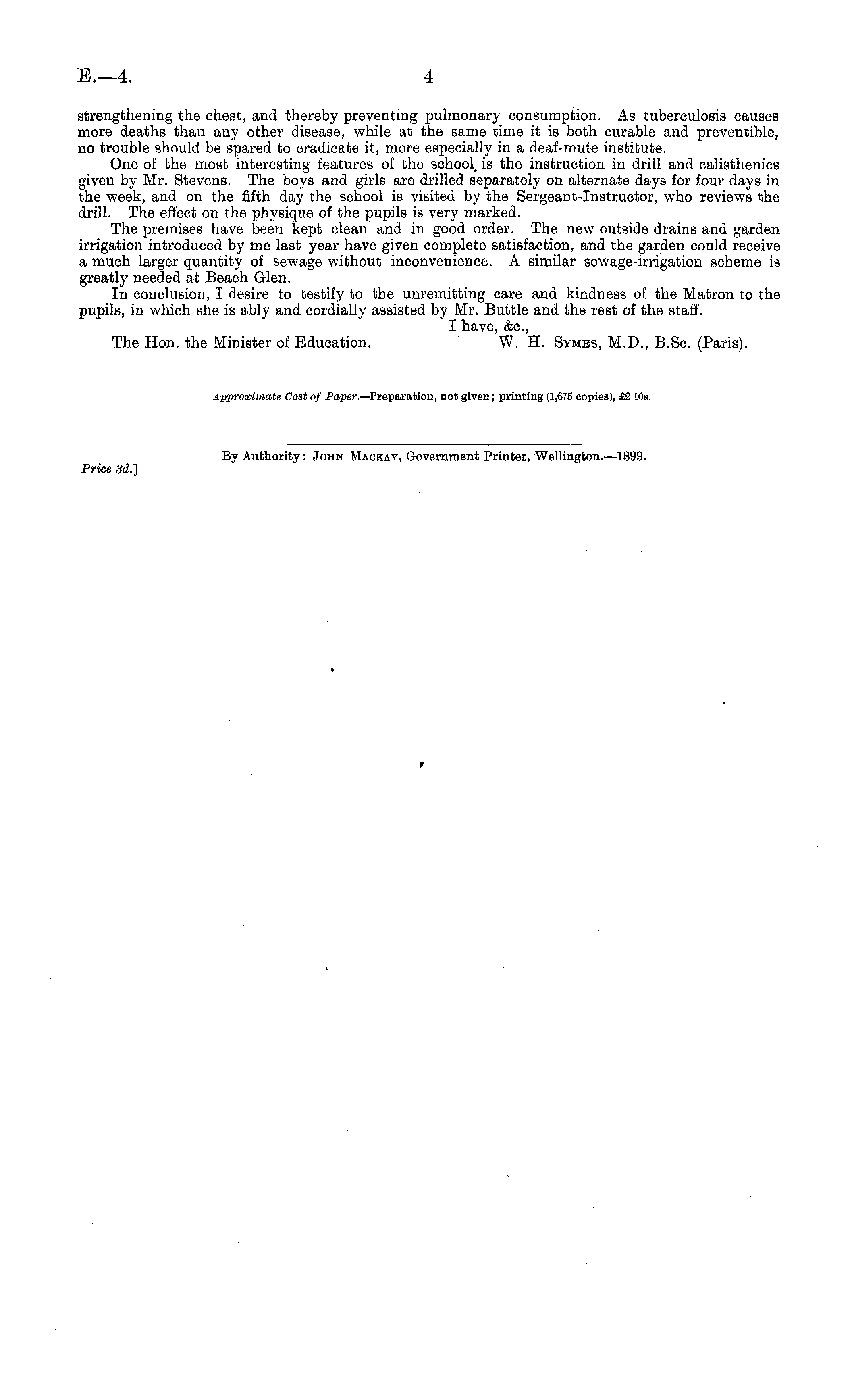strengthening the chest, and thereby preventing pulmonary consumption. As tuberculosis causes more deaths than any other disease, while at the same time it is both curable and preventible, no trouble should be spared to eradicate it, more especially in a deaf-mute institute. One of the most interesting features of the school, is the instruction in drill and calisthenics given by Mr. Stevens. The boys and girls are drilled separately on alternate days for four days in the week, and on the fifth day the school is visited by the Sergeant-Instructor, who reviews the drill. The effect on the physique of the pupils is very marked. The premises have been kept clean and in good order. The new outside drains and garden irrigation introduced by me last year have given complete satisfaction, and the garden could receive a much larger quantity of sewage without inconvenience. A similar sewage-irrigation scheme is greatly needed at Beach Glen. In conclusion, I desire to testify to the unremitting care and kindness of the Matron to the pupils, in which she is ably and cordially assisted by Mr. Buttle and the rest of the staff. I have, &c, The Hon. the Minister of Education. W. H. Symes, M.D., B.Sc. (Paris). Approximate Cost of Paper. —Preparation, not given; printing (1,675 copies), £2 10s.