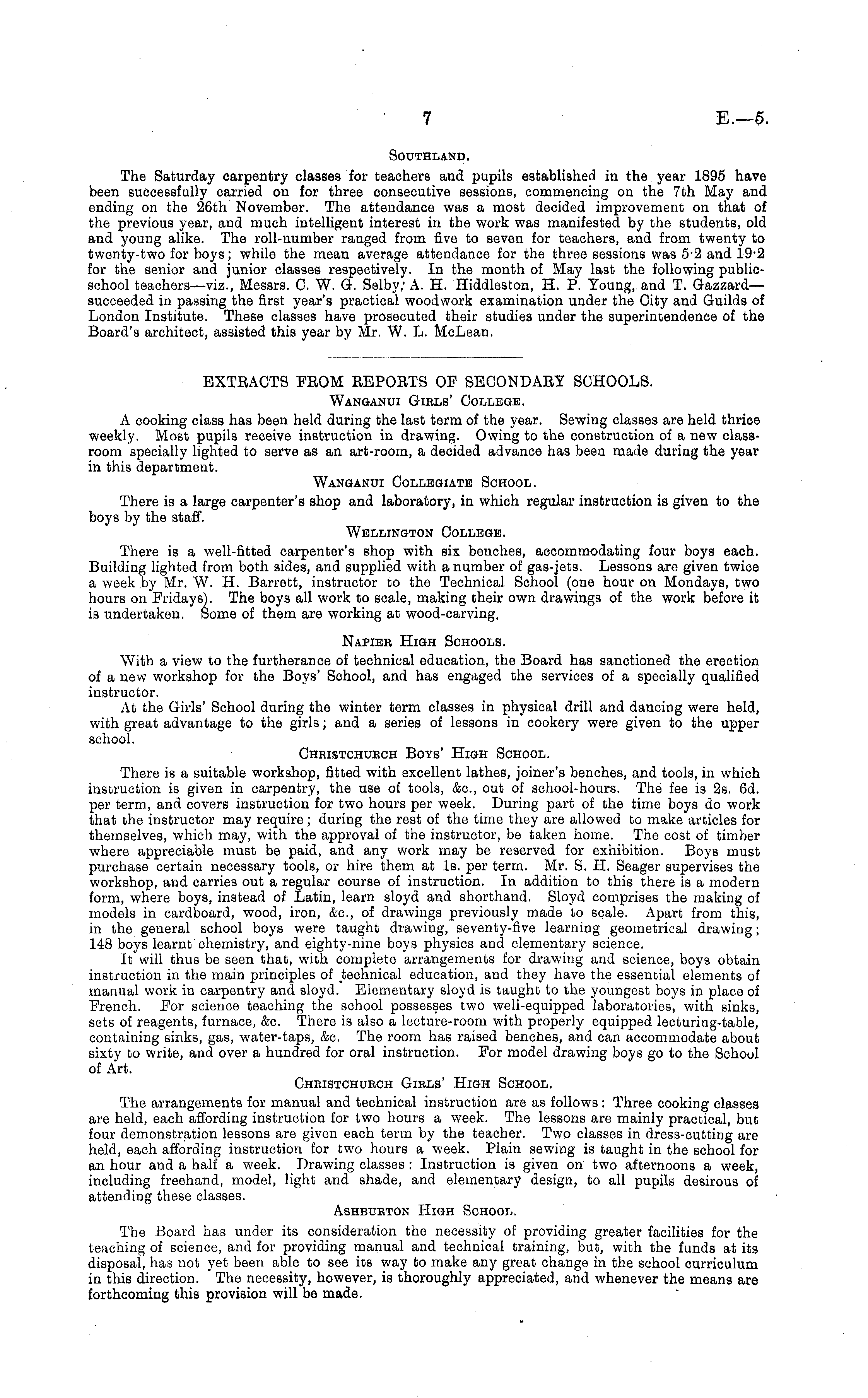 Southland. The Saturday carpentry classes for teachers and pupils established in the year 1895 have been successfully carried on for three consecutive sessions, commencing on the 7th May and ending on the 26th November. The attendance was a most decided improvement on that of the previous year, and much intelligent interest in the work was manifested by the students, old and young alike. The roll-number ranged from five to seven for teachers, and from twenty to twenty-two for boys; while the mean average attendance for the three sessions was 5-2 and 19-2 for the senior and junior classes respectively. In the month of May last the following publicschool teachers—viz., Messrs. C. W. G. Selby; A. H. Hiddleston, H. P. Young, and T. Gazzard— succeeded in passing the first year's practical woodwork examination under the City and Guilds of London Institute. These classes have prosecuted their studies under the superintendence of the Board's architect, assisted this year by Mr. W. L. McLean.