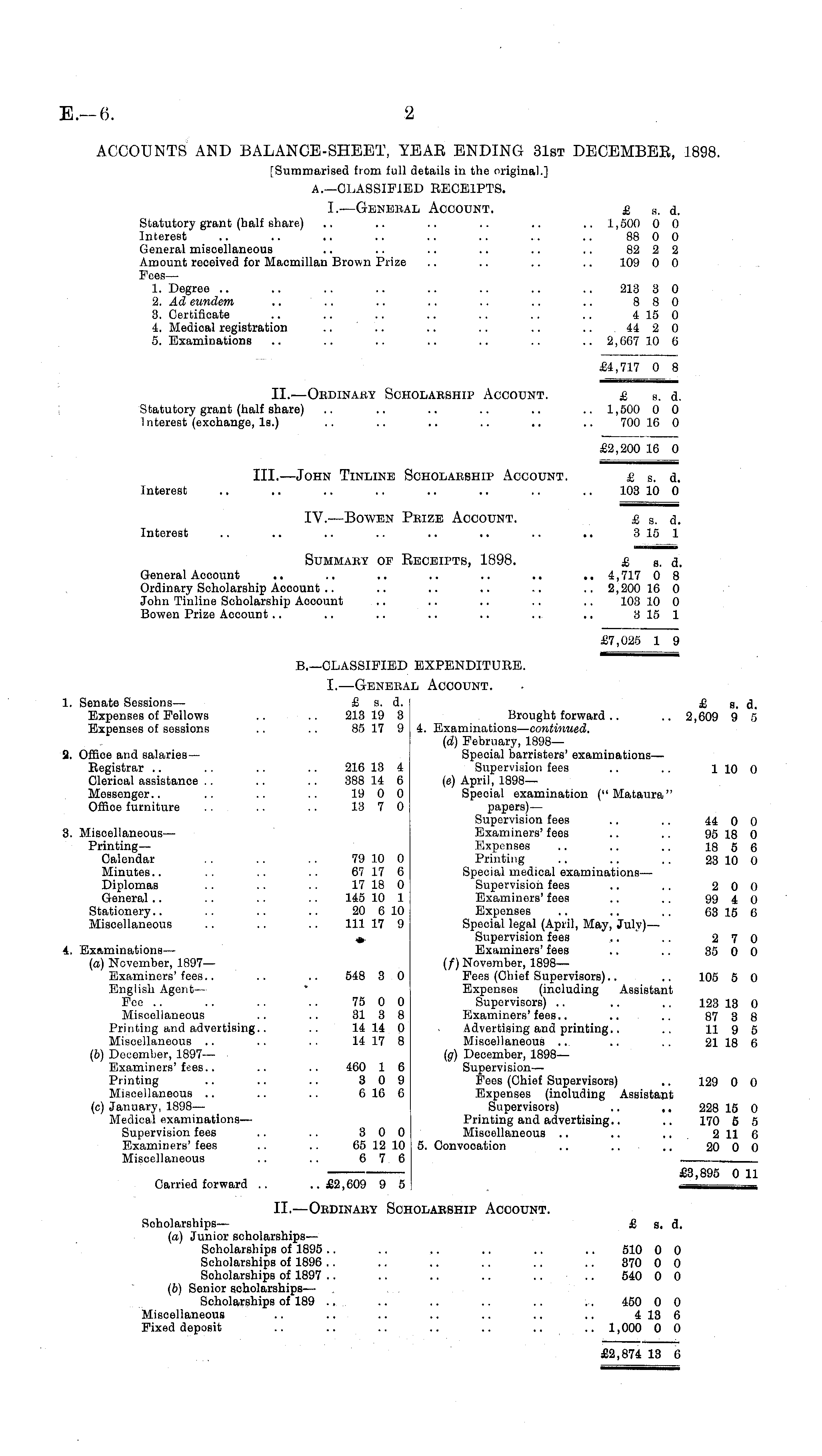 ACCOUNTS AND BALANCE-SHEET, YEAE ENDING 31st DECEMBEE, J B9B. [Summarised from full details in the original.] A.—CLASSIFIED EECEIPTS. I.—Genebal Account. £ s . d. Statutory grant (half share) .. .. .. .. .. .. 1,500 0 0 Interest .. .. .. .. .. .. ... .. 88 0 0 General miscellaneous .. .. .. .. .. .. 82 2 2 Amount received for Macmillan Brown Prize .. .. .. .. 109 0 0 Pees— 1. Degree .. .. .. .. .. .. .. .. 213 3 0 2. Ad eundem .. .. .. .. .. .. .. 880 3. Certificate .. .. .. .. .. .. .. 415 0 4. Medical registration .. .. .. .. .. .. 44 2 0 5. Examinations .. .. .. .. .. .. .. 2,667 10 6 £4,717 0 8 ll.—Oedinaby Scholabship Account. £ B . d. Statutory grant (half share) .. .. .. .. .. .. 1,500 0 0 Interest (exchange, Is.) .. .. .. .. .. .. 700 16 0 £2,200 16 0 lll.—John Tinline Scholarship Account. £ g. d. Interest .. .. .. .. .. .. .. .. 103 10 0 IV.—Bowen Pbizb Account. £ s. d. Interest .. .. .. .. .. .. .. .. 3 15 1 SuMMABY OF EECEIPTS, 1898. £ S. d. General Account .. .. .. .. .. .. .. 4,717 0 8 Ordinary Scholarship Account .. .. .. .. .. .. 2,200 16 0 John Tinline Scholarship Acoount .. .. .. .. .. 103 10 0 Bowen Prize Account .. .. .. .. .. .. .. 3 15 1 £7,025 1 9 B.—CLASSIFIED EXPENDITURE. I.—Genebal Account. 1. Senate Sessions— £ s. d. £ s, jl. Expenses of Fellows .. .. 213 19 3 Brought forward .. .. 2,609 9 5 Expenses of sessions .. .. 85 17 9 4. Examinations— continued, (d) February, 1898— 2. Office and salaries — Special barristors' examinations— Eegistrar .. .. .. .. 216 13 4 Supervision fees .. .. 110 0 Clerical assistance .. .. .. 388 14 6 (c) April, 1898— Messenger.. .. .. .. 19 0 0 Special examination ("Mataura" Offioe furniture .. .. .. 13 7 0 papers)— Supervision fees .. .. 44 0 0 3. Miscellaneous — Examiners' fees .. .. 95 18 0 Printing— Expenses .. .. .. 18 5 6 Calendar .. .. .. 79 10 0 Printing .. .. .. 23 10 0 Minutes.. .. .. .. 67 17 6 Special medical examinations— Diplomas .. .. .. 17 18 0 Supervision fees .. .. 2 0 0 General .. .. .. .. 145 10 1 Examiners' fees .. .. 99 4 0 Stationery.. .. .. .. 20 6 10 Expenses .. .. .. 63 15 6 Miscellaneous .. .. .. 11l 17 9 Special legal (April, May, July) — * Supervision fees .. .. 2 7 0 4. Examinations — Examiners' fees .. .. 35 0 0 (a) November, 1897— (/) November, 1898— Examiners'fees.. .. .. 548 3 0 Fees (Chief Supervisors).. .. 105 5 0 English Agent— Expenses (including Assistant Fes .. .. .. .. 75 0 0 Supervisors) .. .. .. 123 13 0 Miscellaneous .. .. 31 3 8 Examiners' fees.. .. .. 87 3 8 Printing and advertising.. .. 14 14 0 . Advertising and printing.. .. 11 9 5 Miscellaneous .. .. .. 14 17 8 Miscellaneous .. .. .. 21 18 6 (6) December, 1897— (g) December, 1898— Examiners'fees.. .. .. 460 1 6 Supervision— Printing .. .. .. 3 0 9 Fees (Chief Supervisors) .. 129 0 0 Miscellaneous .. .. .. 616 6 Expenses (including Assistant (c) January, 1898 — Supervisors) .. .. 228 15 0 Medical examinations— Printing and advertising.. .. 170 5 5 Supervision fees .. .. 3 0 0 Miscellaneous .. .. ~ 211 6 Examiners' fees .. .. 65 12 10 5. Convocation .. .. .. 20 0 0 Miscellaneous .. .. 6 7 6 . £3,895 0 11 Carried forward .. ..£2,609 9 5 *—s—s——sm ll.—Oedinaby Scholabship Account. Scholarships— £ s. d. (a) Junior scholarships— Scholarships of 1895 .. .. .. .. .. .. 510 0 0 Scholarships of 1896 .. .. .. .. .. .. 370 0 0 Scholarships of 1897 .. .. .. .. .. .. 540 0 0 (6) Senior scholarships— .. Scholarships of 189 .. .. .. .. .. .. ... 450 0 0 Miscellaneous .. .. .. .. .. .. .. 4 13 6 Fixed deposit .. .. .. .. .. .. .. 1,000 0 0 £2,874 13 6