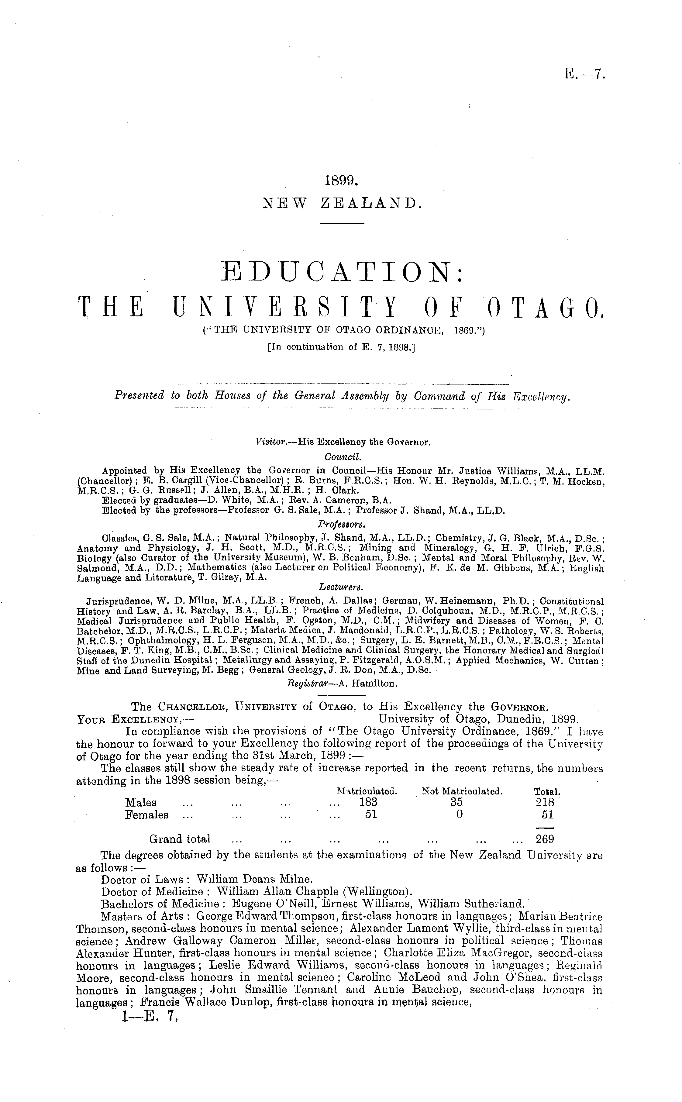 EDUCATION: THE UNIVERSITY OF OTAGO. ("THE UNIVERSITY OF OTAGO ORDINANCE, 1869.") [In continuation of E.-7, 1898.]