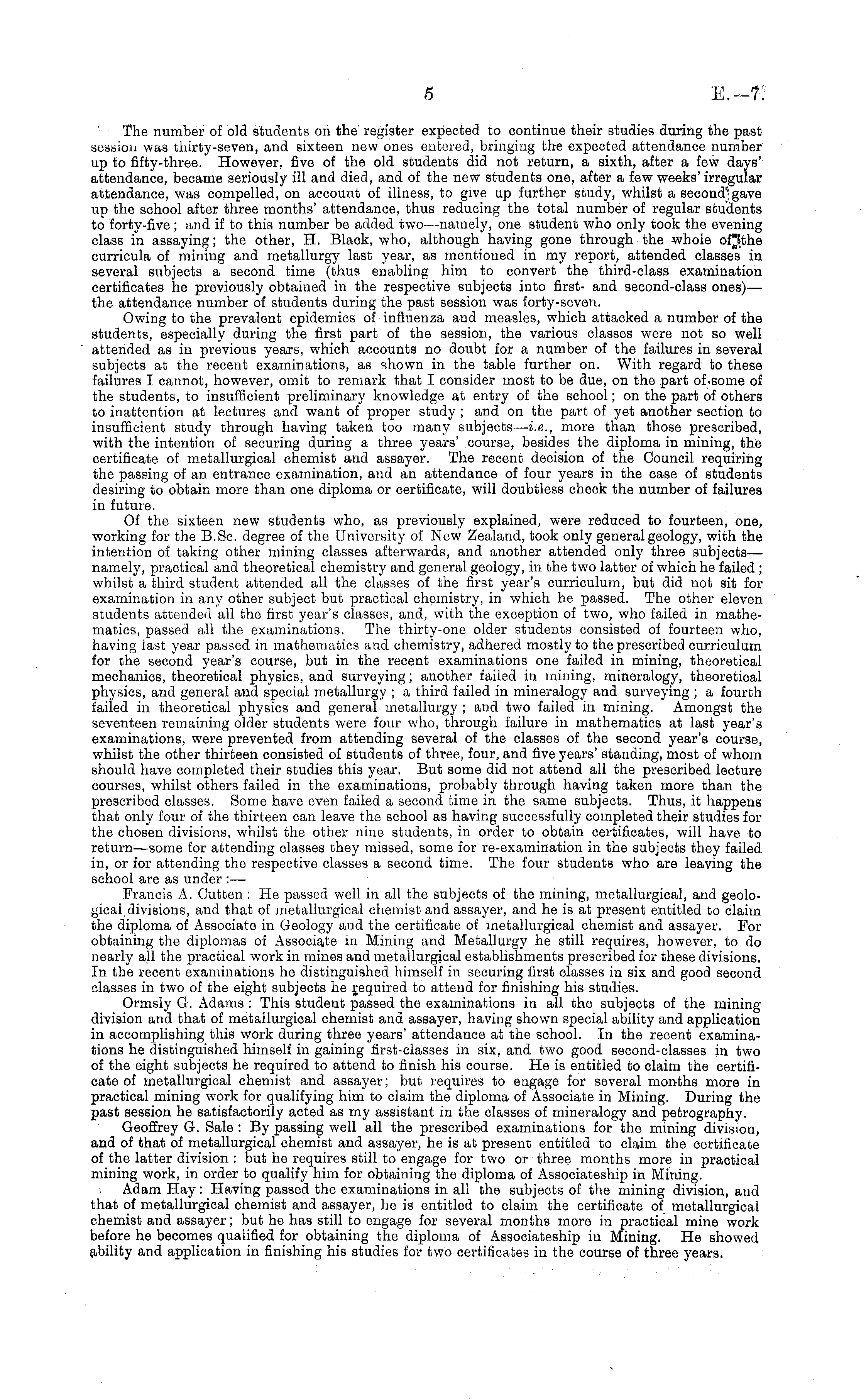 The number of old students on the register expected to continue their studies during the past session was thirty-seven, and sixteen new ones entered, bringing the expected attendance number up to fifty-three. However, five of the old students did not return, a sixth, after a few days' attendance, became seriously ill and died, and of the new students one, after a few weeks'irregular attendance, was compelled, on account of illness, to give up further study, whilst a second'gave up the school after three months' attendance, thus reducing the total number of regular students to forty-five; and if to this number be added two—namely, one student who only took the evening class in assaying; the other, H. Black, who, although having gone through the whole curricula of mining and metallurgy last year, as mentioned in my report, attended classes in several subjects a second time (thus enabling him to convert the third-class examination certificates he previously obtained in the respective subjects into first- and second-class ones) — the attendance number of students during the past session was forty-seven. Owing to the prevalent epidemics of influenza and measles, which attacked a number of the students, especially during the first part of the session, the various classes were not so well attended as in previous years, which accounts no doubt for a number of the failures in several subjects at the recent examinations, as shown in the table further on. With regard to these failures I cannot, however, omit to remark that I consider most to be due, on the part of .some of the students, to insufficient preliminary knowledge at entry of the school; on the part of others to inattention at lectures and want of proper study; and on the part of yet another section to insufficient study through having taken too many subjects— i.e., more than those prescribed, with the intention of securing during a three years' course, besides the diploma in mining, the certificate of metallurgical chemist and assayer. The recent decision of the Council requiring the passing of an entrance examination, and an attendance of four years in the case of students desiring to obtain more than one diploma or certificate, will doubtless check the number of failures in future. Of the sixteen new students who, as previously explained, were reduced to fourteen, one, working for the B.Sc. degree of the University of New Zealand, took only general geology, with the intention of taking other mining classes afterwards, and another attended only three subjects— namely, practical and theoretical chemistry and general geology, in the two latter of which he failed ; whilst a third student attended all the classes of the first year's curriculum, but did not sit for examination in any other subject but practical chemistry, in which he passed. The other eleven students attended all the first year's classes, and, with the exception of two, who failed in mathematics, passed all the examinations. The thirty-one older students consisted of fourteen who, having last year passed in mathematics and chemistry, adhered mostly to the prescribed curriculum for the second year's course, but in the recent examinations one failed in mining, theoretical mechanics, theoretical physics, and surveying; another failed in mining, mineralogy, theoretical physics, and general and special metallurgy ; a third failed in mineralogy and surveying ; a fourth failed in theoretical physics and general metallurgy ; and two failed in mining. Amongst the seventeen remaining older students were four who, through failure in mathematics at last year's examinations, were prevented from attending several of the classes of the second year's course, whilst the other thirteen consisted of students of three, four, and five years' standing, most of whom should have completed their studies this year. But some did not attend all the prescribed lecture courses, whilst others failed in the examinations, probably through having taken more than the prescribed classes. Some have even failed a second time in the same subjects. Thus, it happens that only four of the thirteen can leave the school as having successfully completed their studies for the chosen divisions, whilst the other nine students, in order to obtain certificates, will have to return —some for attending classes they missed, some for re-examination in the subjects they failed in, or for attending the respective classes a second time. The four students who are leaving the school are as under :— Francis A. Gutten : He passed well in all the subjects of the mining, metallurgical, and geological, divisions, and that of metallurgical chemist and assayer, and he is at present entitled to claim the diploma of Associate in Geology and the certificate of metallurgical chemist and assayer. For obtaining the diplomas of Associate in Mining and Metallurgy he still requires, however, to do nearly all the practical work in mines and metallurgical establishments prescribed for these divisions. In the recent examinations he distinguished himself in securing first classes in six and good second classes in two of the eight subjects he required to attend for finishing his studies. Ormsly G. Adams : This student passed the examinations in all the subjects of the mining division and that of metallurgical chemist and assayer, having shown special ability and application in accomplishing this work during three years' attendance at the school. In the recent examinations he distinguished himself in gaining first-classes in six, and two good second-classes in two of the eight subjects he required to attend to finish his course. He is entitled to claim the certificate of metallurgical chemist and assayer; but requires to engage for several months more in practical mining work for qualifying him to claim the diploma of Associate in Mining. During the past session he satisfactorily acted as my assistant in the classes of mineralogy and petrogra