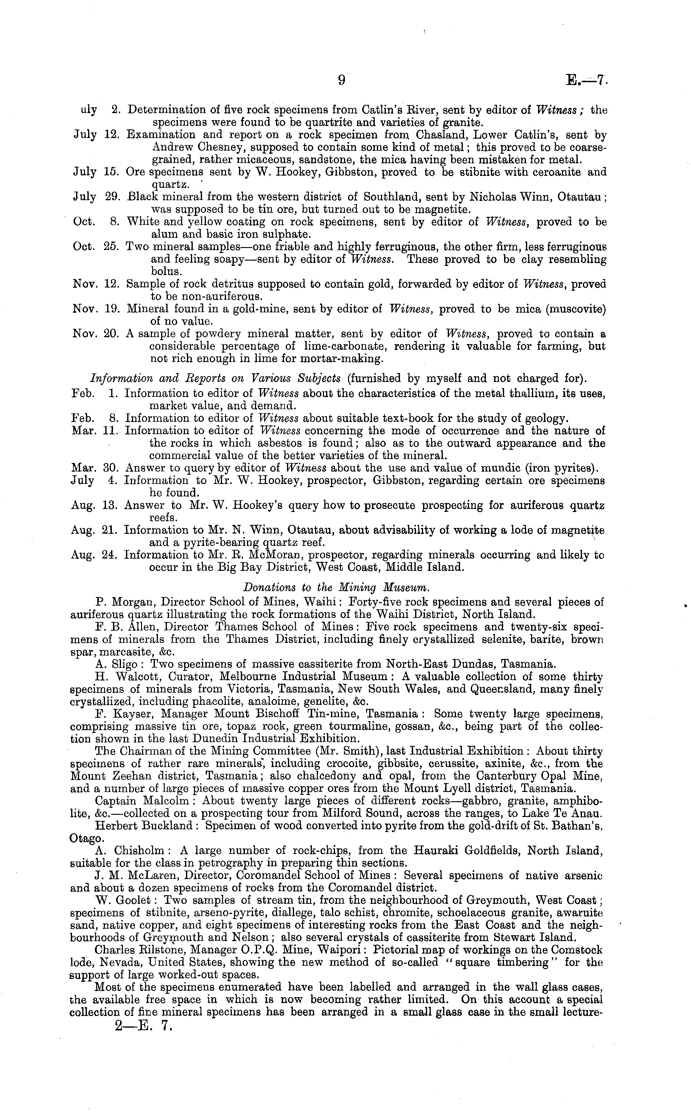 uly 2. Determination of five rock specimens from Catlin's Eiver, sent by editor of Witness; the specimens were found to be quartrite and varieties of granite. July 12. Examination and report on a rock specimen from Chasland, Lower Catlin's, sent by Andrew Ohesney, supposed to contain some kind of metal; this proved to be coarsegrained, rather micaceous, sandstone, the mica having been mistaken for metal. July 15. Ore specimens sent by W. Hookey, Gibbston, proved to be stibnite with ceroanite and quartz. July 29. Black mineral from the western district of Southland, sent by Nicholas Winn, Otautau ; was supposed to be tin ore, but turned out to be magnetite. Oct. 8. White and yellow coating on rock specimens, sent by editor of Witness, proved to be alum and basic iron sulphate. Oct. 25. Two mineral samples—one friable and highly ferruginous, the other firm, less ferruginous and feeling soapy—sent by editor of Witness. These proved to be clay resembling bolus. Nov. 12. Sample of rock detritus supposed to contain gold, forwarded by editor of Witness, proved to be non-auriferous. Nov. 19. Mineral found in a gold-mine, sent by editor of Witness, proved to be mica (muscovite) of no value. Nov. 20. A sample of powdery mineral matter, sent by editor of Witness, proved to contain a considerable percentage of lime-carbonate, rendering it valuable for farming, but not rich enough in lime for mortar-making. Information and Reports on Various Subjects (furnished by myself and not charged for). Feb. 1. Information to editor of Witness about the characteristics of the metal thallium, its uses, market value, and demand. Feb. 8. Information to editor of Witness about suitable text-book for the study of geology. Mar. 11. Information to editor of Witness concerning the mode of occurrence and the nature of the rocks in which asbestos is found; also as to the outward appearance and the commercial value of the better varieties of the mineral. Mar. 30. Answer to query by editor of Witness about the use and value of mundic (iron pyrites). July 4. Information to Mr. W. Hookey, prospector, Gibbston, regarding certain ore specimens he found. Aug. 13. Answer to Mr. W. Hookey's query how to prosecute prospecting for auriferous quartz reefs. Aug. 21. Information to Mr. N. Winn, Otautau, about advisability of working a lode of magnetite and a pyrite-bearing quartz reef. Aug. 24. Information to Mr. E. McMoran, prospector, regarding minerals occurring and likely to occur in the Big Bay District, West Coast, Middle Island. Donations to the Mining Museum. P. Morgan, Director School of Mines, Waihi: Forty-five rock specimens and several pieces of auriferous quartz illustrating the rock formations of the Waihi District, North Island. F. B. Allen, Director Thames School of Mines: Five rock specimens and twenty-six specimens of minerals from the Thames District, including finely crystallized selenite, barite, brown spar, marcasite, &c. A. Sligo : Two specimens of massive cassiterite from North-Bast Dundas, Tasmania. H. Walcott, Curator, Melbourne Industrial Museum : A valuable collection of some thirty specimens of minerals from Victoria, Tasmania, New South Wales, and Queensland, many finely crystallized, including phacolite, analoime, genelite, &c. F. Kayser, Manager Mount Bischoff Tin-mine, Tasmania : Some twenty large specimens, comprising massive tin ore, topaz rock, green tourmaline, gossan, &c, being part of the collection shown in the last Dunedin Industrial Exhibition. The Chairman of the Mining Committee (Mr. Smith), last Industrial Exhibition : About thirty specimens of rather rare minerals* including crocoite, gibbsite, cerussite, axinite, &c, from the Mount Zeehan district, Tasmania; also chalcedony and opal, from the Canterbury Opal Mine, and a number of large pieces of massive copper ores from the Mount Lyell district, Tasmania. Captain Malcolm : About twenty large pieces of different rocks—gabbro, granite, amphibolite, &c. —collected on a prospecting tour from Milford Sound, across the ranges, to Lake Te Anau. Herbert Buckland : Specimen of wood converted into pyrite from the gold-drift of St. Batban's, Otago. A. Chisholm : A large number of rock-chips, from the Hauraki Goldfields, North Island, suitable for the class in petrography in preparing thin sections. J. M. McLaren, Director, Coromandel School of Mines : Several specimens of native arsenic and about a dozen specimens of rocks from the Coromandel district. W. Goolet: Two samples of stream tin, from the neighbourhood of Greymouth, West Coast; specimens of stibnite, arseno-pyrite, diallege, talo schist, chromite, schoelaceous granite, awaruite sand, native copper, and eight specimens of interesting rocks from the East Coast and the neighbourhoods of Greymouth and Nelson; also several crystals of cassiterite from Stewart Island. Charles Eilstone, Manager O.P.Q. Mine, Waipori: Pictorial map of workings on the Comstock lode, Nevada, United States, showing the new method of so-called "square timbering" for the support of large worked-out spaces. Most of the specimens enumerated have been labelled and arranged in the wall glass cases, the available free space in which is now becoming rather limited. On this account a special collection of fine mineral specimens has been arranged in a small glass case in the small lecture2—E. 7.