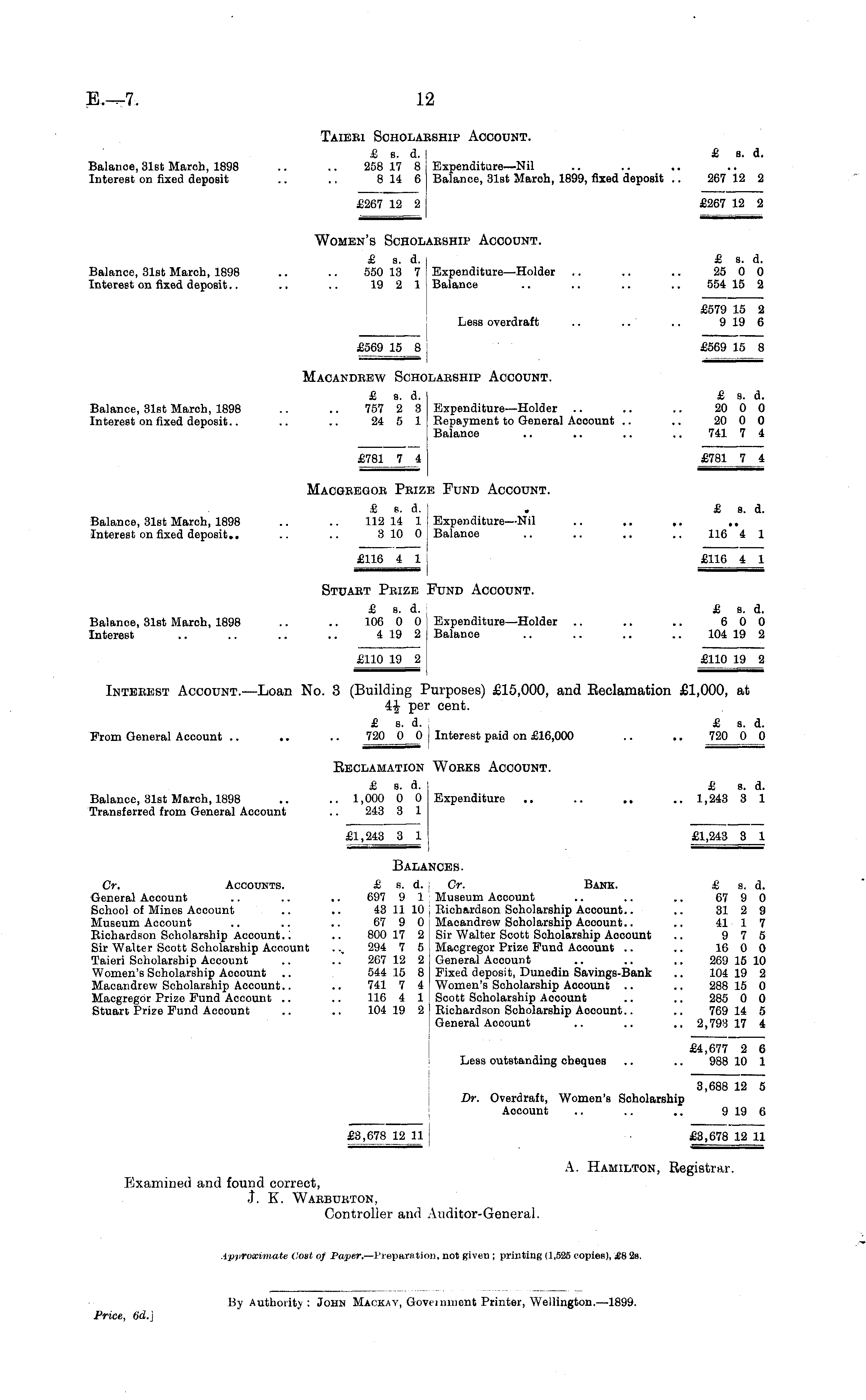 Taieei Scholaeship Account. £ s. d. £ s. d. Balance, 31st March, 1898 .. .. 258 17 8 Expenditure—Nil Interest on fixed deposit .. .. 8 14 6 Balance, 31st Maroh, 1899, fixed deposit .. 267 12 2 £267 12 2 £267 12 2 Women's Scholaeship Account. £ s. d. £ s. d. Balance, 31st March, 1898 .. .. 550 13 7 Expenditure—Holder .. .. .. 25 0 0 Interest on fixed deposit.. .. .. 19 2 1 Balanoe .. .. .. .. 554 15 2 £579 15 2 Less overdraft .. .. .. 9 19 6 £569 15 8 , £569 15 8 Macandeew Scholaeship Account. £ s. d. £ s. d. Balance, 31st March, 1898 .. .. 757 2 3 Expenditure—Holder .. .. .. 20 0 0 Interest on fixed deposit.. .. .. 24 5 1 Bepayment to General Aooount .. .. 20 0 0 Balance .. .. .. .. 741 7 4 £781 7 4 £781 7_4 Macgeegoe Peize Fund Account. £ s. d. . £ s. d. Balance, 31st March, 1898 .. .. 112 14 1 Expenditure—Nil Interest on fixed deposit.. .. .. 3 10 0 Balanoe .. .. .. .. 116 4 1 £116 4 1 £116 4 1 Stuaet Peize Fund Account. £ s. d. £ s. d. Balance, 31st Maroh, 1898 .. .. 106 0 0 Expenditure—Holder .. .. .. 6 0 0 Interest .. .. .. .. 4 19 2 Balanoe .. .. .. .. 104 19 2 £110 19 2 £110 19 2 Inteeest Account.—Loan No. 3 (Building Purposes) £15,000, and Reclamation £1,000, at 4 % per cent. £ s. d. £ s. d. From General Account .. .. .. 720 0 0 j Interest paid on £16,000 .. .. 720 0 0 Eeclamation Woeks Account. £ s. d. £ s. d. Balance, 31st Maroh, 1898 .. .. 1,000 0 0 Expenditure .. .. .. .. 1,243 3 1 Transferred from General Account .. 243 3 1 £1,243 3 1 £1,243 3 1 Balances. Cr. Accounts. £ s. d. Cr. Bank. £ s. d. General Aooount .. .. .. 697 9 1 Museum Account .. .. .. 67 9 0 School of Mines Account .. .. 43 11 10 , Bichardson Scholarship Account.. .. 31 2 9 Museum Account .. .. .. 67 9 0 j Maoandrow Scholarship Aooount.. .. 41 1 7 Bichardson Scholarship Account.; .. 800 17 2 j Sir Walter Scott Scholarship Aooount .. 9 7 5 Sir Walter Scott Scholarship Account . .„ 294 7 5 | Macgregor Prize Fund Aooount .. .. 16 0 0 Taieri Scholarship Account .. .. 267 12 2 General Account .. .. .. 269 15 10 Women's Scholarship Aooount .. 544 15 8 Fixed deposit, Dunedin Savings-Bank .. 104 19 2 Macandrew Scholarship Account.. .. 741 7 4 Women's Scholarship Aooount .. .. 288 15 0 Macgregor Prize Fund Account .. .. 116 4 1 Scott Scholarship Aooount .. .. 285 0 0 Stuart Prize Fund Account .. .. 104 19 2 Bichardson Scholarship Aooount.. .. 769 14 5 General Account .. .. .. 2,793 17 4 £4,677 2 6 Less outstanding cheques .. .. 988 10 1 3,688 12 5 Dr. Overdraft, Women's Scholarship Account .. .. .. 9 19 6 £3,678 12 11 j ■ £3,678 12 11 A. Hamilton, Registrar. Examined and found correct, 3. K. Waebukton, Controller and Auditor-General.