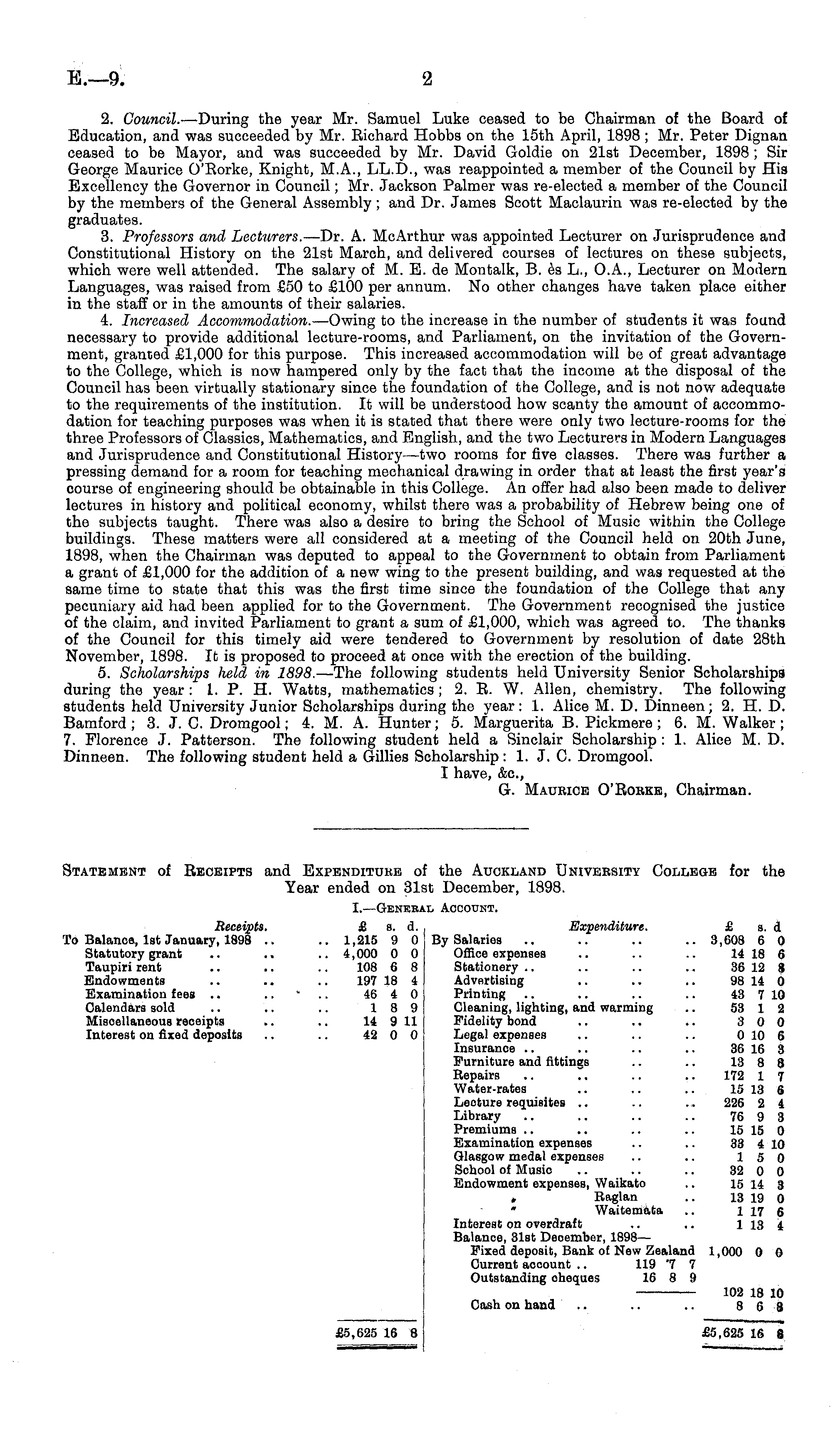 2. Council. —During the year Mr. Samuel Luke ceased to be Chairman of the Board of Education, and was succeeded by Mr. Eichard Hobbs on the 15th April, 1898 ; Mr. Peter Dignan ceased to be Mayor, and was succeeded by Mr. David Goldie on 21st December, 1898 ; Sir George Maurice O'Eorke, Knight, M.A., LL.D., was reappointed a member of the Council by His Excellency the Governor in Council; Mr. Jackson Palmer was re-elected a member of the Council by the members of the General Assembly ; and Dr. James Scott Maclaurin was re-elected by the graduates. 3. Professors and Lecturers. —Dr. A. McArthur was appointed Lecturer on Jurisprudence and Constitutional History on the 21st March, and delivered courses of lectures on these subjects, which were well attended. The salary of M. E. de Montalk, B. es L., 0.A., Lecturer on Modern Languages, was raised from £50 to £100 per annum. No other changes have taken place either in the staff or in the amounts of their salaries. 4. Increased Accommodation. —Owing to the increase in the number of students it was found necessary to provide additional lecture-rooms, and Parliament, on the invitation of the Government, granted £1,000 for this purpose. This increased accommodation will be of great advantage to the College, which is now hampered only by the fact that the income at the disposal of the Council has been virtually stationary since the foundation of the College, and is not now adequate to the requirements of the institution. It will be understood how scanty the amount of accommodation for teaching purposes was when it is stated that there were only two lecture-rooms for the three Professors of Classics, Mathematics, and English, and the two Lecturers in Modern Languages and Jurisprudence and Constitutional History—two rooms for five classes. There was further a pressing demand for a room for teaching mechanical drawing in order that at least the first year's course of engineering should be obtainable in this College. An offer had also been made to deliver lectures in history and political economy, whilst there was a probability of Hebrew being one of the subjects taught. There was also a desire to bring the School of Music within the College buildings. These matters were all considered at a meeting of the Council held on 20th June, 1898, when the Chairman was deputed to appeal to the Government to obtain from Parliament a grant of £1,000 for the addition of a new wing to the present building, and was requested at the same time to state that this was the first time since the foundation of the College that any pecuniary aid had been applied for to the Government. The Government recognised the justice of the claim, and invited Parliament to grant a sum of £1,000, which was agreed to. The thanks of the Council for this timely aid were tendered to Government by resolution of date 28th November, 1898. It is proposed to proceed at once with the erection of the building. 5. Scholarships held in 1898. —The following students held University Senior Scholarships during the year :1. P. H. Watts, mathematics; 2. E. W. Allen, chemistry. The following students held University Junior Scholarships during the year: 1. Alice M. D. Dinneen; 2. H. D. Bamford ; 3. J. C. Dromgool; 4. M. A. Hunter; 5. Marguerita B. Pickmere ; 6. M. Walker ; 7. Florence J. Patterson. The following student held a Sinclair Scholarship :1. Alice M. D. Dinneen. The following student held a Gillies Scholarship :1. J. C. Dromgool. I have, &c, G. Maukice O'Eokkb, Chairman.