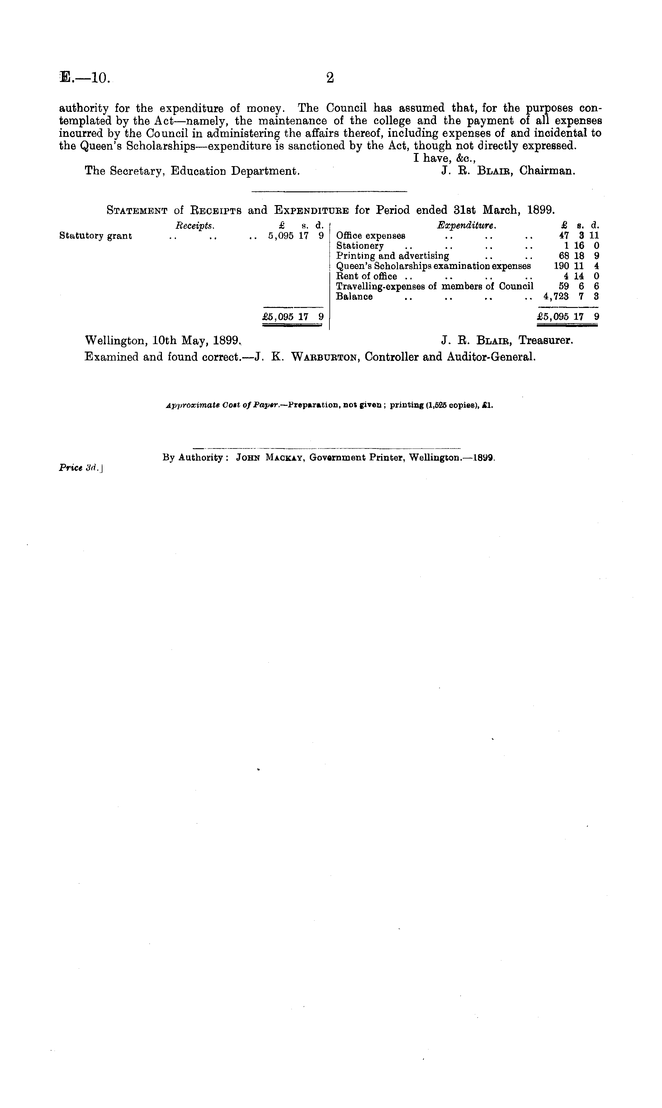 Statement of Receipts and Expenditure for Period ended 31st March, 1899. Receipts. £ s. d. Expenditure. £ a. d. Statutory grant .. .. .. 5,095 17 9 Office expenses .. .. .. 47 311 Stationery .. .. .. .. 1 16 0 Printing and advertising .. .. 68 18 9 Queen's Scholarships examination expenses 190 11 4 Rent of office .. .. .. .. 4 14 0 Travelling-expenses of members of Council 59 6 6 Balance .. .. .. .. 4,723 7 3 £5,095 17 9 £5,095 17 9 Wellington, 10th May, 1899. J. R. Blair, Treasurer. Examined and found correct.—J. K. Warburton, Controller and Auditor-General. Approximate Coit of Paper.— Preparation, not given ; printing (1,526 copies), £1.