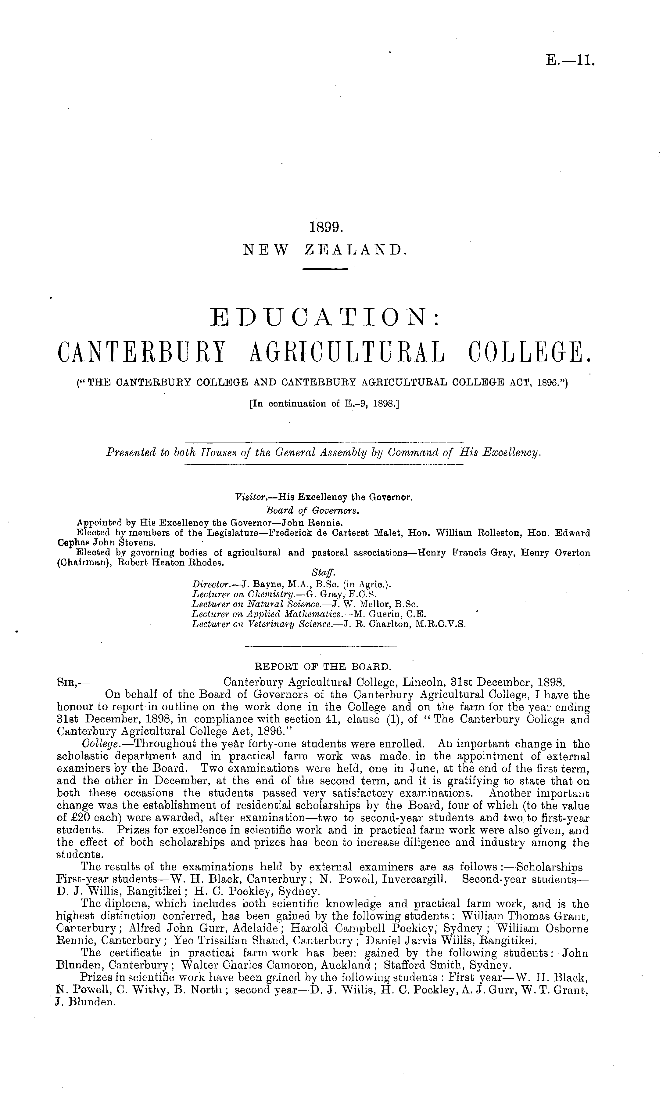 EDUCATION: CANTERBURY AGRICULTURAL COLLEGE. ("THE CANTERBURY COLLEGE AND CANTERBURY AGRICULTURAL COLLEGE ACT, 1896.") [In continuation of E.-9, 1898.]