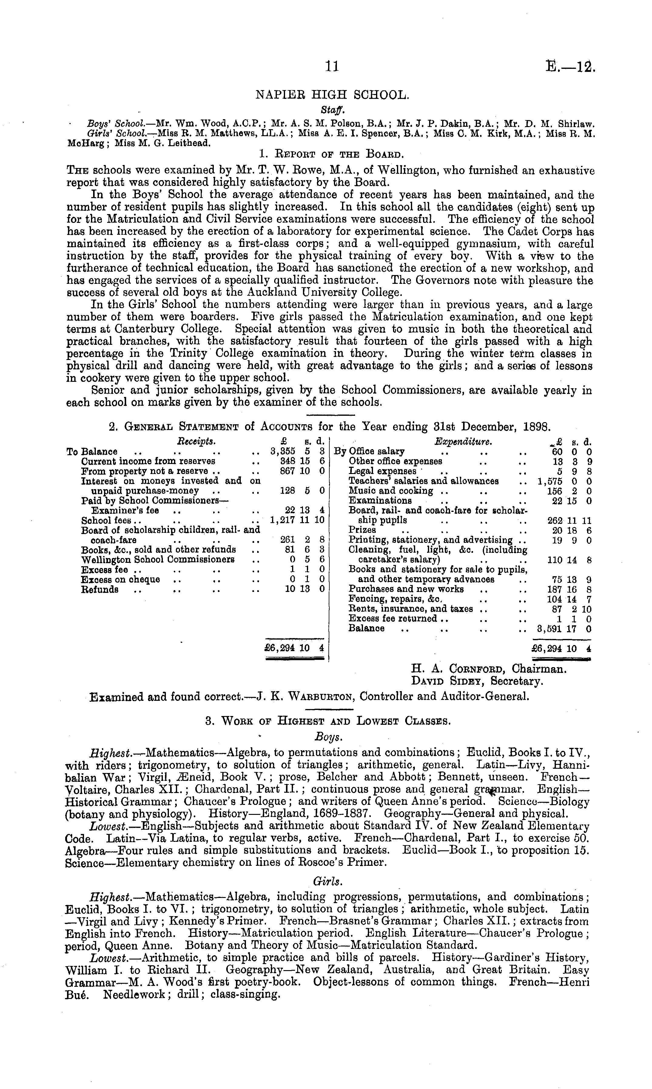 NAPIER HIGH SCHOOL. Staff. Boys' School.—Mi. Wm. Wood, A.C.P.; Mr. A. S. M. Poison, 8.A.; Mr. J. P. Dakin, 8.A.; Mr. D. M. Shirlaw. Girls' School.— Miss R. M. Matthews, LL.A.; Miss A. E. I. Spencer, 8.A.; Miss C. M. Kirk, M.A.; Miss R. M. McHarg ; Miss M. G. Leithead. 1. Beport of the Board. The schools were examined by Mr. T. W. Eowe, M.A., of Wellington, who furnished an exhaustive report that was considered highly satisfactory by the Board. In the Boys' School the average attendance of recent years has been maintained, and the number of resident pupils has slightly increased. In this school all the candidates (eight) sent up for the Matriculation and Civil Service examinations were successful. The efficiency of the school has been increased by the erection of a laboratory for experimental science. The Cadet Corps has maintained its efficiency as a first-class corps; and a well-equipped gymnasium, with careful instruction by the staff, provides for the physical training of every boy. With a vfew to the furtherance of technical education, the Board has sanctioned the erection of a new workshop, and has engaged the services of a specially qualified instructor. The Governors note with pleasure the success of several old boys at the Auckland University College. In the Girls' School the numbers attending were larger than in previous years, and a large number of them were boarders. Five girls passed the Matriculation examination, and one kept terms at Canterbury College. Special attention was given to music in both the theoretical and practical branches, with the satisfactory result that fourteen of the girls passed with a high percentage in the Trinity College examination in theory. During the winter term classes in physical drill and dancing were held, with great advantage to the girls; and a series of lessons in cookery were given to the upper school. Senior and junior scholarships, given by the School Commissioners, are available yearly in each school on marks given by the examiner of the schools.