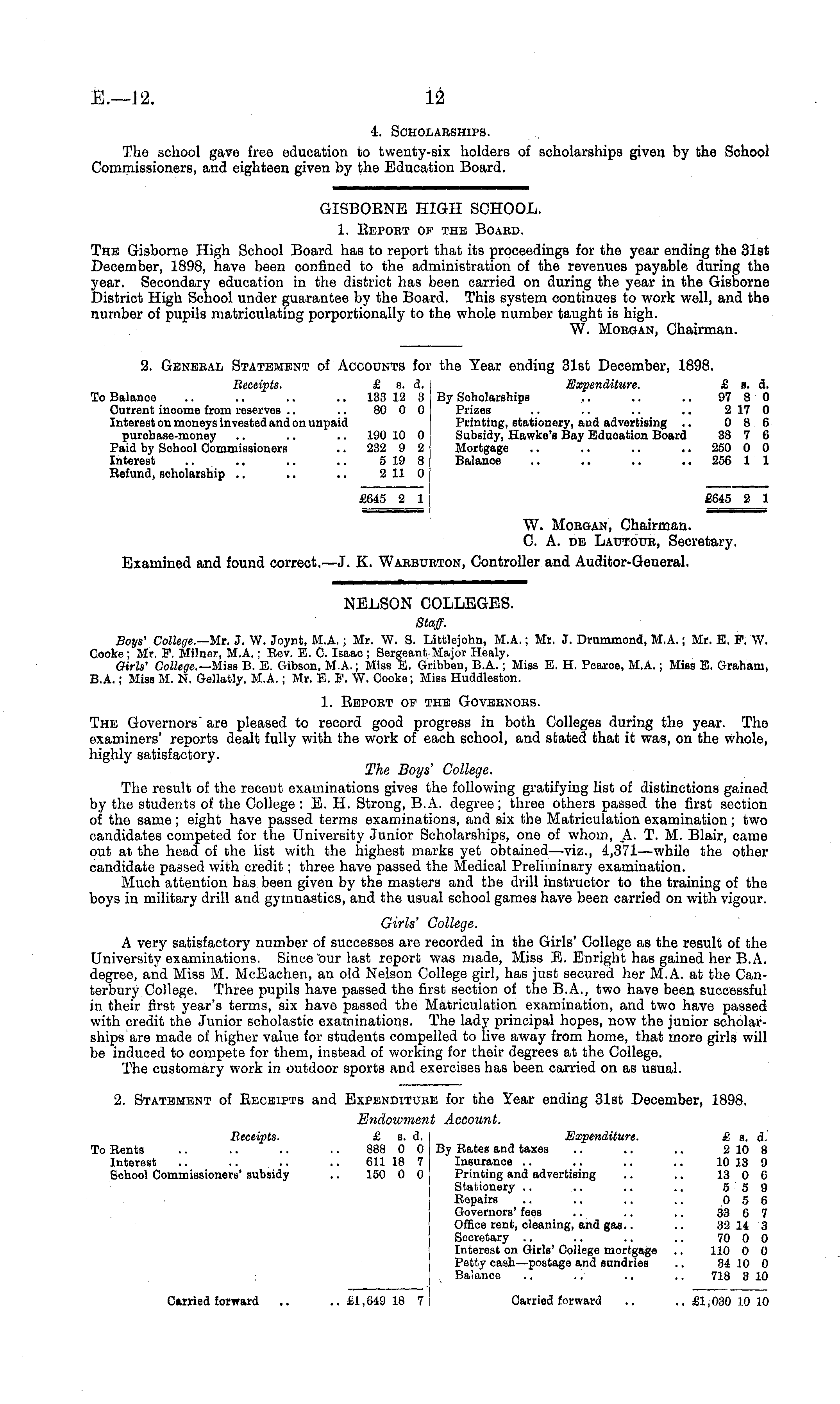 NELSON COLLEGES. Staff. Boys' College.—Mi. J. W. Joynt, M.A.; Mr. W. S. Littlejohn, M.A.; Mr. J. Dmmmond, M.A.; Mr. E. F. W. Cooke ; Mr. F. Milner, M.A.; Rev. E. C. Isaac ; Sergeant Major Healy. Girls' College.— Miss B. E. Gibson, M.A.; Miss E. Gribben, 8.A.; Miss E. H. Pearoe, M.A.; Miss E. Graham, 8.A.; Miss M. N. Gellatly, M.A. ; Mr. E. F. W. Cooke; Miss Huddleston. 1. Bepoet op the Goveenoes. The Governors' are pleased to record good progress in both Colleges during the year. The examiners' reports dealt fully with the work of each school, and stated that it was, on the whole, highly satisfactory. The Boys' College. The result of the recent examinations gives the following gratifying list of distinctions gained by the students of the College : E. H. Strong, B.A. degree; three others passed the first section of the same; eight have passed terms examinations, and six the Matriculation examination; two candidates competed for the University Junior Scholarships, one of whom, A. T. M. Blair, came out at the head of the list with the highest marks yet obtained —viz., 4,371 —while the other candidate passed with credit; three have passed the Medical Preliminary examination. Much attention has been given by the masters and the drill instructor to the training of the boys in military drill and gymnastics, and the usual school games have been carried on with vigour. Girls' College. A very satisfactory number of successes are recorded in the Girls' College as the result of the University examinations. Since'our last report was made, Miss E. Enright has gained her B.A. degree, and Miss M. McEachen, an old Nelson College girl, has just secured her M.A. at the Canterbury College. Three pupils have passed the first section of the 8.A., two have been successful in their first year's terms, six have passed the Matriculation examination, and two have passed with credit the Junior scholastic examinations. The lady principal hopes, now the junior scholarships are made of higher value for students compelled to live away from home, that more girls will be induced to compete for them, instead of working for their degrees at the College. The customary work in outdoor sports and exercises has been carried on as usual.