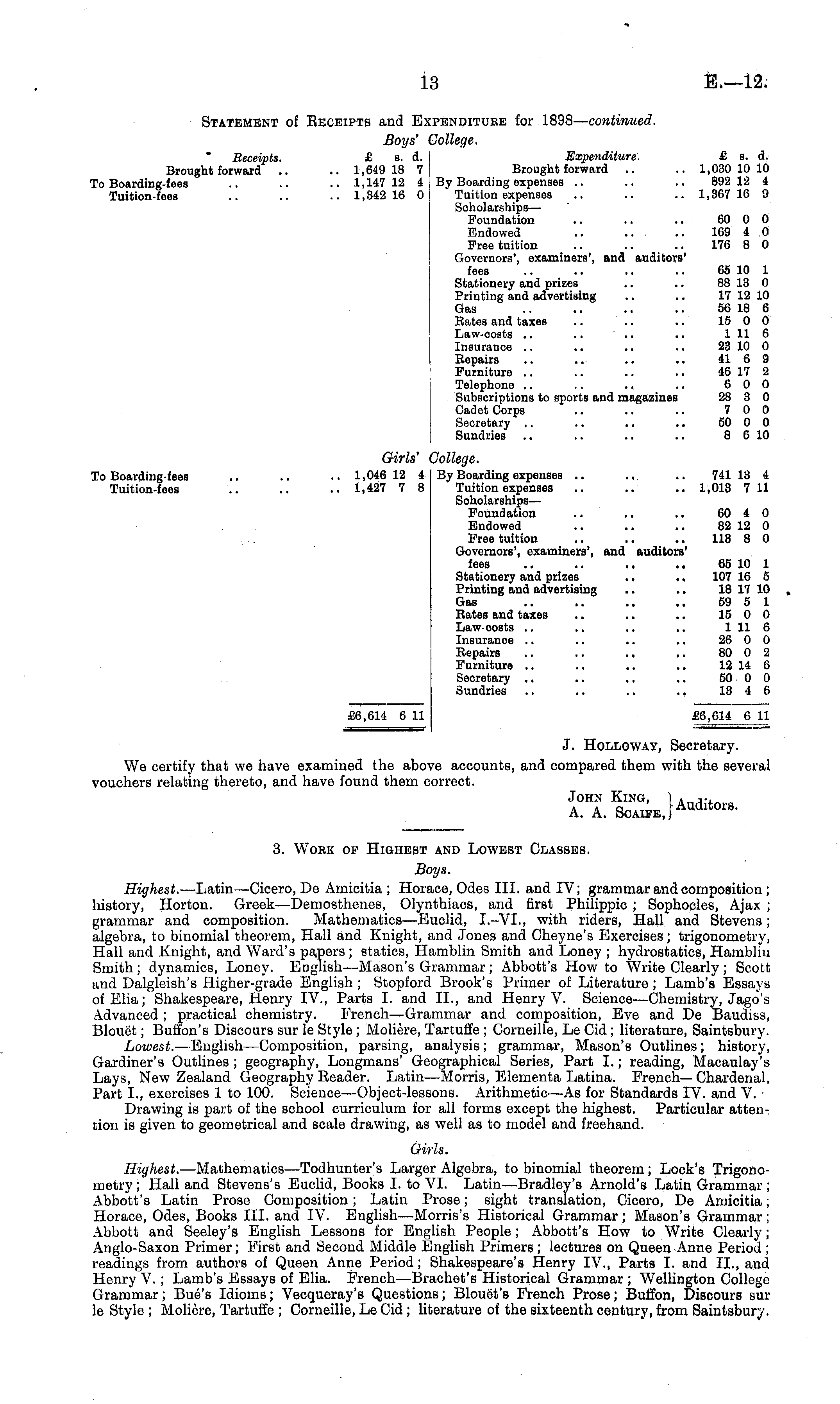 Statement of Eeceipts and Expenditure for 1898— continued. Boys' College. Receipts. £ s. d. Expenditure. £ a. d. Brought forward .. .. 1,649 18 7 Brought forward .. ..1,030 10 10 To Boarding-fees .. .. .. 1,147 12 4 By Boarding expenses .. .. .. 892 12 4 Tuition-fees .. .. .. 1,342 16 0 Tuition expenses .. .. .. 1,367 16 9 Scholarships— Foundation .. .. .. 60 0 0 Endowed .. .. ... 169 4 0 Free tuition .. .. .. 176 8 0 Governors', examiners', and auditors' fees .. .. .. .. 65 10 1 Stationery and prizes .. .. 88 13 0 Printing and advertising .. .. 17 12 10 Gas .. .. .. .. 56 18 6 Bates and taxes .. .. .. 15 0 0 Law-oosts .. .. " .. .. 1 11 6 Insurance .. .. .. .. 23 10 0 Bepairs .. .. .. .. 41 6 9 Furniture .. .. .. .. 46 17 2 Telephone .. .. .. .. 6 0 0 Subscriptions to sports and magazines 28 3 0 Cadet Corps .. .. .. 7 0 0 Secretary .. .. .. .. 50 0 0 Sundries .. .. .. .. 8 610 Girls' College. To Boarding-fees .. .. .. 1,046 12 4 By Boarding expenses .. .. .. 741 13 4 Tuition-fees .. .. .. 1,427 7 8 Tuition expenses .. .. .. 1,018 711 Scholarships— Foundation .. .. .. 60 4 0 Endowed .. .. .. 82 12 0 Free tuition .. .. .. 113 8 0 Governors', examiners', and auditors' fees .. .. .. .. 65 10 1 Stationery and prizes .. .. 107 16 5 Printing and advertising .. .. 18 17 10 Gas .. .. .. .. 59 5 1 Bates and taxes .. .. .. 15 0 0 Law-costs .. .. .. .. 1 11 6 Insurance .. .. .. .. 26 0 0 Bepairs .. .. .. .. 80 0 2 Furniture .. .. .. .. 12 14 6 Secretary .. .. .. .. 50 0 0 Sundries .. .. .. .. 13 4 6 £6,614 6 11 £6,614 6 11 J. Holloway, Secretary. We certify that we have examined the above accounts, and compared them with the several vouchers relating thereto, and have found them correct. John King, ) . ■~, A. A. SoAiFEj Audltors -