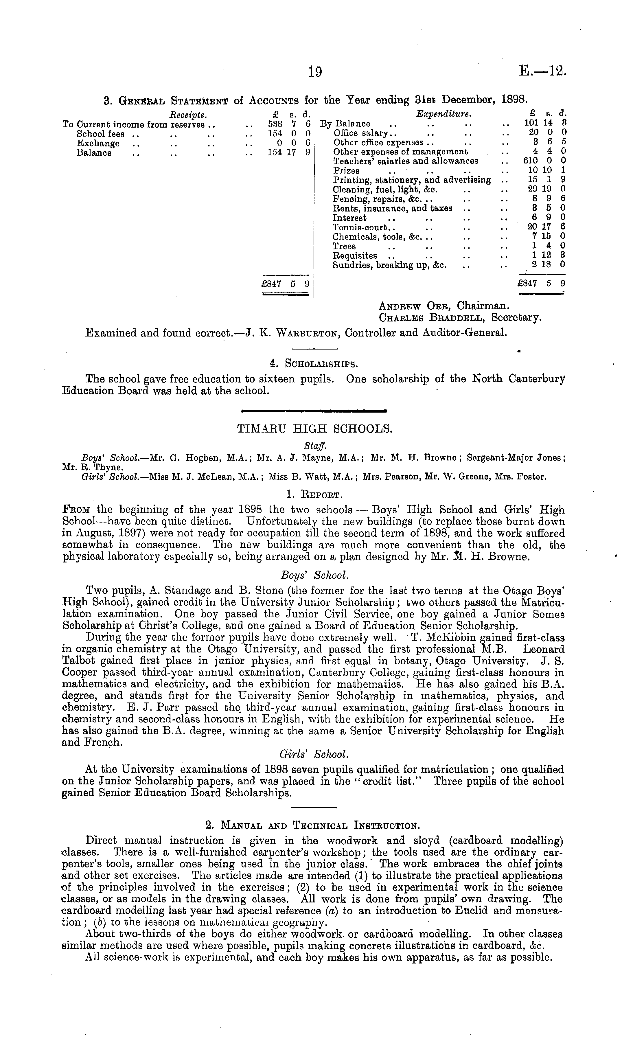 TIMAEU HIGH SCHOOLS. Staff. Boys' School. —Mr. G. Hogben, M.A.; Mr. A. J. Mayno, M.A.; Mr. M. H. Browne; Sergeant-Major Jones; Mr. R. Thyne. Girls' School—Miss M. J. MoLean, M.A.; Miss B. Watt, M.A.; Mrs. Pearson, Mr. W. Greene, Mrs. Poster. 1. Eeport. From the beginning of the year 1898 the two schools — Boys' High School and Girls' High School—have been quite distinct. Unfortunately the new buildings (to replace those burnt down in August, 1897) were not ready for occupation till the second term of 1898, and the work suffered somewhat in consequence. The new buildings are much more convenient than the old, the physical laboratory especially so, being arranged on a plan designed by Mr. M. H. Browne. Boys' School. Two pupils, A. Standage and B. Stone (the former for the last two terms at the Otago Boys' High School), gained credit in the University Junior Scholarship; two others passed the Matriculation examination. One boy passed the Junior Civil Service, one boy gained a Junior Somes Scholarship at Christ's College, and one gained a Board of Education Senior Scholarship. During the year the former pupils have done extremely well. T. McKibbin gained first-class in organic chemistry at the Otago University, and passed the first professional M.B. Leonard Talbot gained first place in junior physics, and first equal in botany, Otago University. J. S. Cooper passed third-year annual examination, Canterbury College, gaining first-class honours in mathematics and electricity, aud the exhibition for mathematics. He has also gained his B.A. degree, and stands first for the University Senior Scholarship in mathematics, physics, and chemistry. E. J. Parr passed the third-year annual examination, gaining first-class honours in chemistry and second-class honours in English, with the exhibition for experimental science. He has also gained the B.A. degree, winning at the same a Senior University Scholarship for English and French. Girls' School. At the University examinations of 1898 seven pupils qualified for matriculation ; one qualified on the Junior Scholarship papers, and was placed in the " credit list." Three pupils of the school gained Senior Education Board Scholarships.