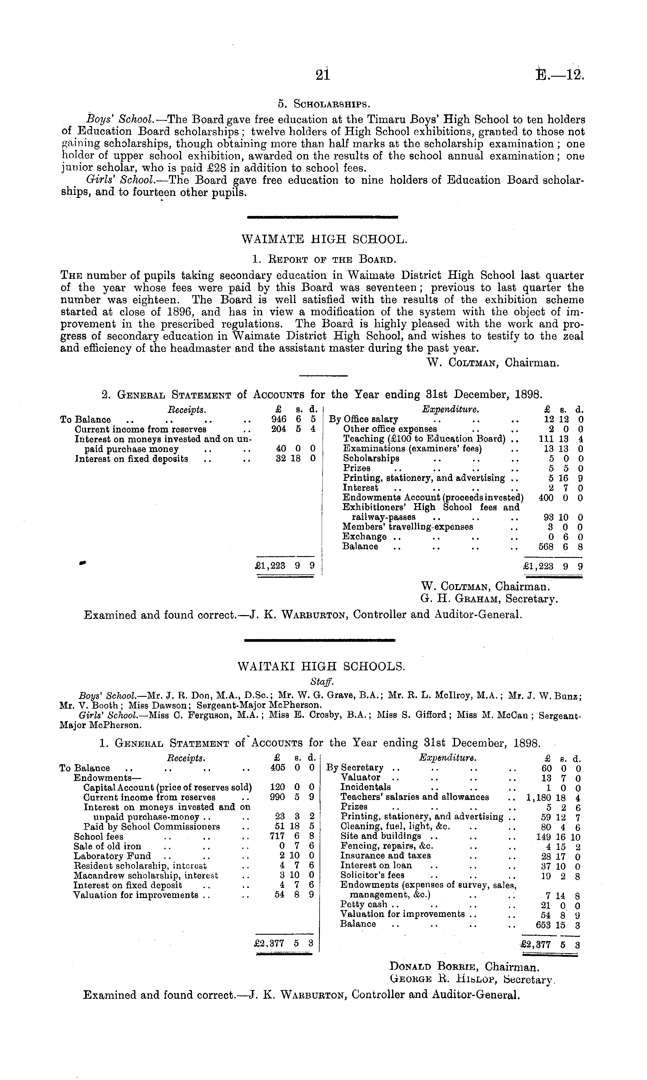 WAITAKI HIGH SCHOOLS. Staff. Boys' School— Mr. J. R. Don, M.A., D.Sc.; Mr. W. G. Grave, 8.A.; Mr. R. L. Mcllroy, M.A.; Mr. J. W. Bunz; Mr. V. Booth ; Miss Dawson; Sergeant-Major McPherson. Girls' School. —Miss 0. Ferguson, M.A. ; Miss B. Crosby, 8.A.; Miss S. Gifford; Miss M. McCan ; SergeantMajor McPherson. 1. General Statement of Accounts for the Year ending 31st December, 1898. Receipts. £ 8. d. Expenditure. £ s. d. To Balance .. .. ' .. .. 405 0 0 By Secretary .. .. .. .. 60 0 0 Endowments— Valuator .. .. .. .. 13 7 0 Capital Account (price of reserves sold) 120 0 0 Incidentals .. .. .. 10 0 Current inoome from reserves .. 990 5 9 Teachers'salaries and allowances .. 1,180 18 4 Interest on moneys invested and on Prizes .. .. .. .. 5 2 6 unpaid purchase-money .. .. 23 3 2 Printing, stationery, and advertising .. 59 12 7 Paid by School Commissioners .. 51 18 5 Cleaning, fuel, light, &c. .. .. 80 4 6 School fees .. 717 6 8 Site and buildings .. .. .. 149 16 10 Sale of old iron .. .. .. 0 7 6 Fencing, repairs, &c. .. .. 415 2 Laboratory Fund .. .. .. 210 0 Insurance and taxes .. .. 28 17 0 Residont scholarship, interest .. 4 7 6 Interest on loan .. .. .. 37 10 0 Macandrew scholarship, interest .. 3 10 0 Solicitor's fees .. .. .. 19 2 8 Interest on fixed deposit .. .. 4 7 6 Endowments (expenses of survey, sales, Valuation for improvements .. .. 54 8 9 management, &c.) .. .; 714 8 Petty cash .. .. .. .. 21 0 0 Valuation for improvements .. .. 54 8 9 Balance .. .. .. .. 653 15 3 £2,377 5 3 £2,377 5 3 Donald Borrie, Chairman. Geokge B. HibLOP, Secretary, Examined and found correct. — J. K. Warbubton, Controller and Auditor-General.
