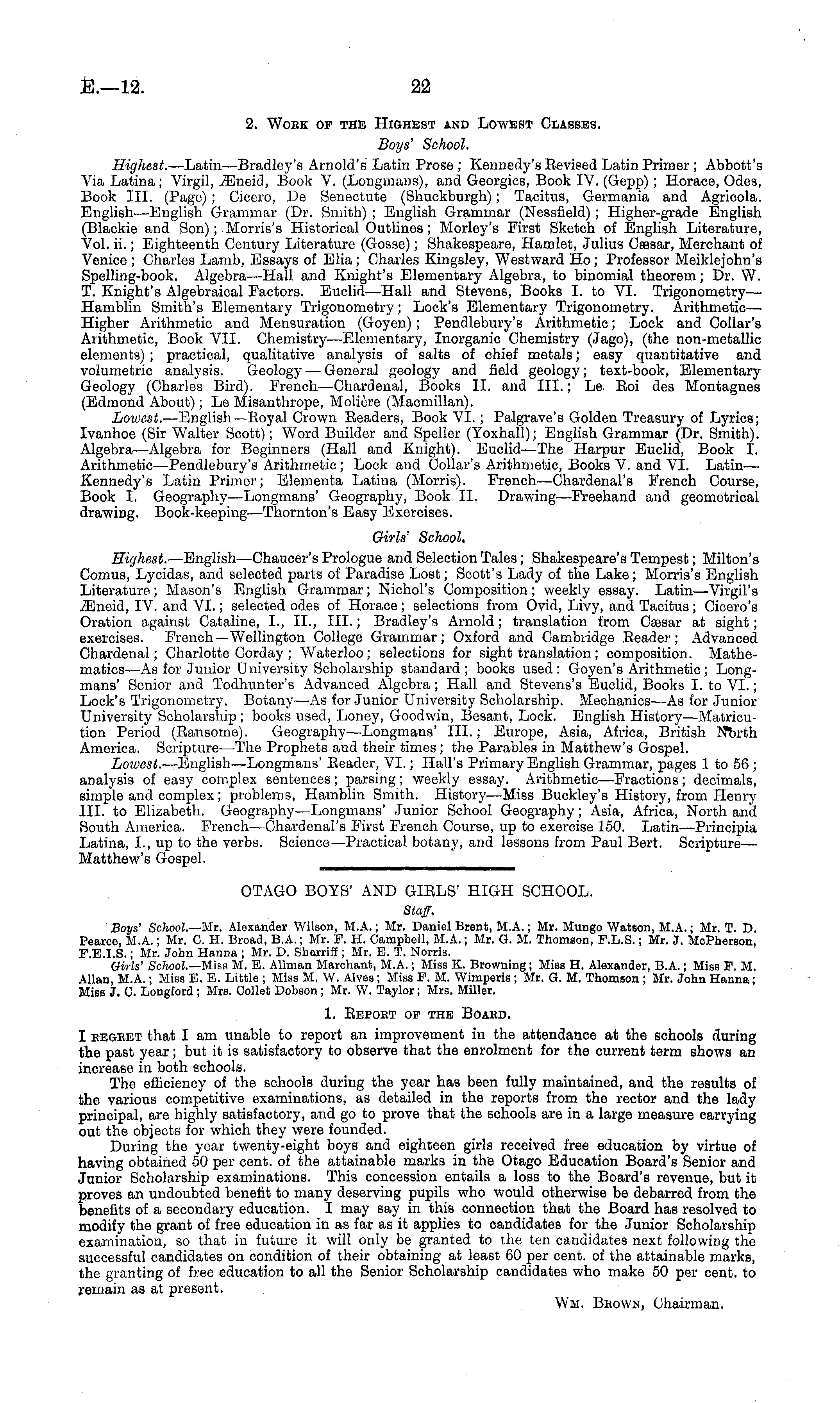 OTAGO BOYS' AND GIRLS' HIGH SCHOOL. Staff. Boys' School. —Mr. Alexander Wilson, M.A.; Mr. Daniel Brent, M.A.; Mr. Mungo Watson, M.A.; Mr. T. T>. Pearoe, M.A.; Mr. 0. H. Broad, 8.A.; Mr. F. H. Campbell, M.A.; Mr. G. M. Thomson, F.L.S.; Mr. J. MoPherson, P.E.1.5.; Mr. John Hanna ; Mr. D. Sharrifi ; Mr. E. T. Norris. Girls' School.— Miss M. E. Allman Marchant, M.A.; Miss K. Browning; Miss H. Alexander, 8.A.; Miss P. M. Allan, M.A.; Miss E. E. Little ; Miss M. W. Alves; Miss F. M. Wimperis ; Mr. G. M. Thomson ; Mr. John Hanna; Miss J. C. Longford ; Mrs. Collet Dobson ; Mr. W. Taylor; Mrs. Miller. 1. EEPOBT OP THE BoAED. I eegeet that I am unable to report an improvement in the attendance at the schools during the past year; but it is satisfactory to observe that the enrolment for the current term shows an increase in both schools. The efficiency of the schools during the year has been fully maintained, and the results of the various competitive examinations, as detailed in the reports from the rector and the lady principal, are highly satisfactory, and go to prove that the schools are in a large measure carrying out the objects for which they were founded. During the year twenty-eight boys and eighteen girls received free education by virtue of having obtained 50 per cent, of the attainable marks in the Otago Education Board's Senior and Junior Scholarship examinations. This concession entails a loss to the Board's revenue, but it proves an undoubted benefit to many deserving pupils who would otherwise be debarred from the benefits of a secondary education. I may say in this connection that the Board has resolved to modify the grant of free education in as far as it applies to candidates for the Junior Scholarship examination, so that in future it will only be granted to the ten candidates next following the successful candidates on condition of their obtaining at least 60 per cent, of the attainable marks, the granting of free education to all the Senior Scholarship candidates who make 50 per cent, to remain as at present. Wμ. Bkown, Chairman.