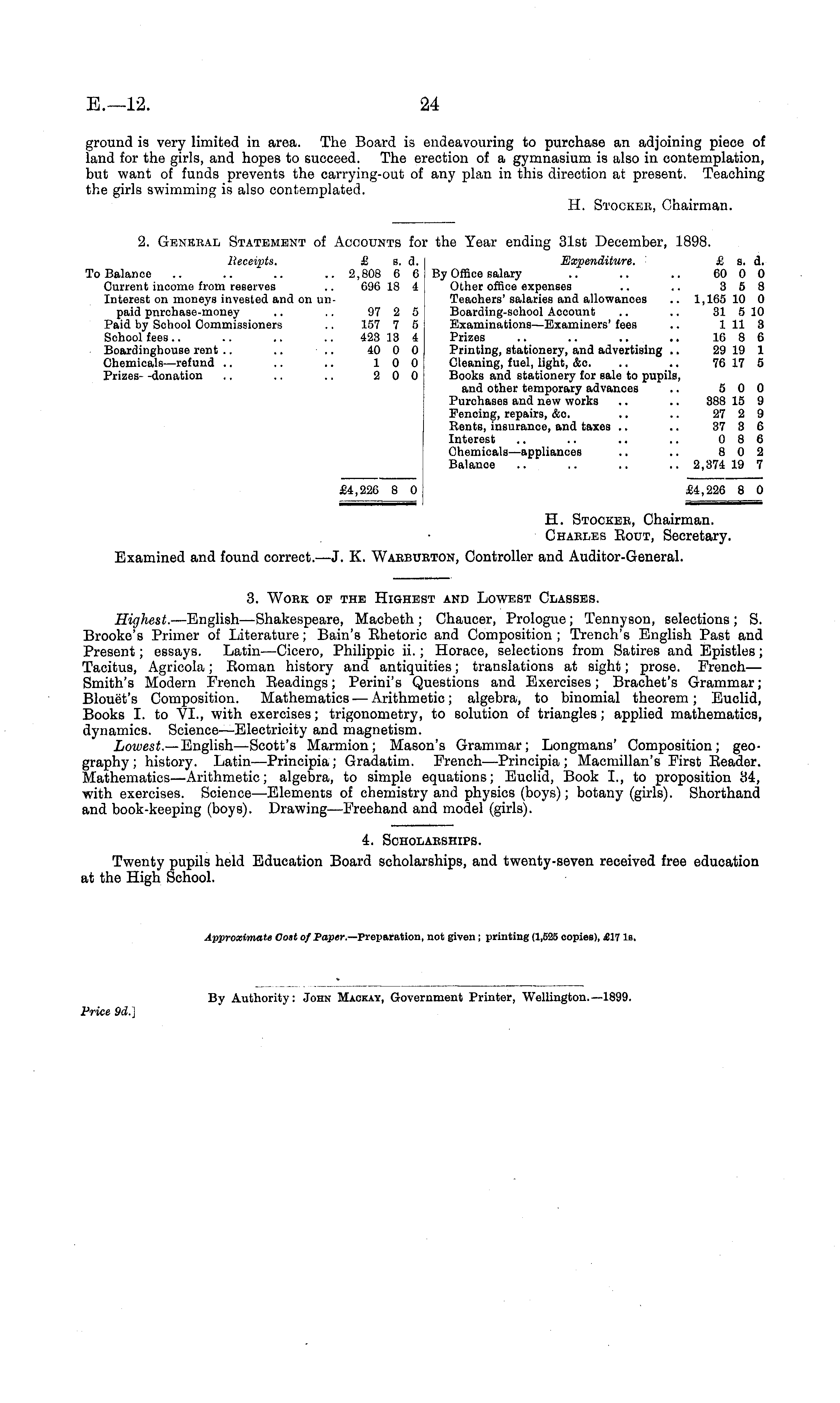 ground is very limited in area. The Board is endeavouring to purchase an adjoining piece of land for the girls, and hopes to succeed. The erection of a gymnasium is also in contemplation, but want of funds prevents the carrying-out of any plan in this direction at present. Teaching the girls swimming is also contemplated. H. Stockeb, Chairman. 2. General Statement of Accounts for the Year ending 31st December, 1898. Receipts. £ s. d. Expenditure. £ s. d. To Balance .. .. .. .. 2,808 6 6 By Office salary .. .. .. 60 0 0 Current income from reserves .. 696 18 4 Other office expenses .. .. 3 5 8 Interest on moneys invested and on un- Teachers'salaries and allowances .. 1,165 10 0 paid pnrchase-money .. .. 97 2 5 Boarding-school Account .. .. 31 510 Paid by School Commissioners .. 157 7 5 Examinations—Examiners' fees .. 111 3 School fees.. .. .. .. 423 13 4 Prizes .. .. .. .. 16 8 6 Boardinghouse rent .. .. .. 40 0 0 Printing, stationery, and advertising .. 29 19 1 Chemicals—refund .. .. .. 10 0 Cleaning, fuel, light, &o. .. .. 76 17 5 Prizes- -donation .. .. .. 2 0 0 Books and stationery for sale to pupils, and other temporary advances .. 5 0 0 Purchases and new works .. .. 388 15 9 Fencing, repairs, &o. .. .. 27 2 9 Bents, insurance, and taxes .. .. 37 3 6 Interest .. .. .. .. 0 8 6 Chemicals—appliances .. .. 8 0 2 Balanoe .. .. .. .. 2,374 19 7 £4,226 8 0 £4,226 8 0 H. Stockeb, Chairman. Chaeles Bout, Secretary. Examined and found correct.— J. K. Waebueton, Controller and Auditor-General.