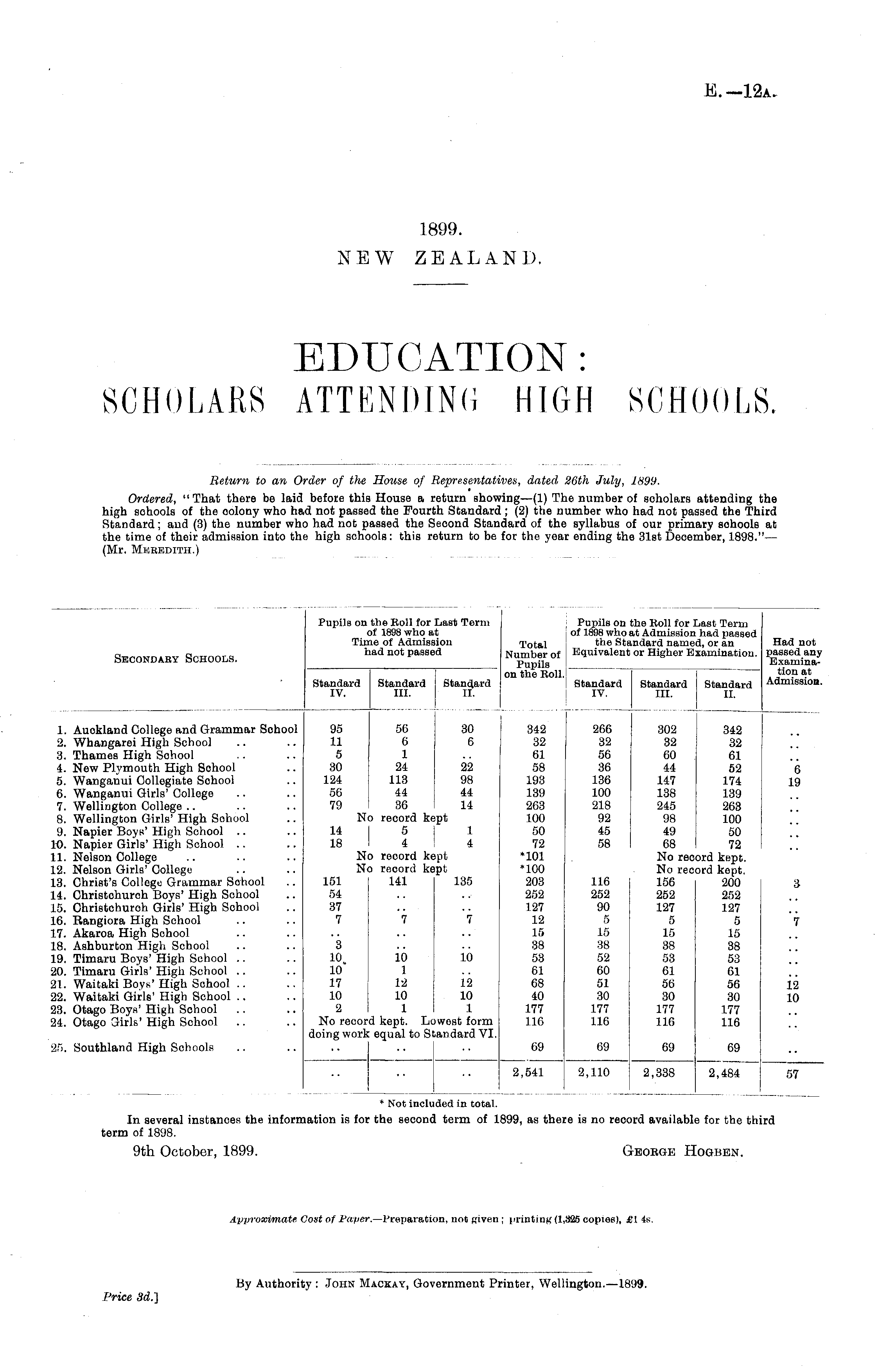 Return to an Order of the House of Representatives, dated 26th July, 1899. Ordered, " That there be laid before this House a return showing—(l) The number of scholars attending the high schools of the oolony who had not passed the Fourth Standard ; (2) the number who had not passed the Third Standard; and (3) the number who had not passed the Second Standard of the syllabus of our primary sohools at the time of their admission into the high sohools: this return to be for the year ending the 31st December, 1898."— (Mr. Mebedith.)