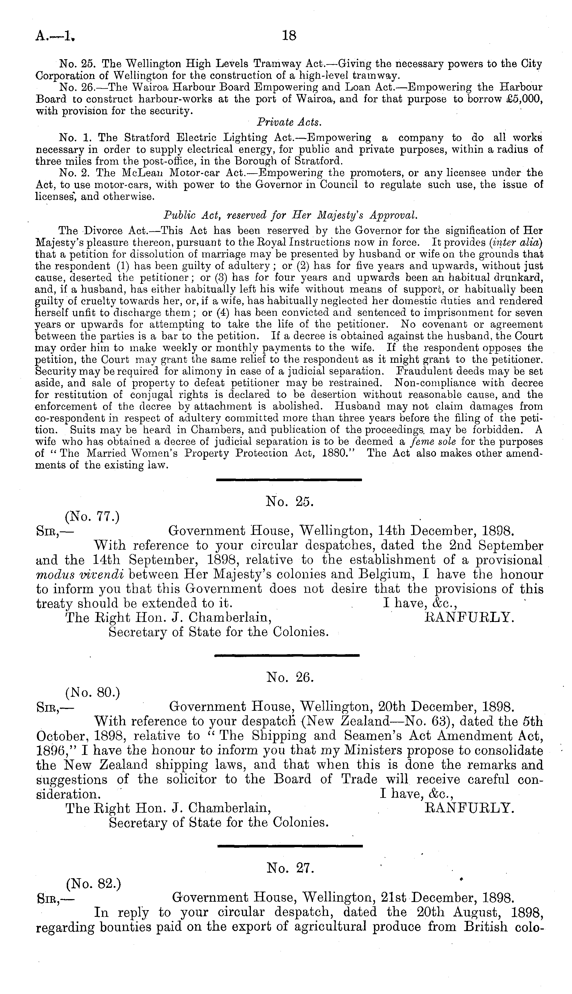 No. 25. (No. 77.) Sic, — Government House, Wellington, 14th December, 1898. With reference to your circular despatches, dated the 2nd September and the 14th September, 1898, relative to the establishment of a provisional modus vivendi between Her Majesty's colonies and Belgium, I have the honour to inform you that this Government does not desire that the provisions of this treaty should be extended to it. I have, &c, The Right Hon. J. Chamberlain, RANBURLY. Secretary of State for the Colonies.