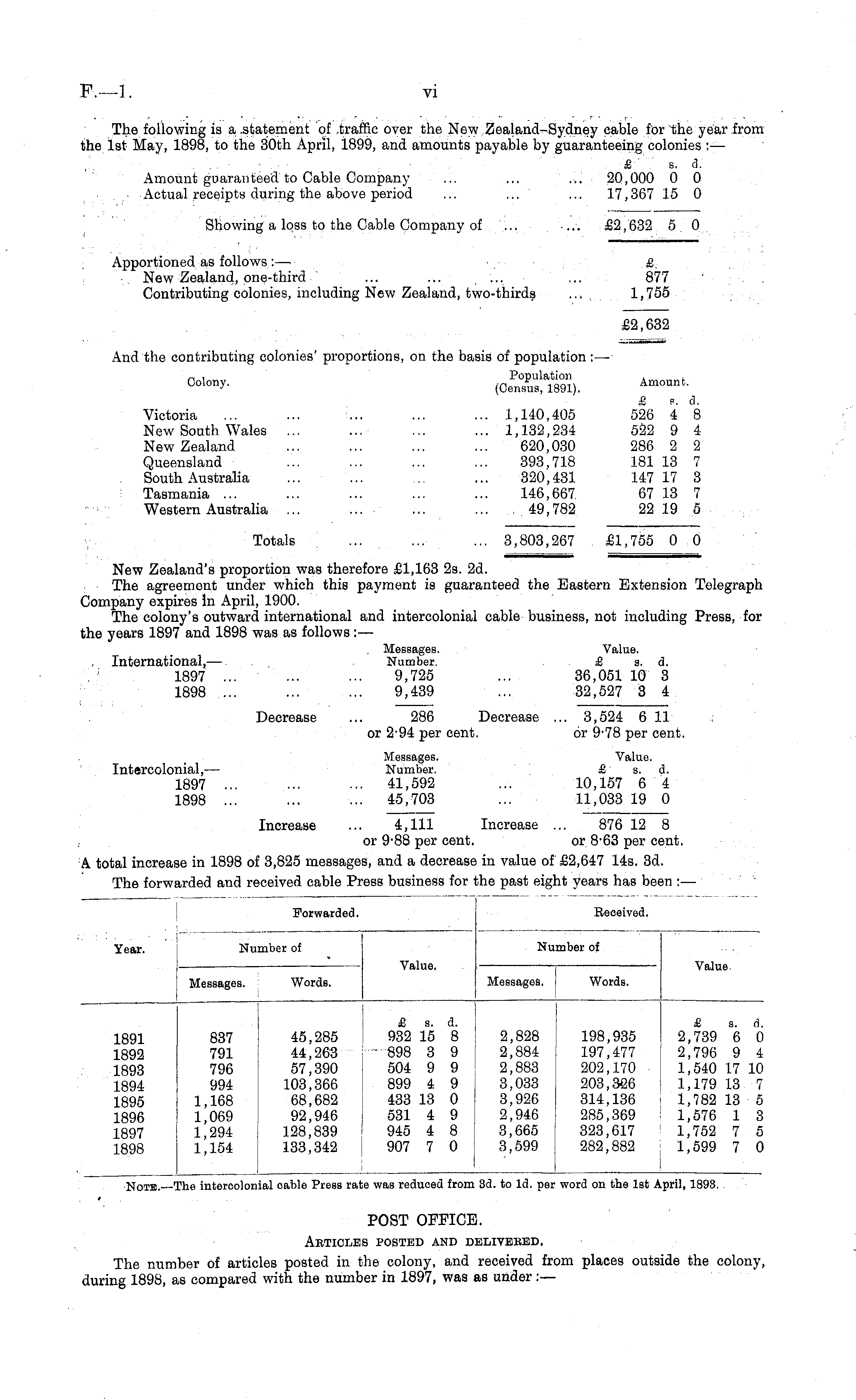 ■Note. The intercolonial cable Press rate was reduced from 3d. to Id. per word on the Ist April, 1893. POST OFFICE. Aeticles posted and delivbeed. The number of articles posted in the colony, and received from places outside the colony, during 1898, as compared with the number in 1897, was as under : —