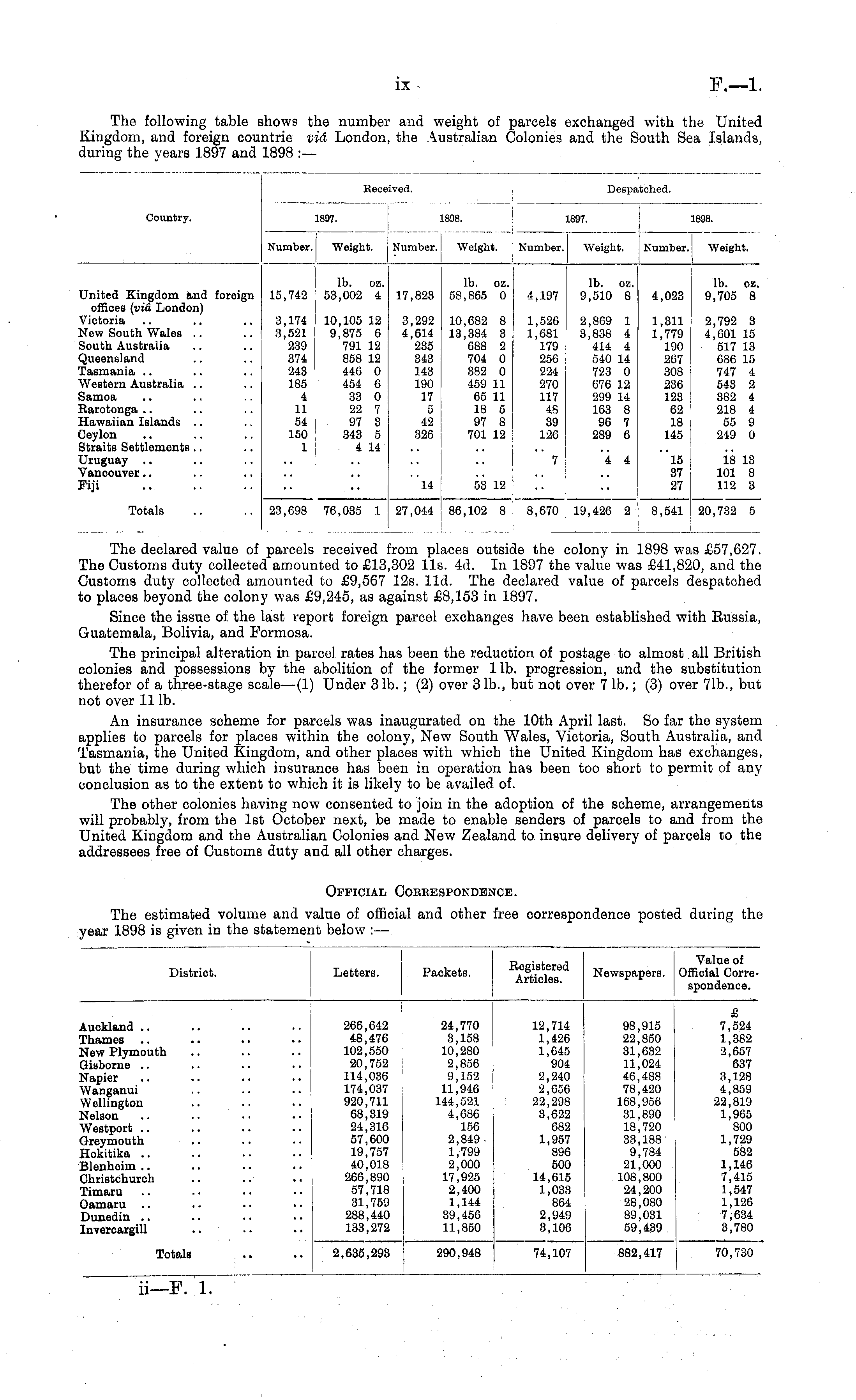 Despatched. Eeoeived. Country. 1897. 1898. 1897. 1898. Number. Weight. Number. Weight. Number. Weight. Number. Weight. Jnited Kingdom and foreign offices (via London) Victoria lew South Wales louth Australia Queensland Tasmania Vestern Australia .. iamoa larotonga .. lawaiian Islands leylon itraits Settlements Jruguay .. r anoouver.. i'iji 15,742 lb. oz. 53,002 4 17,823 lb. oz. 58,865 0 4,197 lb. oz. 9,510 8 4,023 lb. oz. 9,705 8 3,174 3,521 239 374 243 185 4 11 54 150 1 10,105 12 9,875 6 791 12 858 12 446 0 454 6 33 0 22 7 97 3 343 5 4 14 3,292 4,614 235 343 143 190 17 5 42 326 10,682 8 13,384 3 688 2 704 0 382 0 459 11 65 11 18 5 97 8 701 12 1,526 1,681 179 256 224 270 117 4S 39 126 2,869 1 3,838 4 414 4 540 14 723 0 676 12 299 14 163 8 96 7 289 6 1,311 1,779 190 267 308 236 123 62 18 145 2,792 3 4,601 15 517 13 686 15 747 4 543 2 382 4 218 4 55 9 249 0 7 'I 4 15 37 27 18 13 101 8 112 3 "u 53 12 Totals 23,698 76,035 1 27,044 86,102 8 8,670 19,426 2 8,541 20,732 5
