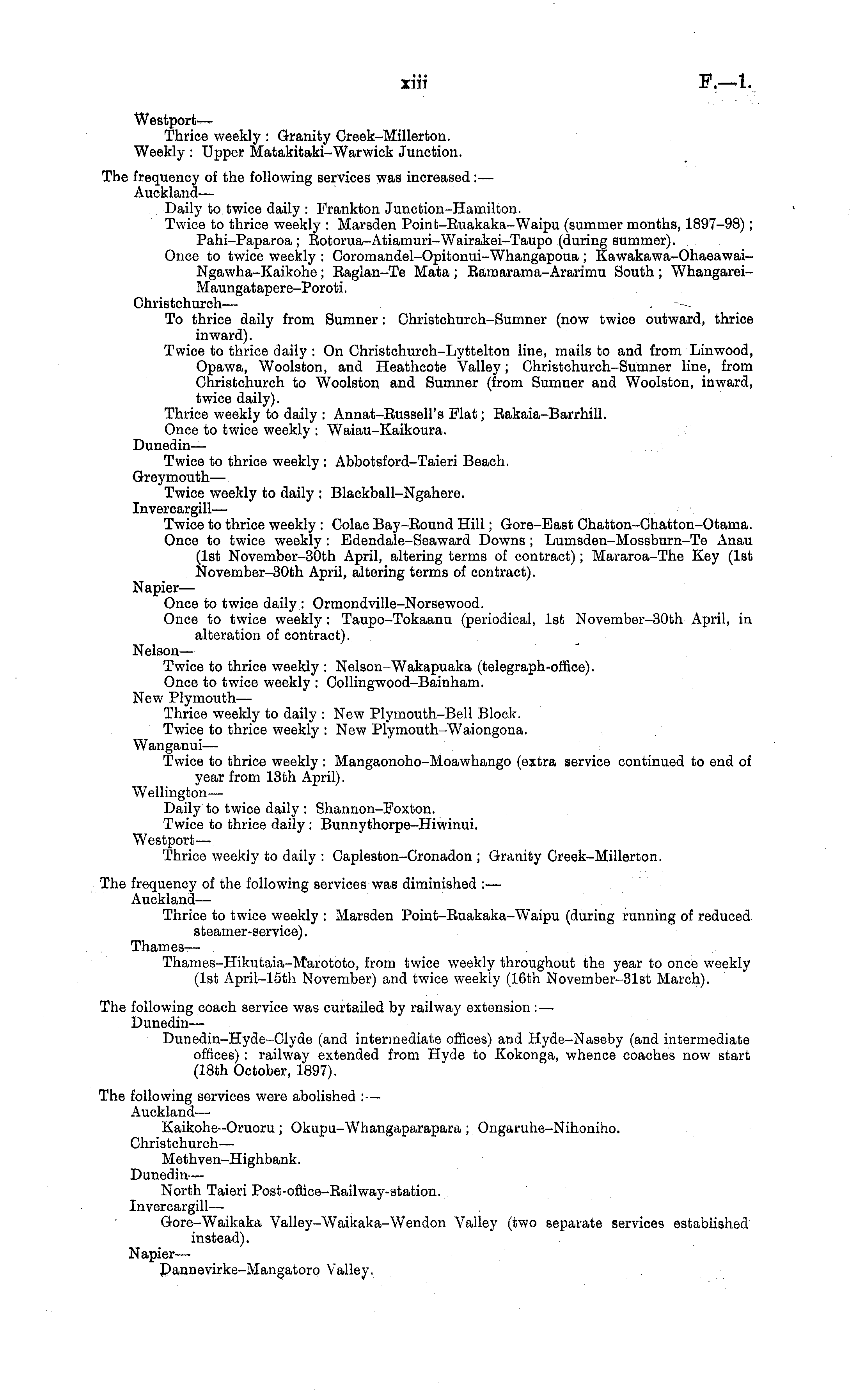Westport— Thrice weekly : Granity Creek-Millerton. Weekly : Upper Matakitaki-War wick Junction. The frequency of the following services was increased: — Auckland— Daily to twice daily : Frankton Junction-Hamilton. Twice to thrice weekly : Marsden Point-Euakaka-Waipu (summer months, 1897-98); Pahi-Paparoa ; Eotorua-Atiamuri-Wairakei-Taupo (during summer). Once to twice weekly : Coromandel-Opitonui-Whangapoua ; Kawakawa-Ohaeawai-Ngawha-Kaikohe; Eaglan-Te Mata ; Eamarama-Ararimu South; Whangarei-Maungatapere-Poroti. Christchurch— To thrice daily from Sumner: Christchurch-Sumner (now twice outward, thrice inward). Twice to thrice daily : On Christchurch-Lyttelton line, mails to and from Linwood, Opawa, Woolston, and Heathcote Valley; Christchurch-Sumner line, from Christchurch to Woolston and Sumner (from Sumner and Woolston, inward, twice daily). Thrice weekly to daily : Annat-Eussell's Flat; Eakaia-Barrhill. Once to twice weekly : Waiau-Kaikoura. Dunedin— Twice to thrice weekly : Abbotsford-Taieri Beach. Greymouth— Twice weekly to daily : Blackball-Ngahere. Invercargill— Twice to thrice weekly : Colac Bay-Eound Hill; Gore-East Chatton-Chatton-Otama. Once to twice weekly : Edendale-Seaward Downs ; Lumsden-Mossburn-Te Anau (Ist November-30th April, altering terms of contract); Mararoa-The Key (Ist November-30th April, altering terms of contract). Napier— Once to twice daily : Ormondville-Norsewood. Once to twice weekly : Taupo-Tokaanu (periodical, Ist November-30th April, in alteration of contract). Nelson— Twice to thrice weekly : Nelson-Wakapuaka (telegraph-office). Once to twice weekly : Collingwood-Bainham. New Plymouth— Thrice weekly to daily : New Plymouth-Bell Block. Twice to thrice weekly : New Plymouth-Waiongona. Wanganui— Twice to thrice weekly : Mangaonoho-Moawhango (extra service continued to end of year from 13th April). Wellington— Daily to twice daily : Shannon-Foxton. Twice to thrice daily : Bunnythorpe-Hiwinui. Westport— Thrice weekly to daily : Capleston-Cronadon ; Granity Creek-Millerton. The frequency of the following services was diminished : — Auckland— Thrice to twice weekly : Marsden Point-Euakaka-Waipu (during running of reduced steamer-service). Thames— Thames-Hikutaia-Marototo, from twice weekly throughout the year to once weekly (Ist April-15th November) and twice weekly (16th November-31st March). The following coach service was curtailed by railway extension : — Dunedin— Dunedin-Hyde-Clyde (and intermediate offices) and Hyde-Naseby (and intermediate offices) : railway extended from Hyde to Kokonga, whence coaches now start (18th October, 1897). The following services were abolished : — Auckland— Kaikohe-Oruoru ; Okupu-Whaugaparapara ; Ongaruhe-Nihoniho. Christchurch— Methven-Highbank. Dunedin— North Taieri Post-office-Eailway-station. Invercargill— Gore-Waikaka Valley-Waikaka-Wendon Valley (two separate services established instead). Napier— Dannevirke-Mangatoro Valley.