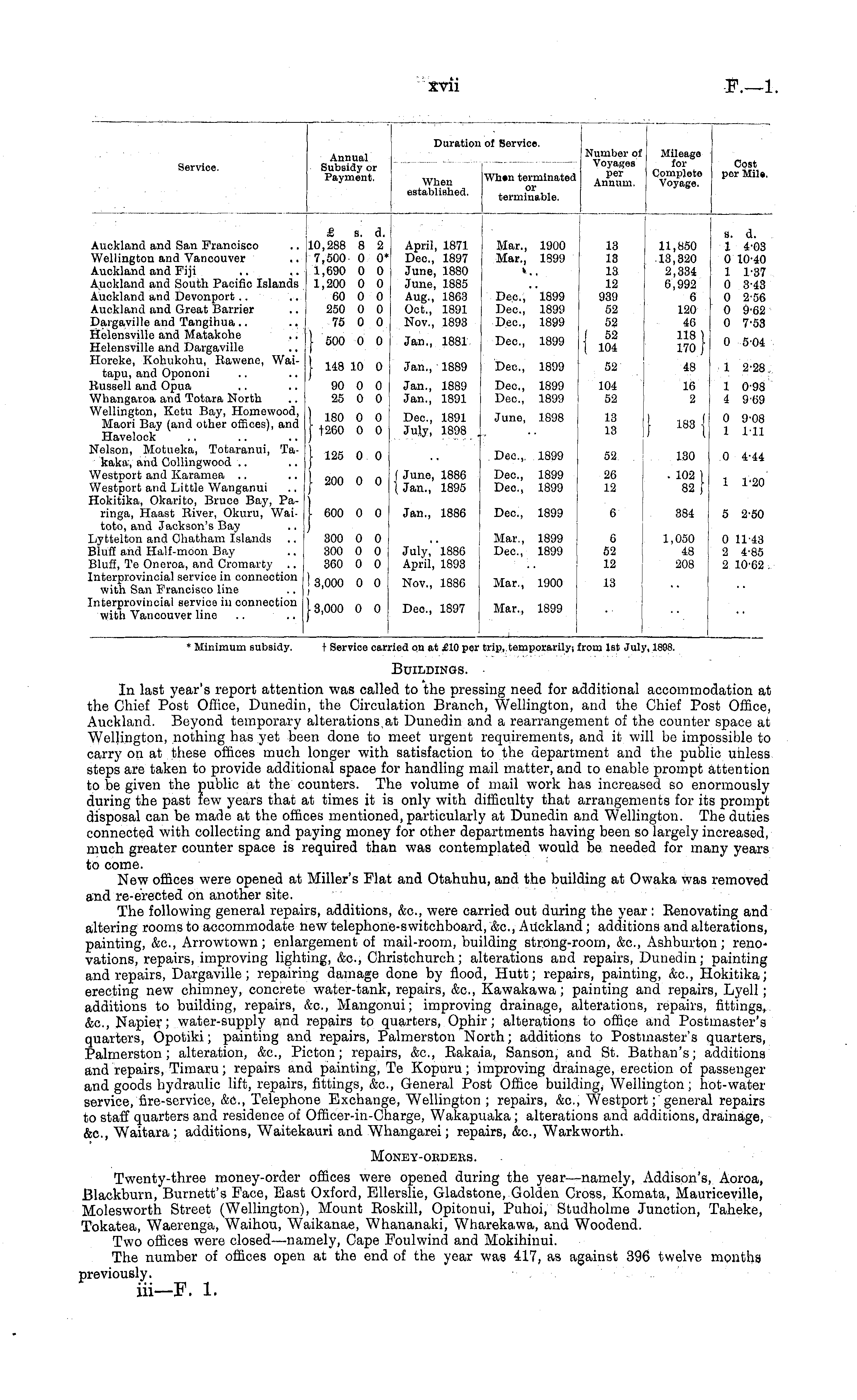Duration of Service. Service. Annual Subsidy or Payment. When established. Wh»n terminated or terminable. Number of Voyages per Annum. Mileage for Completo Voyage. Cost per Mils. Auckland and San Francisco Wellington and Vancouver Auckland and Fiji Auckland and South Pacific Islands Auckland and Devonport Auckland and Great Barrier Dargaville and Tangihua Helensville and Matakohe Helensville and Dargaville Horeke, Kohukohu, Rawene, Waitapu, and Opononi Russell and Opua Whangaroa and Totara North Wellington, Kotu Bay, Homewood, Maori Bay (and other offices), and Havolock Nelson, Motueka, Totaranui, Takakar, and Collingwood Westport and Karamea Westport and Little Wanganui Hokitika, Okarito, Bruce Bay, Paringa, Haast River, Okuru, Waitoto, and Jackson's Bay Lyttelton and Chatham Islands Bluff and Half-moon Bay Bluff, Te Oneroa, and Cromarty .. Interprovinoial service in connection with San Francisco line Interprovinoial service ill connection with Vancouver line £ s. d. 10,288 8 2 7,500 0 0* 1,690 0 0 1,200 0 0 60 0 0 250 0 0 75 0 0 April, 1871 Dec, 1897 June, 1880 June, 1885 Aug., 1863 Oct., 1891 Nov., 1893 Mar., 1900 Mar., 1899 13 13 13 12 939 52 52 I 52 I 104 11,850 13,320 2,334 6,992 6 120 46 118 \ 170 / s. d. 1 4-03 0 10-40 1 137 0 3-43 0 2-56 0 9-62 0 7-53 Dec, 1899 Dec, 1899 Dec, 1899 | 500 0 0 j 148 10 0 Jan., 1881 Dec, 1899 Dec, 1899 0 5-04 Jan., 1889 52 48 1 2-28. 1 098 4 9 69 90 0 0 25 0 0 Jan., 1889 Jan., 1891 Dec, 1899 Dec, 1899 104 52 16 2 ) 180 0 0 f f260 0 0 I 125 0 0 | 200 0 0 | 600 0 0 Dee., 1891 July, 1898 . f June, 1886 ( Jan., 1895 June, 1898 Dec, 1899 Doc, 1899 Dec, 1899 j 18 13 52 26 12 } 183 | 130 . 102 ) 82 f 0 9-08 1 1-11 0 4-44 1 1-20 Jan., 1886 Dec, 1899 6 384 5 2-50 300 0 0 300 0 0 360 0 0 July," 1886 April, 1893 Mar., 1899 Dec, 1899 \ 6 52 12 1,050 48 208 0 11-43 2 4-85 2 10-62 , ! 3,000 0 0 I j 3,000 0 0 Nov., 1886 Mar., 1900 13 Dec, 1897 Mar., 1899 * Minimum subsidy. t Service carried on at £10 per trip, temporarilyi from 1st July, 1898.