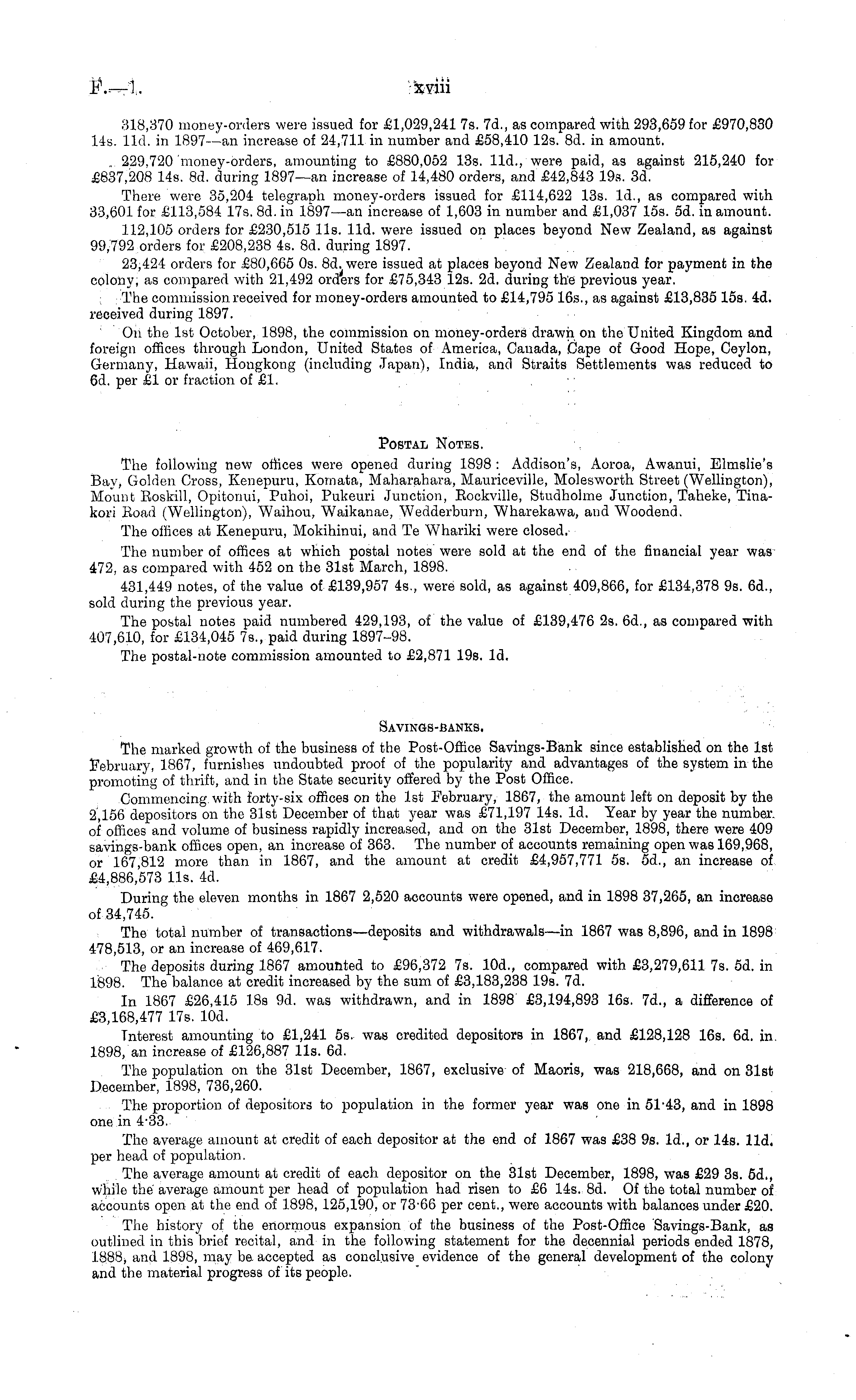 318,370 money-orders were issued for £1,029,241 7s. 7d., as compared with 293,659 for £970,830 14s. lid. in 1897 —an increase of 24,711 in number and £58,410 12s. Bd. in amount. ~ 229,720 money-orders, amounting to £880.052 13s. lid., were paid, as against 215,240 for £837,208 14s. Bd. during 1897—an increase of 14,480 orders, and £42,843 19s. 3d. There were 35,204 telegraph money-orders issued for £114,622 13s. Id., as compared with 33,601 for £113,584 17s. Bd. in 1897 —an increase of 1,603 in number and £1,037 15s. sd. in amount. 112,105 orders for £230,515 lis. lid. were issued on places beyond New Zealand, as against 99,792 orders for £208,238 4s. Bd. during 1897. 23,424 orders for £80,665 os. Bd. were issued at places beyond New Zealand for payment in the colony, as compared with 21,492 orders for £75,343 12s. 2d. during the previous year. The commission received for money-orders amounted to £14,795 165., as against £13,835 15s. 4d. received during 1897. On the Ist October, 1898, the commission on money-orders drawn on the United Kingdom and foreign offices through London, United States of America, Canada, Cape of Good Hope, Ceylon, Germany, Hawaii, Hongkong (including Japan), India, and Straits Settlements was reduced to 6d. per £1 or fraction of £1. Postal Notes. The following new offices were opened during 1898 : Addison's, Aoroa, Awanui, Elmslie's Bay, Golden Cross, Kenepuru, Komata, Maharahara, Mauriceville, Molesworth Street (Wellington), Mount Eoskill, Opitonui, Puhoi, Pukeuri Junction, Eockville, Studholme Junction, Taheke, Tinakori Eoad (Wellington), Waihou, Waikanae, Wedderburn, Wharekawa, and Woodend. The offices at Kenepuru, Mokihinui, and Te Whariki were closed. The number of offices at which postal notes were sold at the end of the financial year was 472, as compared with 452 on the 31st March, 1898. 431,449 notes, of the value of £139,957 45., were sold, as against 409,866, for £134,378 9s. 6d., sold during the previous year. The postal notes paid numbered 429,193, of the value of £139,476 2s. 6d., as compared with 407,610, for £134,045 75., paid during 1897-98. The postal-note commission amounted to £2,871 19s. Id. Savings-banks. The marked growth of the business of the Post-Office Savings-Bank since established on the Ist February, 1867, furnishes undoubted proof of the popularity and advantages of the system in the promoting of thrift, and in the State security offered by the Post Office. Commencing with forty-six offices on the Ist February, 1867, the amount left on deposit by the 2,156 depositors on the 31st December of that year was £71,197 14s. Id. Year by year the number, of offices and volume of business rapidly increased, and on the 31st December, 1898, there were 409 savings-bank offices open, an increase of 363. The number of accounts remaining open was 169,968, or 167,812 more than in 1867, and the amount at credit £4,957,771 ss. 5d., an increase of £4,886,573 lis. 4d. During the eleven months in 1867 2,520 accounts were opened, and in 1898 37,265, an increase of 34,745. The total number of transactions —deposits and withdrawals—in 1867 was 8,896, and in 1898 478,513, or an increase of 469,617. The deposits during 1867 amounted to £96,372 7s. 10d., compared with £3,279,611 7s. sd. in 1898. The balance at credit increased by the sum of £3,183,238 19s. 7d. In 1867 £26,415 18s 9d. was withdrawn, and in 1898 £3,194,893 16s. 7d., a difference of £3,168,477 17s. lOd. Interest amounting to £1,241 ss. was credited depositors in 1867, and £128,128 16s. 6d. in 1898, an increase of £126,887 lis. 6d. The population on the 31st December, 1867, exclusive of Maoris, was 218,668, and on 31st December, 1898, 736,260. The proportion of depositors to population in the former year was one in 51-43, and in 1898 one in 4-33. The average amount at credit of each depositor at the end of 1867 was £38 9s. Id., or 14s. lid. per head of population. . The average amount at credit of each depositor on the 31st December, 1898, was £29 3s. 6d., while the average amount per head of population had risen to £6 14s. Bd. Of the total number of accounts open at the end of 1898, 125,190, or 73-66 per cent., were accounts with balances under £20. The history of the enormous expansion of the business of the Post-Office Savings-Bank, as outlined in this brief recital, and in the following statement for the decennial periods ended 1878, 1888, and 1898, may be accepted as conclusive evidence of the general development of the colony and the material progress of its people.