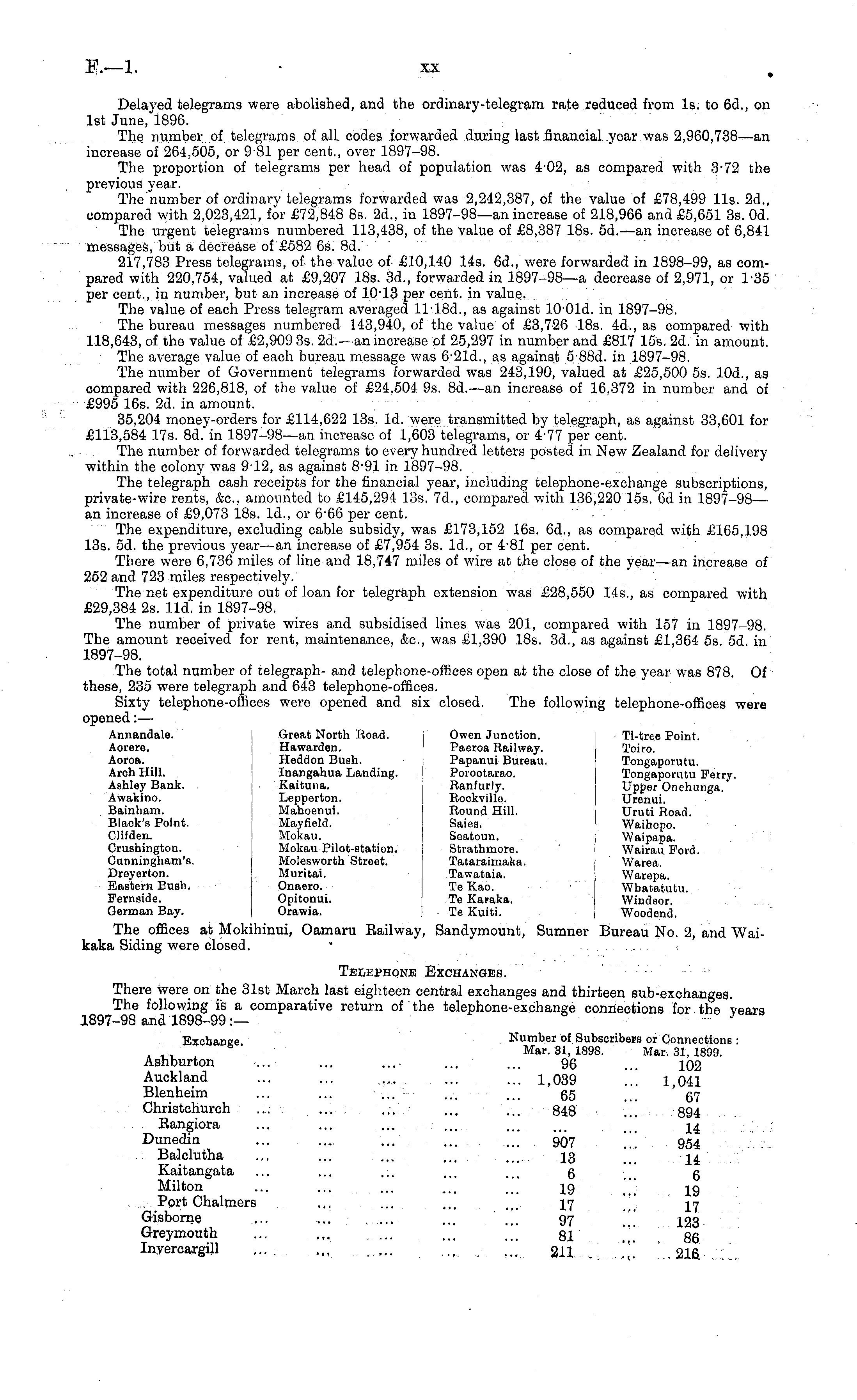 Delayed telegrams were abolished, and the ordinary-telegram rate reduced from Is. to 6d., on Ist June, 1896. The number of telegrams of all codes forwarded during last financial year was 2,960,738 —an increase of 264,505, or 9-81 per cent., over 1897-98. The proportion of telegrams per head of population was 4-02, as compared with 3-72 the previous year. The number of ordinary telegrams forwarded was 2,242,387, of the value of £78,499 lis. 2d., compared with 2,023,421, for £72,848 Bs. 2d., in 1897-98—an increase of 218,966 and £5,651 3s. Od. The urgent telegrams numbered 113,438, of the value of £8,387 18s. sd.—an increase of 6,841 messages, but a decrease of £582 6s. Bd. 217,783 Press telegrams, of the value of £10,140 14s. 6d., were forwarded in 1898-99, as compared with 220,754, valued at £9,207 18s. 3d., forwarded in 1897-98—a decrease of 2,971, or 1-35 per cent., in number, but an increase of 10-13 per cent, in value. The value of each Press telegram averaged 11-18 d., as against 10-o.ld. in 1897-98. The bureau messages numbered 143,940, of the value of £3,726 18s. 4d., as compared with 118,643, of the value of £2,909 3s. 2d.—an increase of 25,297 in number and £817 15s. 2d. in amount. The average value of each bureau message was 6-21 d., as against 5-88 d. in 1897-98. The number of Government telegrams forwarded was 243,190, valued at £25,500 ss. 10d., as compared with 226,818, of the value of £24,504 9s. Bd.—an increase of 16,372 in number and of £995 16s. 2d. in amount. 35,204 money-orders for £114,622 13s. Id. were transmitted by telegraph, as against 33,601 for £113,584 17s. Bd. in 1897-98—an increase of 1,603 telegrams, or 4-77 per cent. The number of forwarded telegrams to every hundred letters posted in New Zealand for delivery within the colony was 9-12, as against 8-91 in 1897-98. The telegraph cash receipts for the financial year, including telephone-exchange subscriptions, private-wire rents, &c, amounted to £145,294 13s. 7d., compared with 136,220 15s. 6d in 1897-98— an increase of £9,073 18s. Id., or 6-66 per cent. The expenditure, excluding cable subsidy, was £173,152 16s. 6d., as compared with £165,198 13s. sd. the previous year—an increase of £7,954 3s. Id., or 4-81 per cent. There were 6,736 miles of line and 18,747 miles of wire at the close of the year—an increase of 252 and 723 miles respectively. The net expenditure out of loan for telegraph extension was £28,550 145., as compared with £29,384 2s. lid. in 1897-98. The number of private wires and subsidised lines was 201, compared with 157 in 1897-98. The amount received for rent, maintenance, &c, was £1,390 18s. 3d., as against £1,364 ss. sd. in 1897-98. The total number of telegraph- and telephone-offices open at the close of the year was 878. Of these, 235 were telegraph and 643 telephone-offices. Sixty telephone-offices were opened and six closed. The following telephone-offices were opened:— Annandale. Great North Road. Owen Junotion. Ti-tree Point. Aorere. Hawarden. Paeroa Railway. Toiro. Aoroa. Heddon Bu9h. Papanui Bureau. Tongaporutu. Arch Hill. Inangahua Landing. Porootarao. Tongaporutu Perry. Ashley Bank. Kaituna. Ranfurly. Upper Onehunga. Awakino. Lopperton. Rockville. Urenui. Bainham. Mahoenui. Round Hill. Uruti Road. Black's Point. Mayfield. Saies. Waihopo. Clifden. Mokau. Seatoun. Waipapa. Crushington. Mokau Pilot-statioD. Strathmore. Wairau Pord. Cunningham's. Molesworth Street. Tataraimaka. Warea. Dreyerton. Muritai. Tawataia. Warepa. Eastern Bush. Onaero. Te Kao. Whatatutu. Pernside. Opitonui. Te Karaka. Windsor. German Bay. Orawia. Te Kuiti. Woodend. The offices at Mokihinui, Oamaru Railway, Sandymount, Sumner Bureau No. 2, and Waikaka Siding were closed. Telephone Exchanges. There were on the 31st March last eighteen central exchanges and thirteen sub-exchanges. The following is a comparative return of the telephone-exchange connections for the years 1897-98 and 1898-99 :— y Exchange Number of Subscribers or Connections : , •,., Mar. 31, 1898. Mar. 31, 1899. Ashburton ... ... .... ... ... 96 102 Auckland ... ... ... ... ... i ; 039 ..'. 1,041 Blenheim ... ... • ... - ... ... 65 67 Christchurch ...... ... ... ... 848 ... 894 Bangiora ... ... ... ... ... ... 14 Dunedin ... ... ... ... 907 '" 954 Balclutha ... ... ... ... ... 13 14 Kaitangata ... ... ... ... ... 6 6 Milton ... ........ ... ... 19 19 ... Port Chalmers ... ... ... ... 17 17 Gisborne ... ... ... ... 97 123 Greymouth ... ... ... ... ... gl 86 Invercargill ... ~, ... ... , .'.'.' 211 '.['. 216. -_ ;'_.,