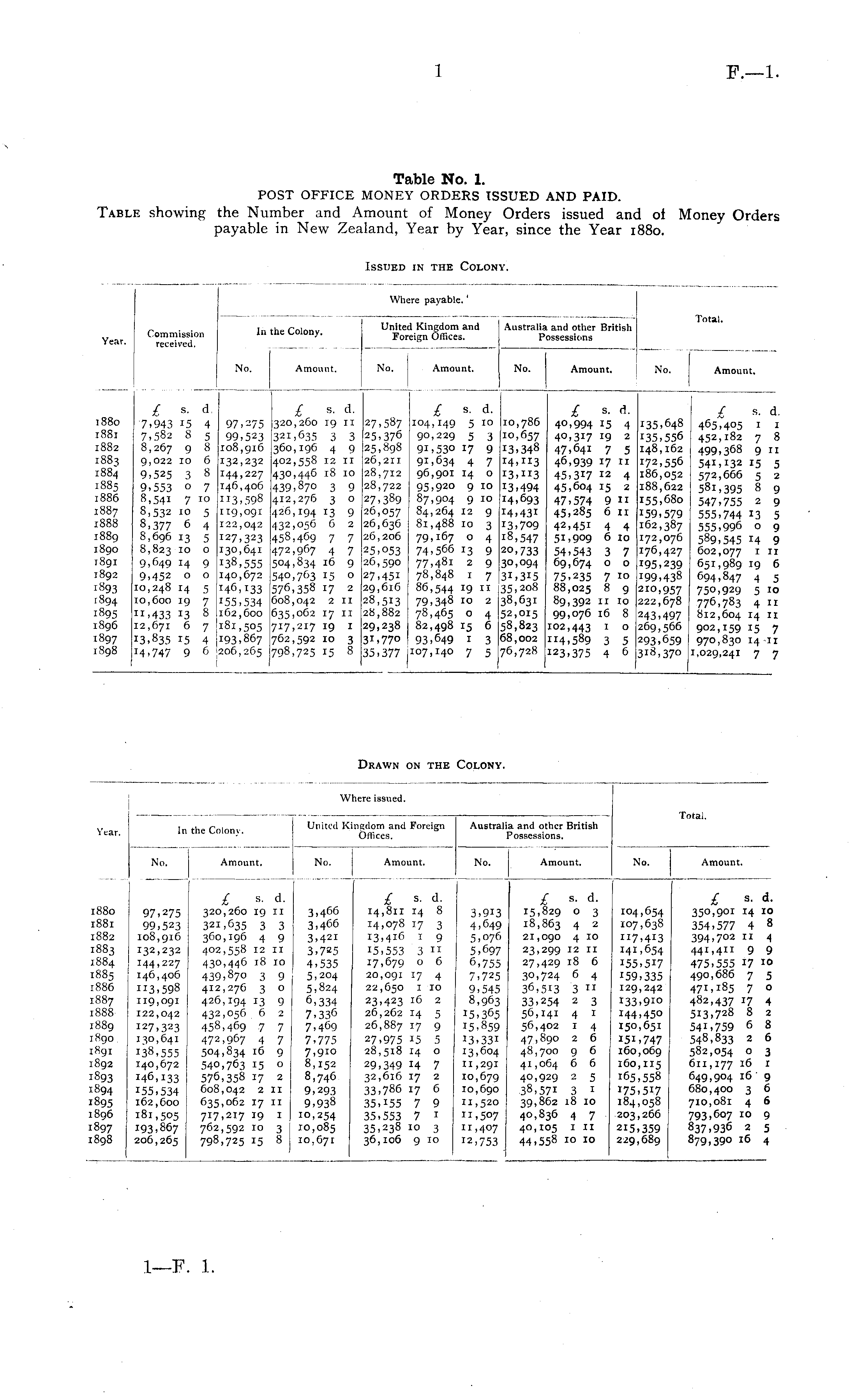 Table No. 1. POST OFFICE MONEY ORDERS ISSUED AND PAID. Table showing the Number and Amount of Money Orders issued and of Money Orders payable in New Zealand, Year by Year, since the Year 1880. Issued in the Colony.