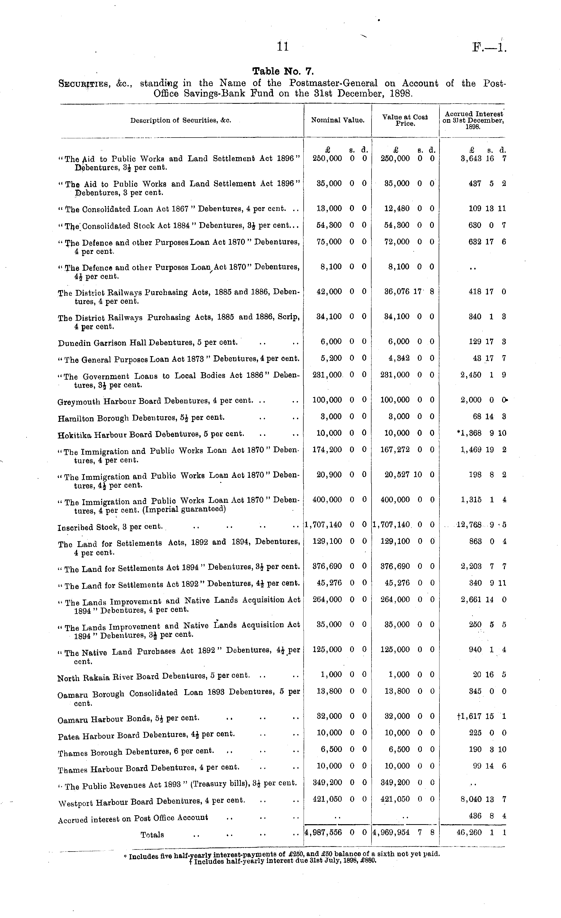 Description of Securities, Ac. Nominal Value. Value at Cost Price. Accrued Interest on 31 st December, 1898. "The Aid to Public Works and Land Settlement Act 1896" Debentures, 3J per cent. £ s. d. 250,000 0 0 £ s. d. 250,000 0 0 £ s. d. 3,643 16 7 " The Aid to Public Works and Land Settlement Act 1896" Debentures, 3 per cent. 35,000 0 0 35,000 0 0 437 5 2 " The Consolidated Loan Act 1867 " Debentures, 4 per cent. .. 13,000 0 0 12,480 0 0 109 13 11 " The Consolidated Stock Act 1884 " Debentures, 3J per cent... 54,300 0 0 54,300 0 0 630 0 7 " The Defence and other Purposes Loan Act 1870 " Debentures, 4 per cent. 75,000 0 0 72,000 0 0 632 17 6 " The Defence and other Purposes 1870" Debentures, H per cent. 8,100 0 0 8,100 0 0 The District Railways Purchasing Acts, 1885 and 1886, Debentures, 4 per cent. 42,000 0 0 36,076 17 8 418 17 0 The District Railways Purchasing Acts, 1885 and 1886, Scrip, 4 per cent. 34,100 0 0 34,100 0 0 340 1 3 Dunedin Garrison Hall Debentures, 5 per cent. 6,000 0 0 6,000 0 0 129 17 3 " The General Purposes Loan Act 1873 " Debentures, 4 per oent. 5,200 0 0 4,342 0 0 43 17 7 "The Government Loans to Looal Bodies Act 1886" Debentures, 3J per cent. 231,000 0 0 231,000 0 0 2,450 1 9 Greyrnouth Harbour Board Debentures, 4 per oent. 100,000 0 0 100,000 0 0 2,000 0 0Hamilton Borough Debentures, 5£ per cent. 3,000 0 0 3,000 0 0 68 14 3 Hokitika Harbour Board Debentures, 5 per cent. 10,000 0 0 10,000 0 0 *1,368 9 10 "The Immigration and Public Works Loan Aot 1870 " Debentures, 4 per cent. 174,200 0 0 167,272 0 0 1,469 19 2 " The Immigration and Public Works Loan Act 1870 " Debentures, 4J per cent. 20,900 0 0 20,527 10 0 198 8 2 " The Immigration and Publio Works Loan Act 1870 " Debentures, 4 per cent. (Imperial guaranteed) 400,000 0 0 400,000 0 0 1,315 1 4 Inscribed Stook, 3 per cent. 1,707,140 O 0 1,707,140, 0 0 12,768 9 -5 The Land for Settlements Aots, 1892 and 1894, Debentures, 4 per cent. 129,100 0 0 129,100 0 0 863 0 4 " The Land for Settlements Aot 1894 " Debentures, 3f per cent. 376,690 0 0 376,690 0 0 2,203 7 7 " The Land for Settlements Act 1892 " Debentures, 4J per cent. 45,276 0 0 45,276 0 0 340 9 11 " The Lands Improvement and Native Lands Acquisition Act 1894 " Debentures, 4 per oent. 264,000 0 0 264,000 0 0 2,661 14 0 " The Lands Improvement and Native Lands Acquisition Act 1894 " Debentures, 3J per cent. 35,000 0 0 35,000 0 0 250 5 5 "The Native Land Purchases Act 1892" Debentures, per cent. 125,000 0 0 125,000 0 0 940 1 4 North Rakaia Rivor Board Debentures, 5 per cent. 1,000 0 0 1,000 0 0 20 16 5 Oamaru Borough Consolidated Loan 1893 Debentures, 5 per cent. 13,800 0 0 13,800 0 0 345 0 0 Oamaru Harbour Bonds, 54 per cent. 32,000 0 0 32,000 O 0 |1,617 15 1 Patea Harbour Board Debentures, 4£ per cent. 10,000 0 0 10,000 0 0 225 0 0 Thames Borough Debentures, 6 per oent. 6,500 0 0 6,500 0 0 190 3 10 Thames Harbour Board Debentures, 4 per cent. 10,000 0 0 10,000 0 0 99 14 6 '■ The Public Revenues Act 1893 " (Treasury bills), SI per ceut. 349,200 0 0 349,200 0 0 Westport Harbour Board Debentures, 4 per cent. 421,050 0 0 421,050 0 0 8,040 13 7 Accrued interest on Post Office Account 436 8 4 Totals 14,987,556 0 0 |4,969,954 7 8 46,260 1 1 * Includes five half-yearly interest-payments of £250, f Includes half-yearly interest du , and £50 balance of : to 31st July, 1898, £881 i sixth not yet paid ),
