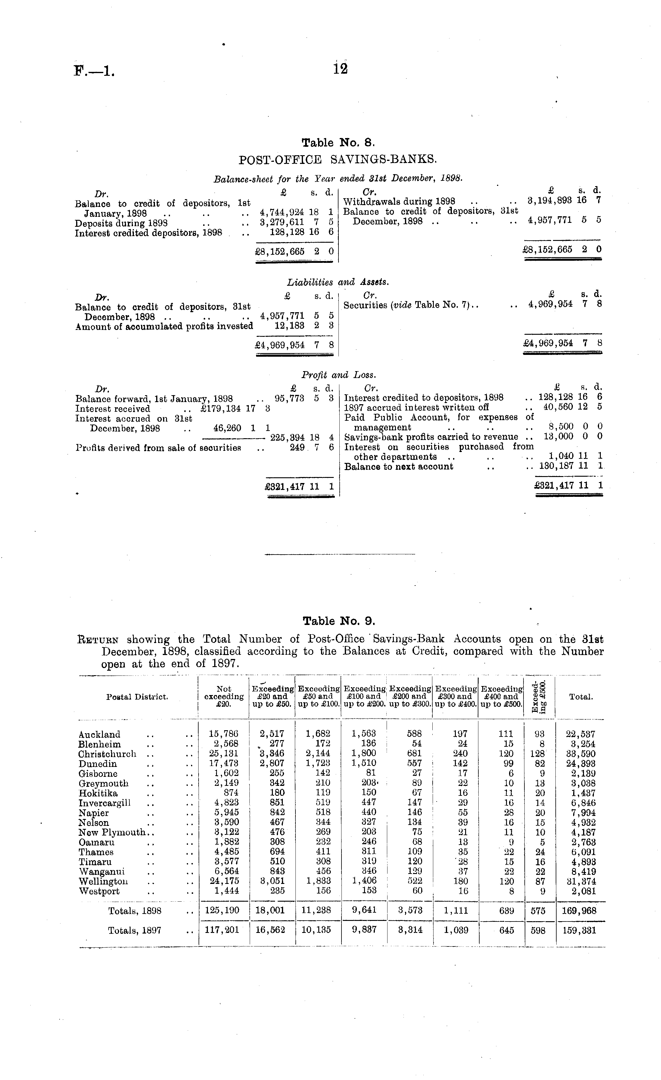 Balance-sheet for the Year ended 31st December, 1898. Dr. £ s. d. I Balance to credit of depositors, 1st January, 1898 4,744,924 18 1 Deposits during 1898 .. .. 3,279,611 7 5 Interest credited depositors, 1898 .. 128,128 16 6 Cr. £ e. d. Withdrawals during 1898 .. .. 3,194,893 16 7 Balance to credit of depositors, 31st December, 1898 .. .. .. 4,957,771 5 5 £8,152,665 2 0 £8,152,665 2 0 Liabilities < Dr. £ s. d. Balance to credit of depositors, 31st December, 1898 .. .. .. 4,957,771 5 5 Amount of accumulated profits invested 12,183 2 3 and Assets. ] Or. & s. d. Securities (vide Table No. 7).. .. 4,969,954 7 8 £4,969,954 7 8 £4,969,954 7 8 Profit ai rid Loss. Dr. & s. d. Balance forward, 1st January, 1898 .. 95,773 5 3 Interest received .. £179,134 17 8 Interest accrued on 31st December, 1898 .. 46,260 1 1 225,394 18 4 Profits derived from sale of securities .. 249 7 6 Cr. £ s. d. Interest credited to depositors, 1898 ..128,128 16 6 1897 accrued interest written off .. 40,560 12 5 Paid Public Account, for expenses of management .. .. .. 8,500 0 0 Savings-bank profits carried to revenue .. 13,000 0 0 Interest on securities purchased from other departments .. .. .. 1,040 11 1 Balance to next account .. .. 130,187 11 1 £321,417 11 1 £321,417 11 1