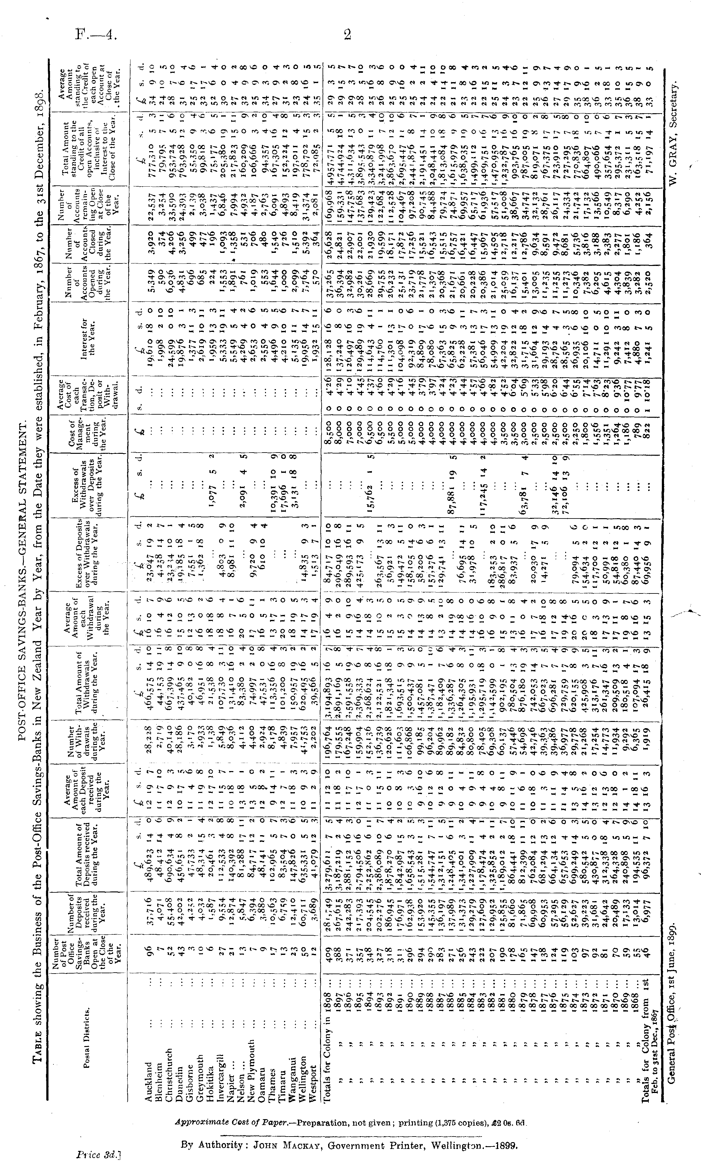 Postal Districts. Number of Post Office SavingsBanks Open at the Close of the Year. Number of Deposits received iluring the Year. Total Amount of Deposits received during the Year. Average Amount of each Deposit received during the Year. Number of Withdrawals during the Year. Average .0 . , . . t Amount of Total Amount of . Withdrawals unSSl „, .. . \. Wirnarawa during the Year. , & during the Year. Excess of Deposits over Withdrawals during the Year. Excess of Withdrawals over Deposits during the Year. Cost of Management during the Year. Average Cost of each Transaction, Deposit or Withdrawal. Interest for the Year. Number of Accounts Opened during the Year. Number of Accounts Closed during the Year. Number of Accounts remaining Open at Close of the Year. Total Amount standing to the Credit of all open Accounts, inclusive 01 Interest to the Close of the Year. Average Amount standing t ( > the Credit of each open Account at Close of . the Year. Auckland Blenheim Christchurch Dunedin Gisborne Greymouth Hokitika Invercargill Napier ... Nelson ... New Plymouth Oamaru Thames Timaru Wanganui Wellington Westport 9 6 10 6 27 21 37,716 489,623 14 O 4,071 48.412 14 6 55,408 690,634 4 9 42,002 456,651 8 2 4. 2 . 2 47.733 2 ' 4,032 48,314 <5 4 1,587 20,461 3 2 9,554 112,533 4 8 12,874 140,392 8 8 5,847 81,288 17 11 6,394 84,717 12 2 3,880 48,141 i 1 o 10,563 102,965 5 7 6,7.9 83,504 7 3 12,410 147,826 o 6 60,711 635,331 5 5 3,689 41,079 12 3 £ 5. d. 12 19 7 28,228 11 1710 2,7 I 9 12 9 3 40,140 10 17 5 28,186 11 4 6 3,1 70 11 19 8 2,933 12 17 10 1,138 11 15 7 I 5,849 10 18 1 8,036 1318 1 4, 1 1 2 '3 5 ° j 4,400 12 8 2 2,924 9 14 11 8,178 12 7 1 4,839 " '8 3 j 7,957 10 9 3 4',753 11 2 9 I 2,202 466,575 14 10 44. 'S3 "9 " 667,399 14 8 437,465 9 10 40,182 o 8 16 8 21,538 8 4 107,730 3 " 131,410 16 10 83,380 2 4 74,997 2 10 47,53' o 8 "3,3s6 16 4 101,200 8 3 150,957 '9 2 620,495 16 2 39,566 5 2 16 io 7 1649 1612 6 '5 10 5 1213 6 1602 18 18 6 18 8 4 16 7 1 20 5 6 17 011 16 5 1 '3 '7 3 20 11 o 18 19 5 '4 '7 3 17 19 4 £ s. d. 23,047 19 2 4,258 14 7 23,2 H 10 1 19,185 18 4 7.55' ' 5 . 1,362 18 8 4,803 o 9 8,981 11 10 £ a. d. ... ... ... 1,077 5 2 £ s. d. £ a. d. 19,610 18 o 1,998 2 10 24,599 o 10 19,876 3 1 ',377 " 3 2,619 IO '■ ',959 '3 3 5,333 19 " 1 5.549 5 4 4,269 4 2 2,653 ° 6 2.550 4 5 4,496 9 5 4,210 10 6 5,i35 " 7 19,956 14 7 i,932 15 " 5,349 590 6,036 4,831 696 685 224 '.553 1,891 761 1,019 553 1,644 1,000 2,099 7,764 57o 3,920 374 4,206 3,256 499 477 196 • 1,358 53i 706 480 1.540 726 i,5io 5.392 364 22,537 3,254 33,590 24.393 2,139 3,038 1,437 6,846 7,994 4,93 2 4,187 2,763 6,091 4,893 8,419 31,374 2,081 777,3'o 5 3 79,795 7 ' ' 953,724 5 6 763,928 12 10 55,35° 9 4 99,818 3 6 75,'77 & 5 205,380 19 1 217,823 15 11 160,209 ° 9 106,666 3 2 94,357 4 10 167,305 16 4 152,224 12 8 197,011 4 5 778,702 15 3 72,085 2 3 34 9 10 24 10 5 28 710 3' 64 25 17 6 32 17 1 52 6 4 30 o o 27 4 2 32 9 8 25 9 6 34 3 o 27 9 4 3i 2 3 23 8 o 24 16 5 35 1 5 ... 7 9 ■3 23 5° 1 2 9,720 9 4 610 10 4 2,091 4 5 10,391 10 9 17,696 1 o 3,131 18 8 ■4,8.35 9 3 ■,5'3 7 ' 1 Totals for Colony in 1898 ... 1897 ... 1896 ... 1895 ■■• .894... 1893 ■•■ „ „ 1892 ... 1891 ... 1890 ... 1889 ... 1888 ... 1887 ... 1886 ... .885 ... 1884 ... 1883 ... 1882 ... 1881 ... 1880 ... 1879 ■.. 1878 ... 1877 ... 1876 ... '875 - 1874 ... 1873 - „ 1872 ... 1871 ... „ ,, 1870 ... 1869 ... 1868 ... Totals for Colony from 1st Feb. to 31st Dec, 1867 409 388 37' 357 348 327 3'8 3" 296 294 290 283 271 256 243 222 207 190 178 '65 •47 138 124 119 103 97 92 81 70 59 55 46 281,749 267,615 242,283 2 17,393 204,545 202,276 186,945 176,971 162,938 153.920 '45,355 136,197 1.37,989 '31,373 129,279 127,609 129,952 '25,855 81,660 71,865 69,908 60,953 57,295 56,129 52,627 39,223 31,681 24,642 20,489 i7>'33 13.014 6,977 3>279.6n. 7 5 3,187,219 2 4 2,881,152 16 3 2,794,506 16 o 2,252,862 6 11 2,386,089 10 7 1,878,270 6 4 1,842,987 15 2 '.6s8.S43 3 5 1,515,281 11 3 '.544,747 7 " 1,248,405 6 11 1,341,001 3 2 1,227,909 11 4 1,178,474 4 1 '.325,852 2 11 1,189,012 2 7 864,441 18 10 812,399 11 11 762,084 12 o 681,294 13 2 664,134 12 6 657,653 4 o 699,249 14 3 580,542 5 5 430,877 o o 312,338 18 4 264,328 5 7 240,898 5 9 '94.535 " 6 96,372 7 10 II 12 IO II l8 2 11 17 IO 1217 I II 03 II 15 11 IO Oil 10 8 3 10 5 6 91610 1012 6 912 8 9 011 104 1 9 9" 9 4 8 10 4 o 9 811 10 11 9 n 6 1 10 18 o 11 36 1 1 11 9 11 14 4 '3 5 8 14 16 2 13 12 o 12 13 6 12 18 O 14 I 2 14 18 II '3 l6 3 196,764 ■79,555 167,248 '59,9°4 152,136 '.36,739 120,628 111,603 106,868 99,185 96,204 89,962 89,182 84,832 80,800 78,405 69,308 60,137 57,446 54,698 42,746 39,36.3 39,486 36,977 29,778 21,268 17,254 •4,773 ",934 9,292 6,365 i>9i9 |3,I94,893 16 7 2,891,169 5 8 2,59', 558 19 4 2 ,369.333 6 7 2,268,624 8 4 2,122,521 16 8 1,821,348 18 1 ' ,693,5 '5 9 3 ',500,437 9 5 1,457,081 5 o 1,387,471 1 10 1,182,409 7 6 1,336,287 6 4 1,264,305 8 3 1,195,931 o 11 1,295,719 '8 3 1,142,599 o 1 902,195 1 8 780,504 13 4 876,180 19 3 742,053 14 3 667,023 7 5 696,281 7 4 729,759 '7 9 620,155 8 9 425,908 3 5 3'3,i7 6 7 " 261,347 '6 3 209,509 13 2 180,518 4 1 107.094 17 3 26,415 18 9 16 4 9 1620 15 9 10 14 16 4 '4 '8 3 15 10 5 15 2 o '5 3 5 14 o 9 '4 '3 9 '4 8 5 13 210 1419 8 14 18 o 1416 o 16 10 6 16 9 8 15 o 1 13 11 8 16 o 4 '7 7 2 16 18 10 17 12 8 19 14 8 20 16 5 20 c 5 18 3 o '7 '3 9 17 11 1 19 8 7 16 16 6 84,717 10 10 296,049 16 8 289,593 16 11 425,173 9 5 263,567 13 11 56,921 8 3 '49.472 5 " 158,105 .4 o 58,200 6 3 157,276 6 1 129,741 13 11 76,695 14 11 31,978 10 5 183,253 2 10 286,817 o " 8.3,937 5 6 ... ■5,762 1 5 87,881 19 5 ... 117,245 14 2 8,500 8,000 7,000 7,000 6,500 6,500 So 00 5,000 5,000 4,000 4,000 4,000 4,000 4,000 4,000 4,000 4,000 3,5°° 3,5oo 3,ooo 2,500 2,500 2,500 2,500 2,250 1,800 ■>55 6 1.35 1 1.264 1,186 789 822 o 4-26 o 4-29 0 4-10 o 4'45 O 4 - 37 o 4-60 o 4'29 o 4' 16 o 4'45 o 379 0 3'97 o 4'24 o 4'2.3 o 4'44 o 4*57 o 466 o 4-82 o 4'52 o 6*04 o 5-69 o S'33 o 